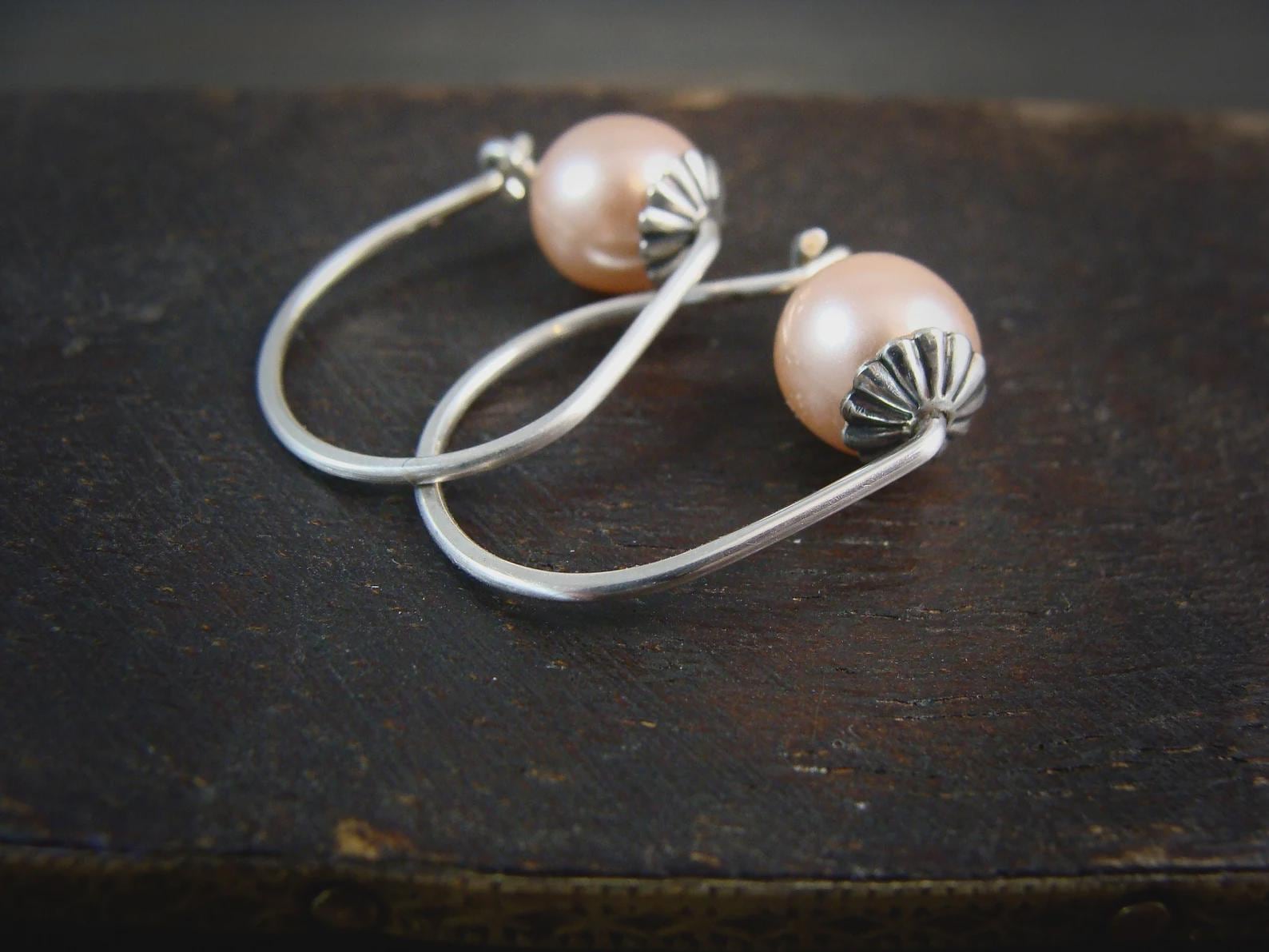 These white Swarovski pearls have been merged with a tiny flower like sterling cap. The sterling caps have been given a dark patina to add that time worn look. These simple, elegant earrings are great for everyday.