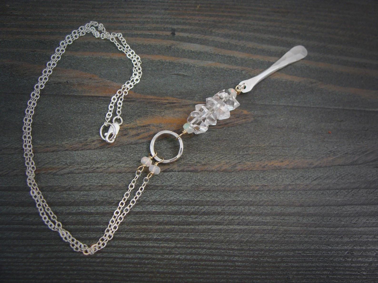 These solid sterling silver bar earrings have been hammered to give a bold textured look. The texture is made to catch and reflect the light. The bar sway from pretty Herkimer diamonds that have been strung on 14k gold filled wire. The earrings sway from sterling silver ear wires. Coordinating pendant can be found in my shop.