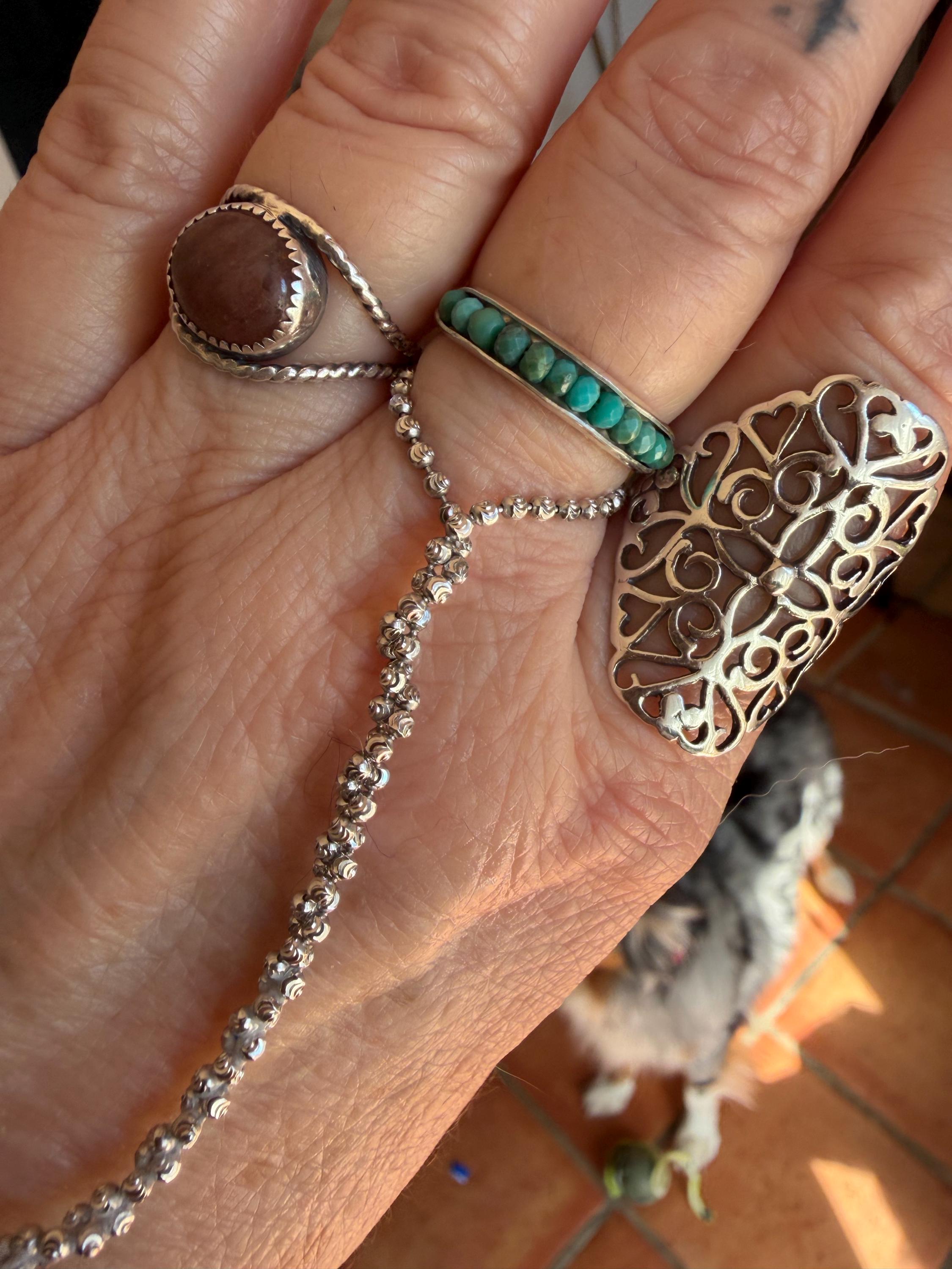 This handmade turquoise stacking ring is crafted in solid sterling silver and features vibrant, natural turquoise gemstones. The bright blue-green hues bring a pop of color to your jewelry collection, perfect for boho, minimalist, or everyday wear.
