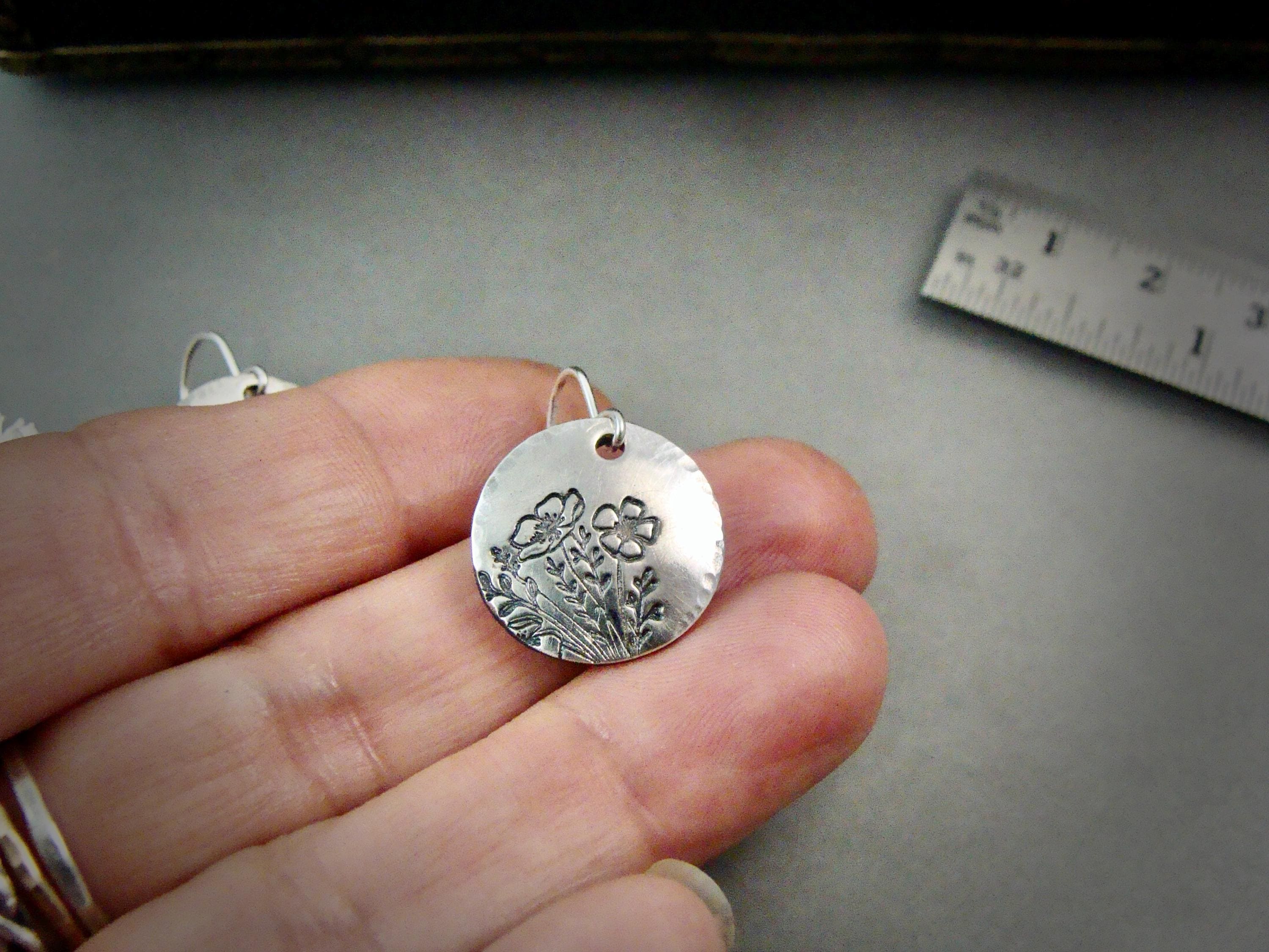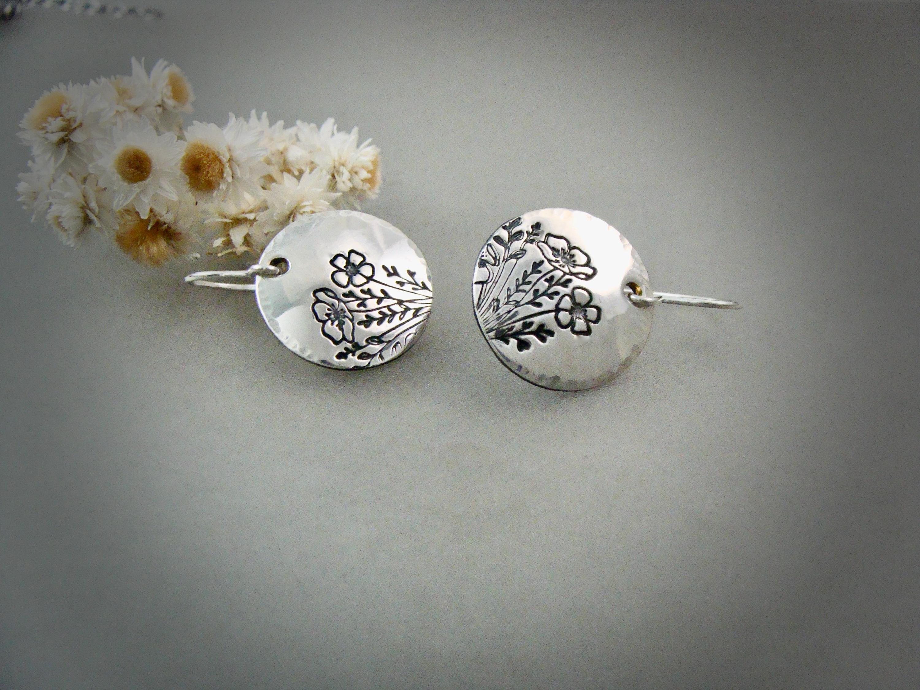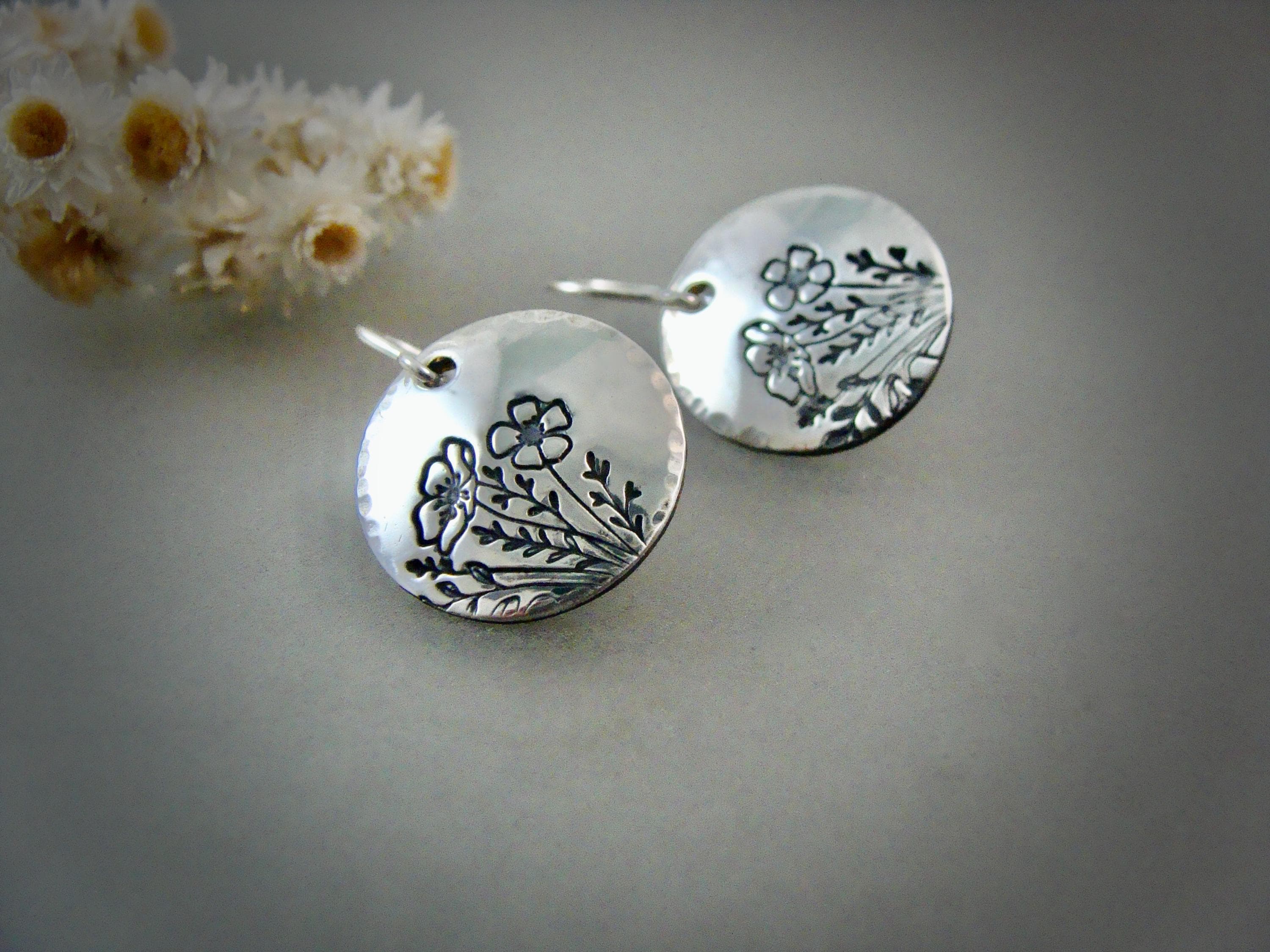 These sterling silver wildflower disc earrings feature a delicate imprinted floral design, capturing a whimsical cottage core aesthetic. Handcrafted from solid 925 sterling silver, each disc is gently stamped with floral motifs and shaped for subtle movement and shine. Coordinating pendant sold separately.