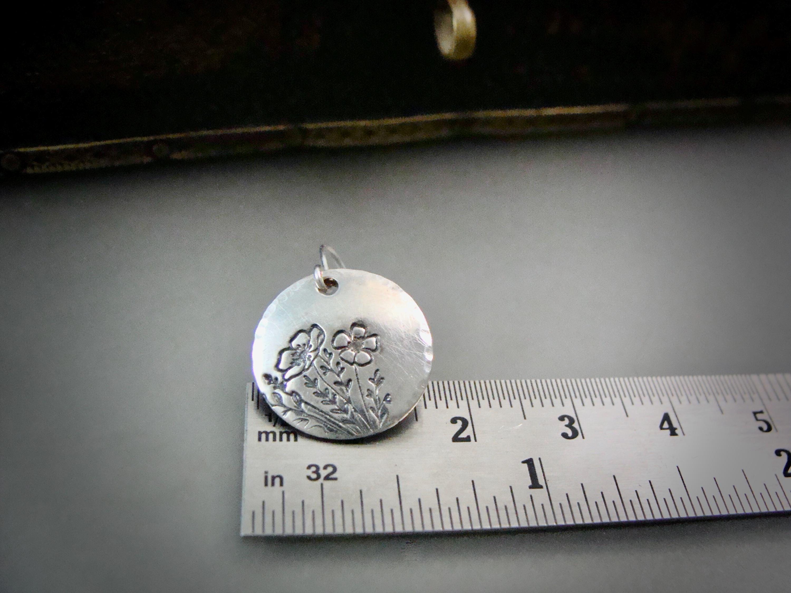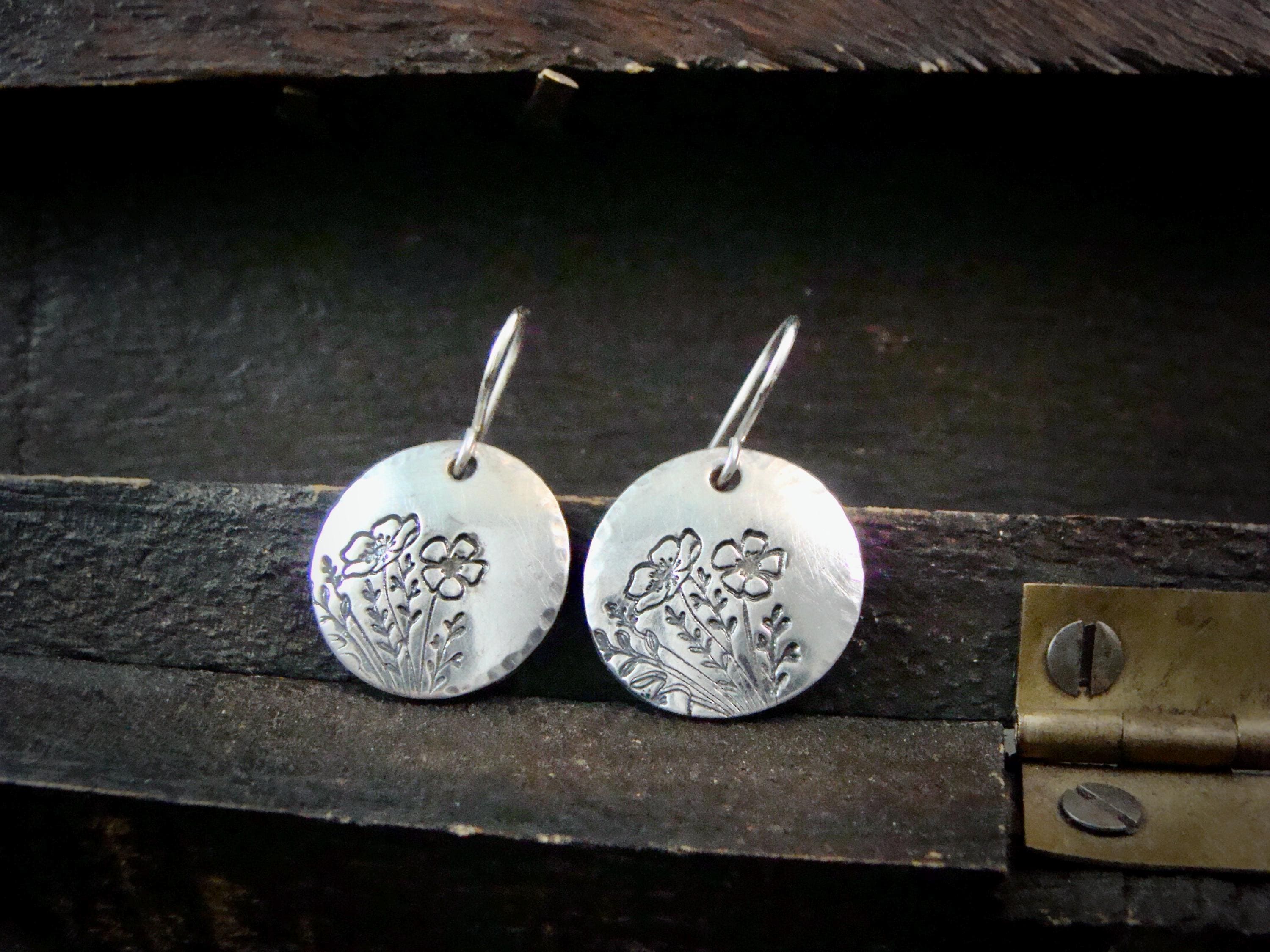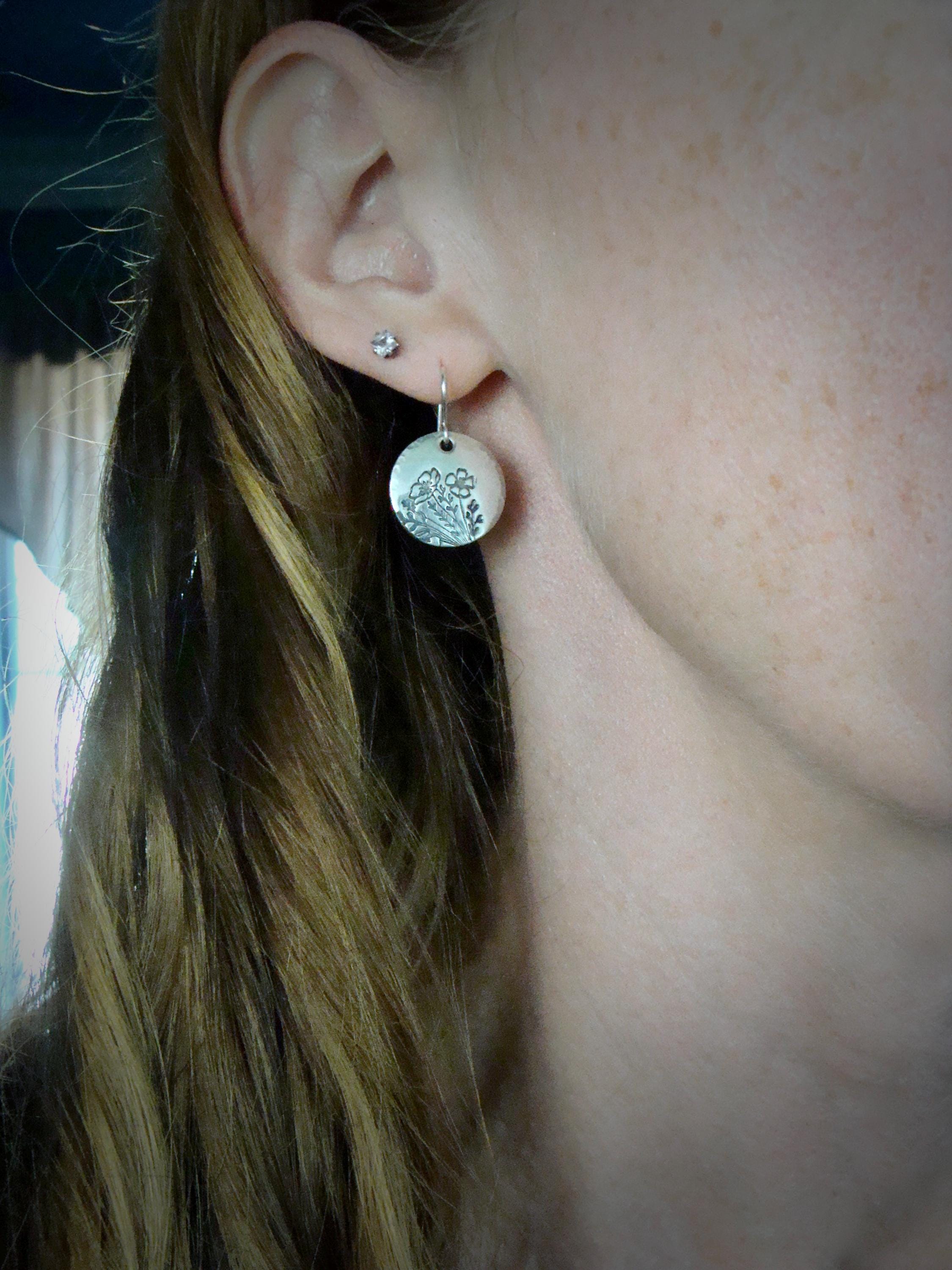 These sterling silver wildflower disc earrings feature a delicate imprinted floral design, capturing a whimsical cottage core aesthetic. Handcrafted from solid 925 sterling silver, each disc is gently stamped with floral motifs and shaped for subtle movement and shine. Coordinating pendant sold separately.