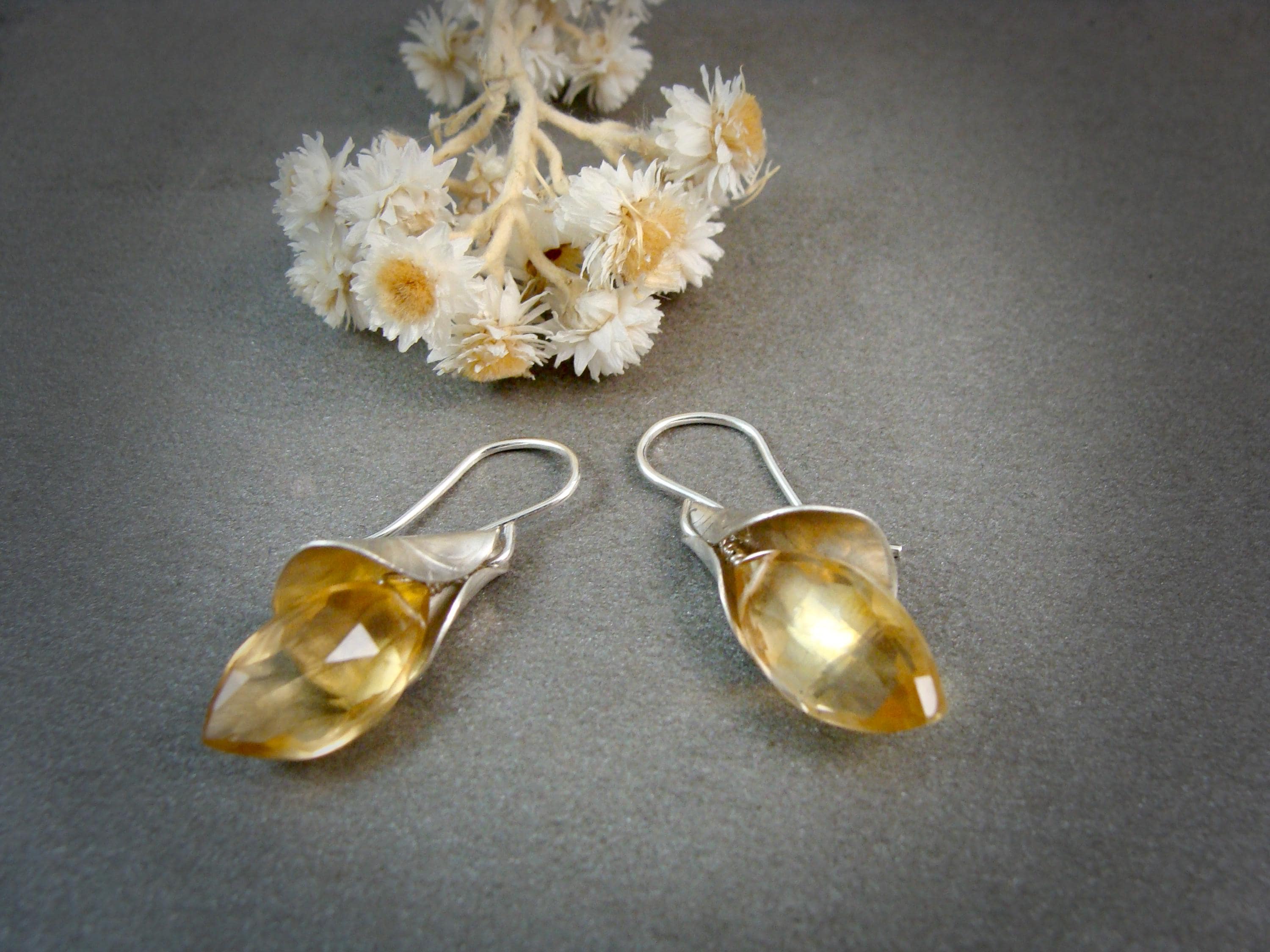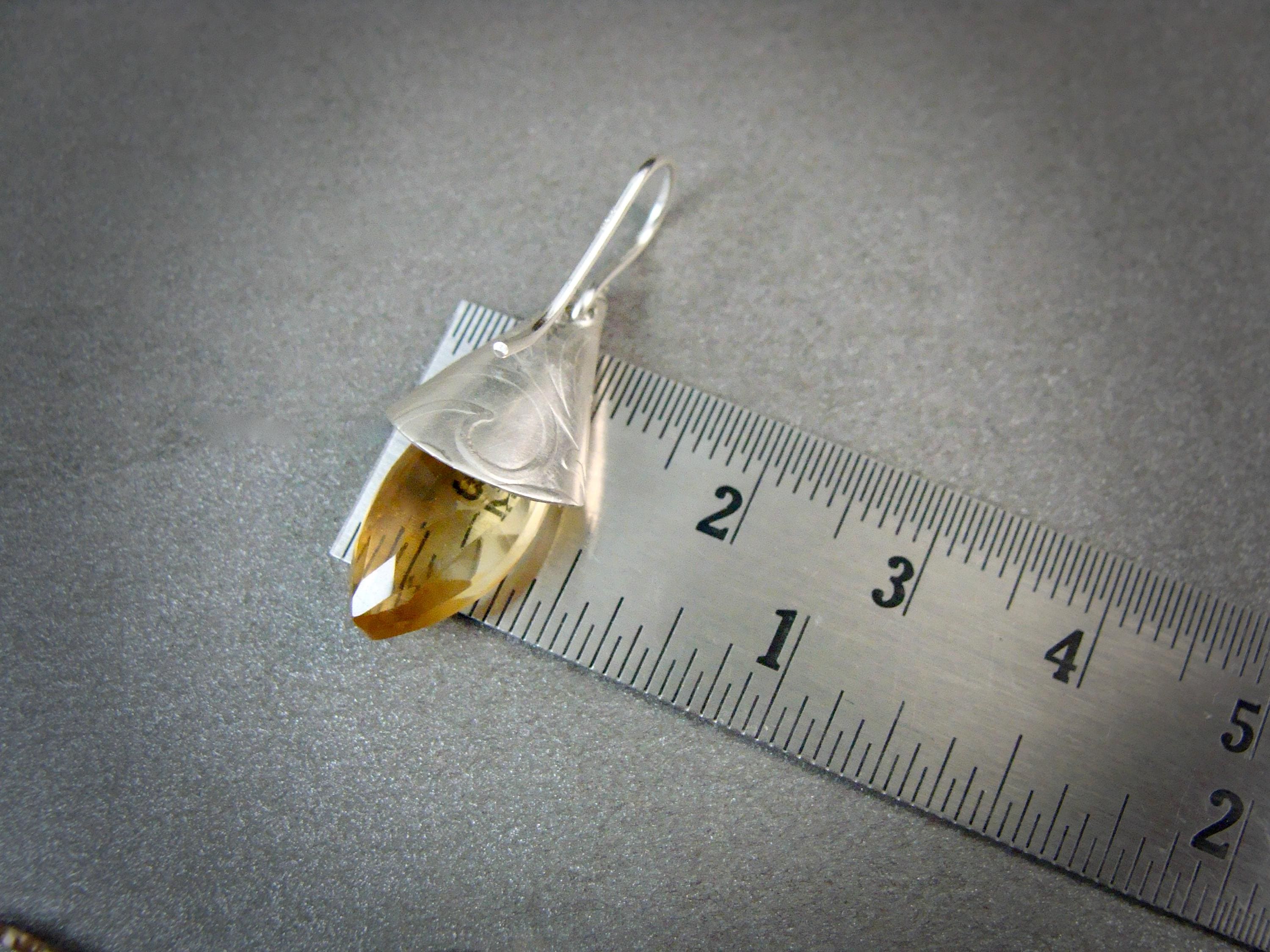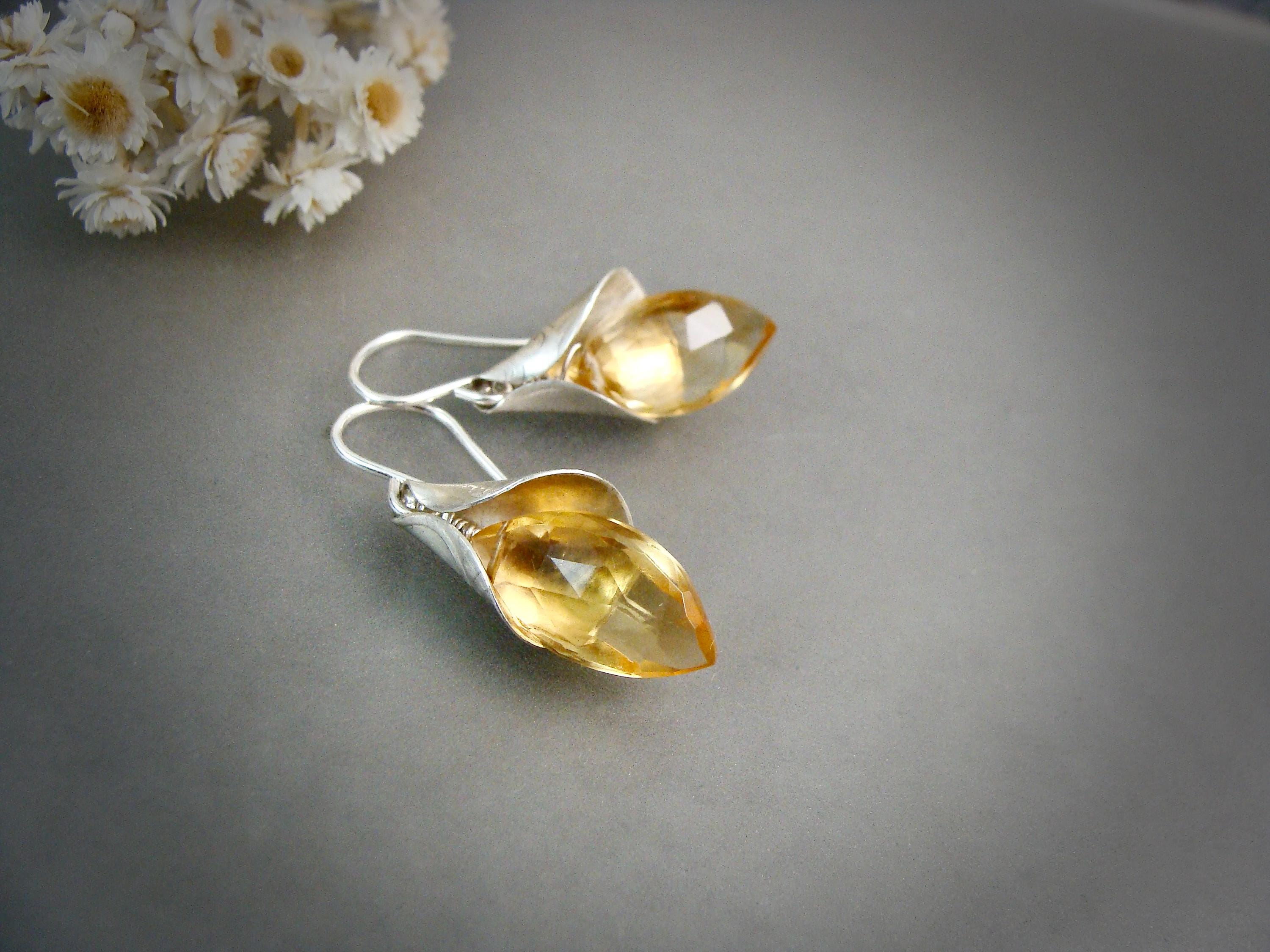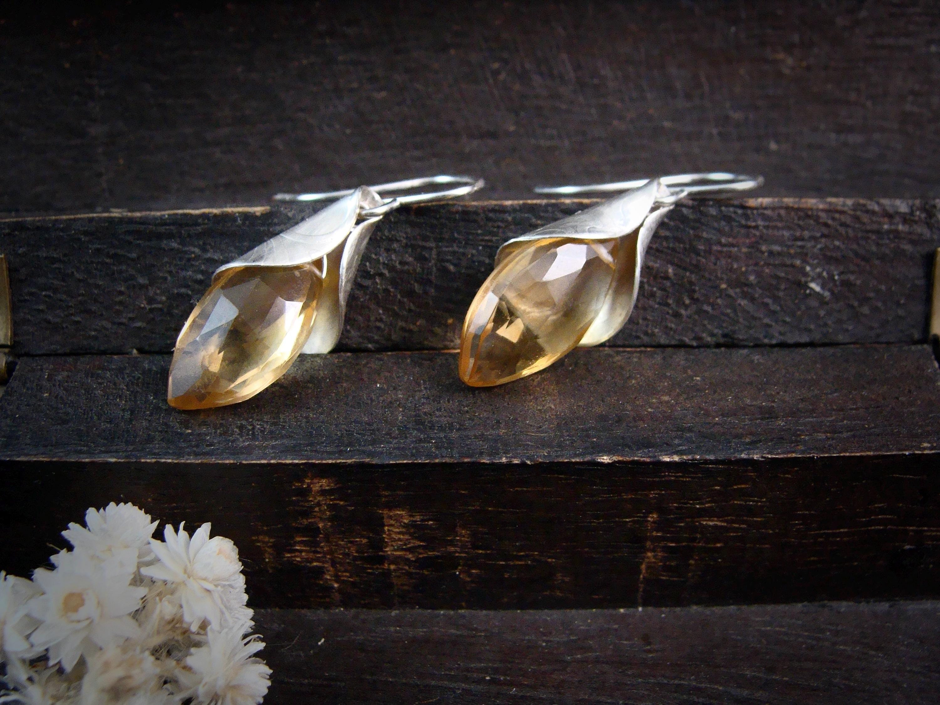 These citrine and sterling silver dangle earrings feature rich golden gemstones. The gems have been encased in sterling silver bells made to mimic delicate lily design. The silver has been hand formed and roller printed with a pretty vine design making a warm, radiant design perfect for November birthdays, and meaningful gifts. These sparkling stones hang from bright sterling ear wires. The stones may have tiny imperfections as most natural gemstones do. 100% handmade.