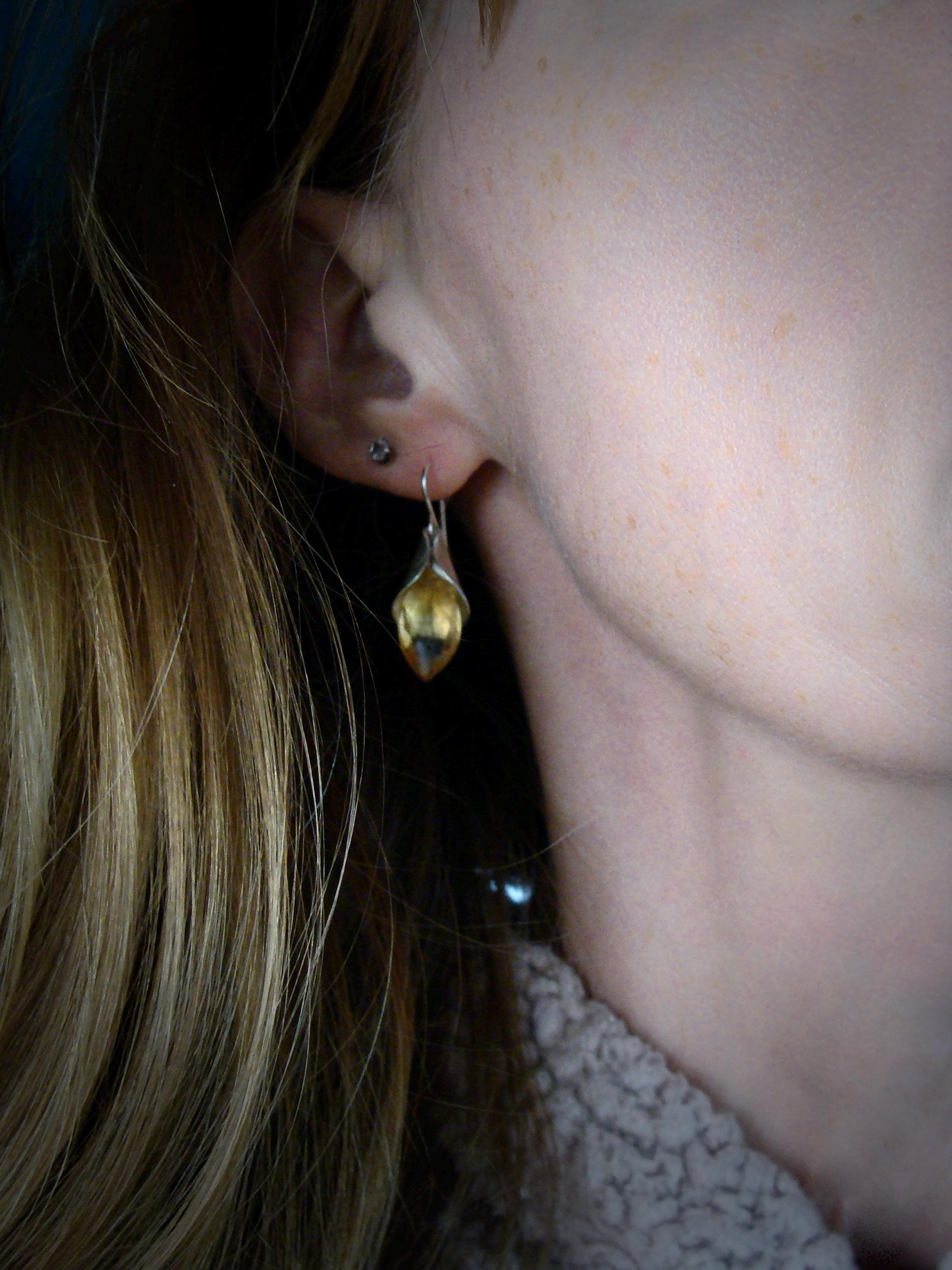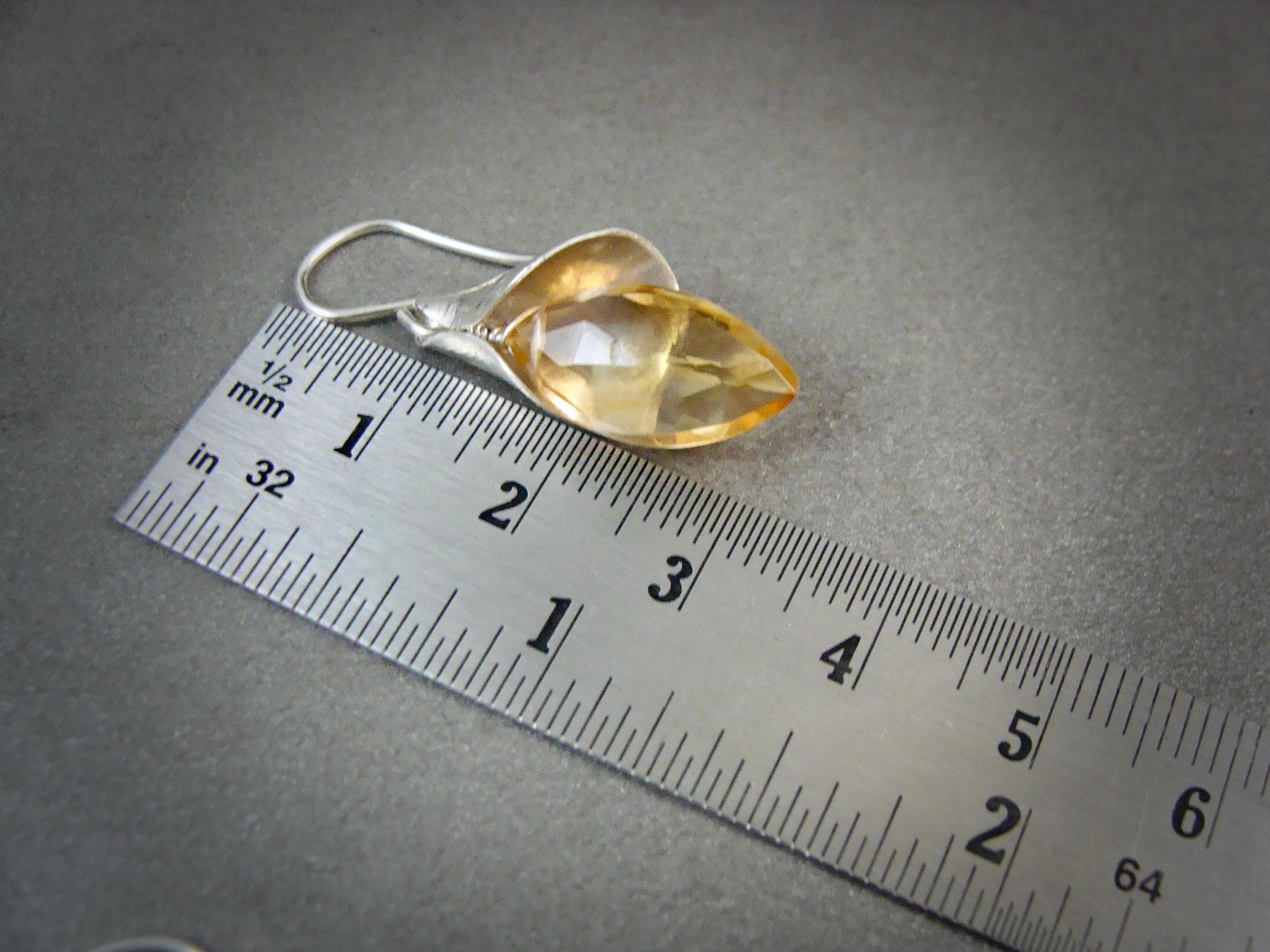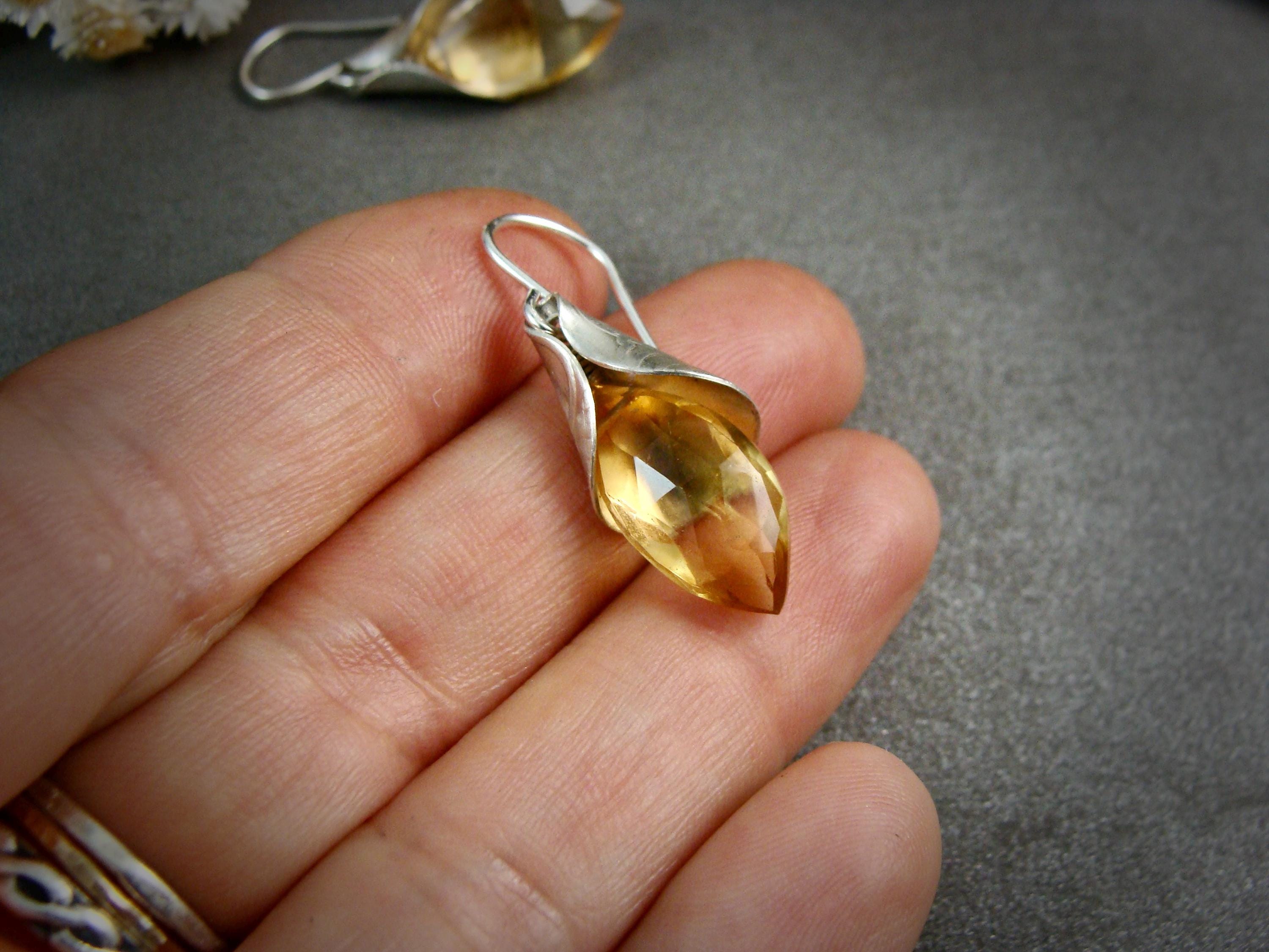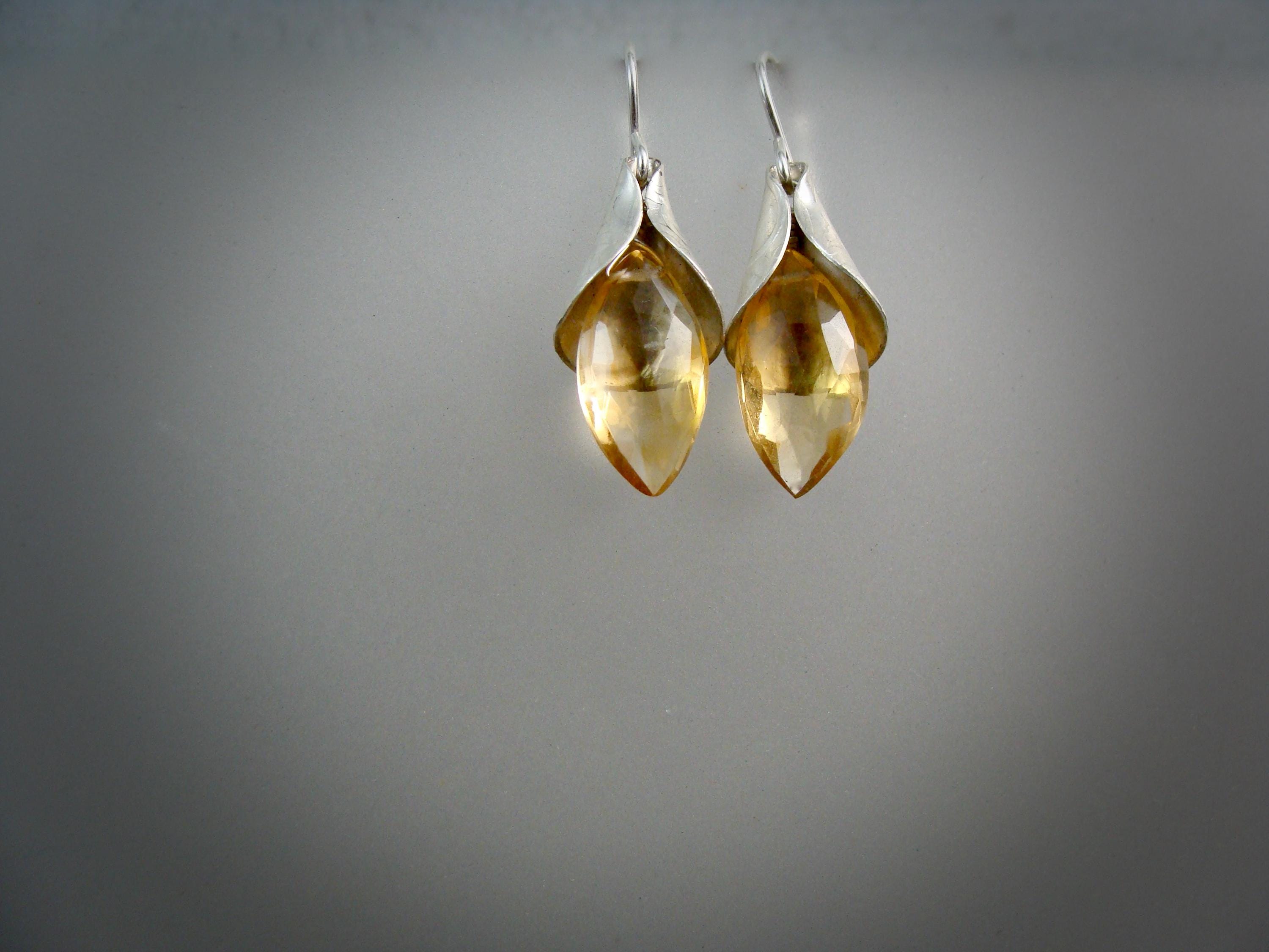 These citrine and sterling silver dangle earrings feature rich golden gemstones. The gems have been encased in sterling silver bells made to mimic delicate lily design. The silver has been hand formed and roller printed with a pretty vine design making a warm, radiant design perfect for November birthdays, and meaningful gifts. These sparkling stones hang from bright sterling ear wires. The stones may have tiny imperfections as most natural gemstones do. 100% handmade.