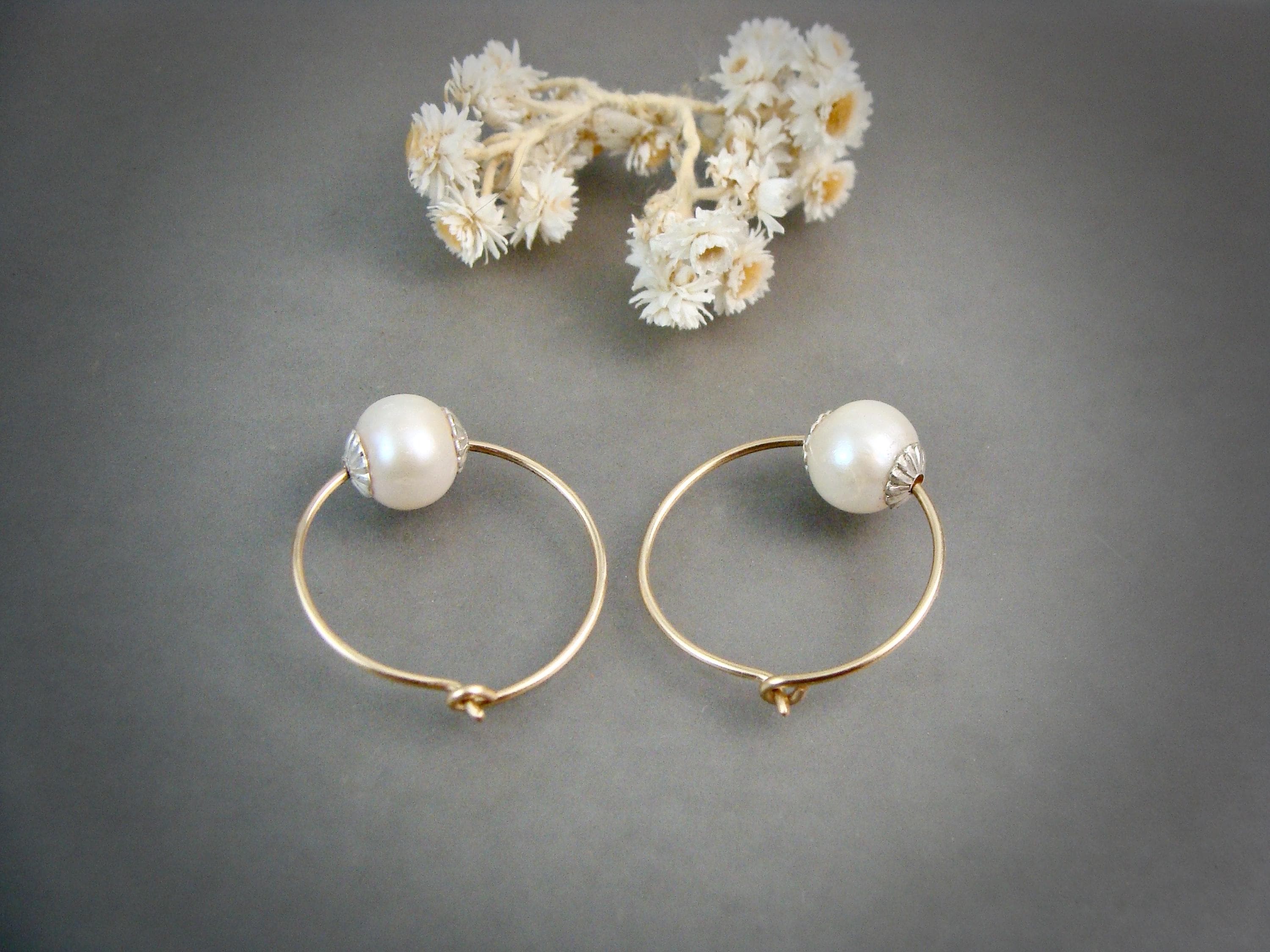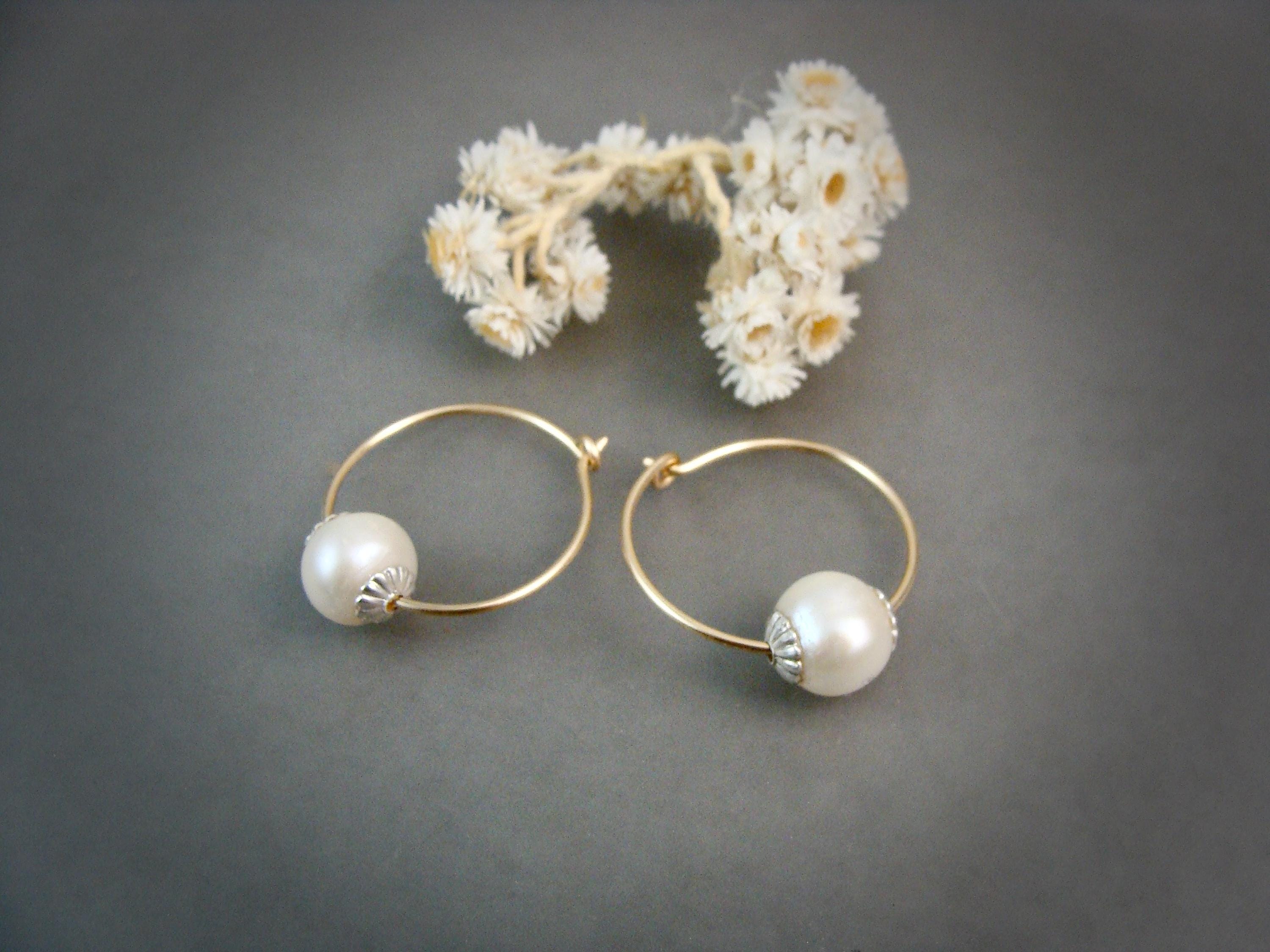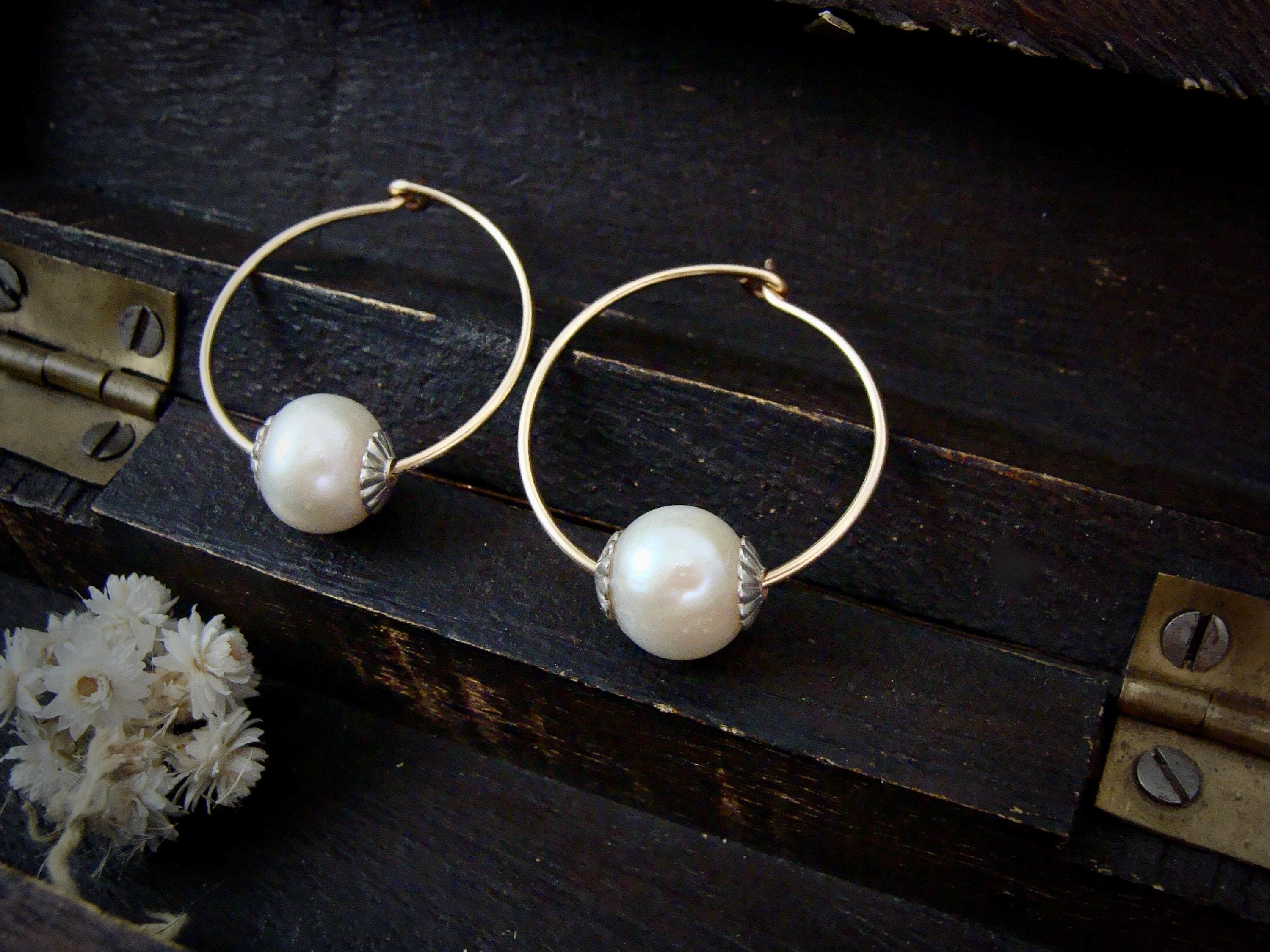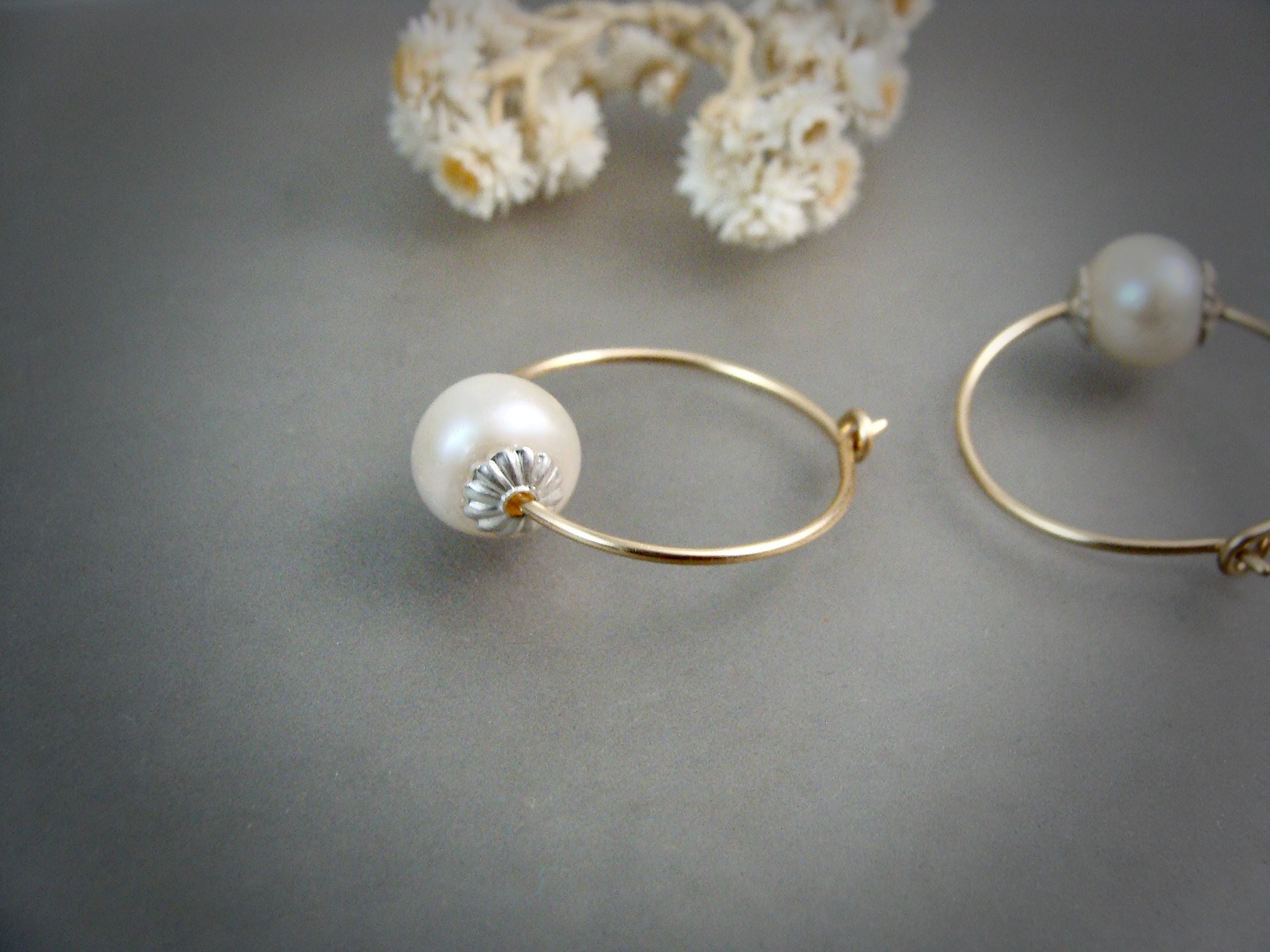 These pearls have been merged with tiny flower like sterling silver 925 caps. The fresh water pearls are on elegant 14k gold filled hoops These simple, elegant earrings are great for everyday.