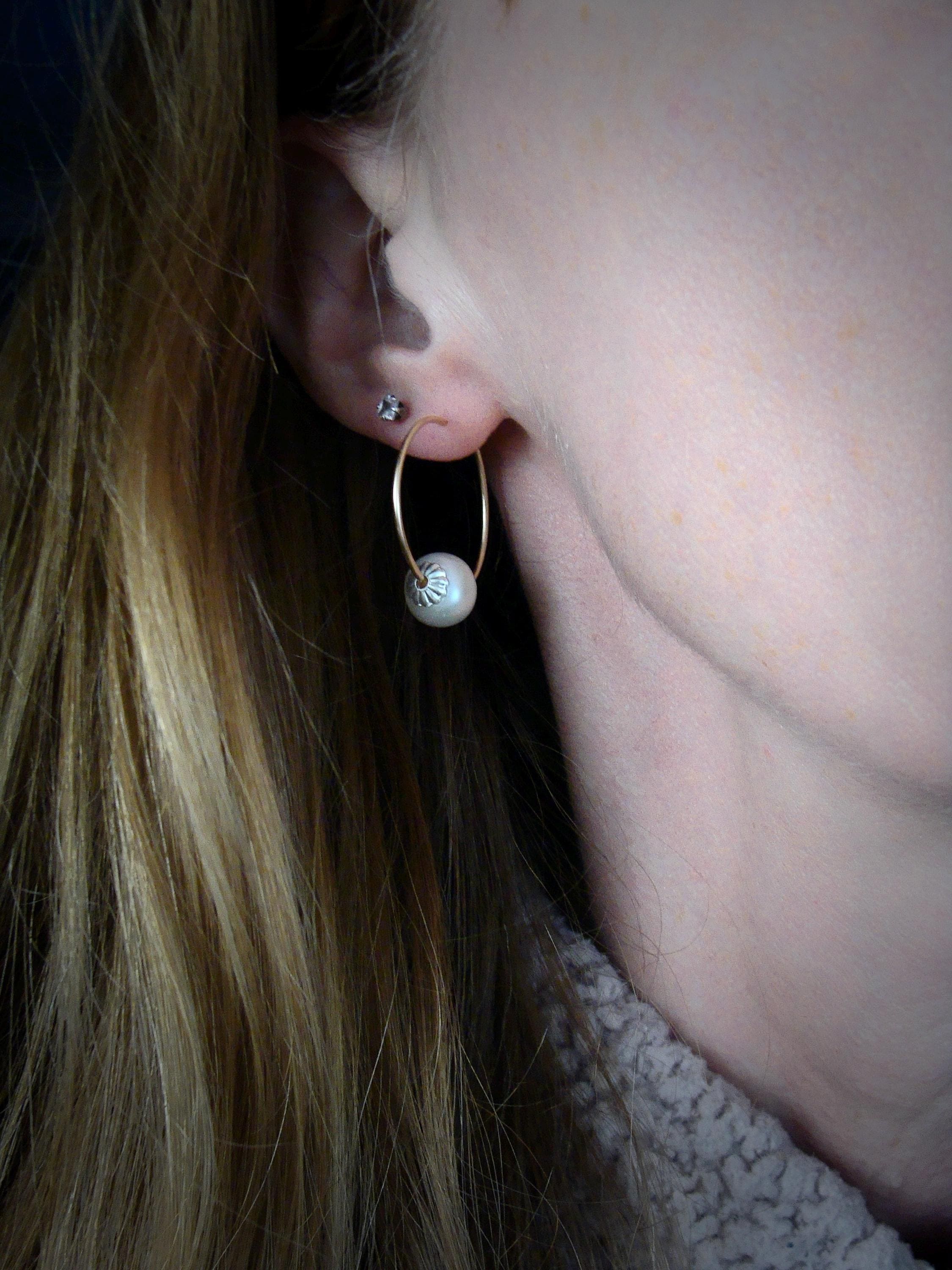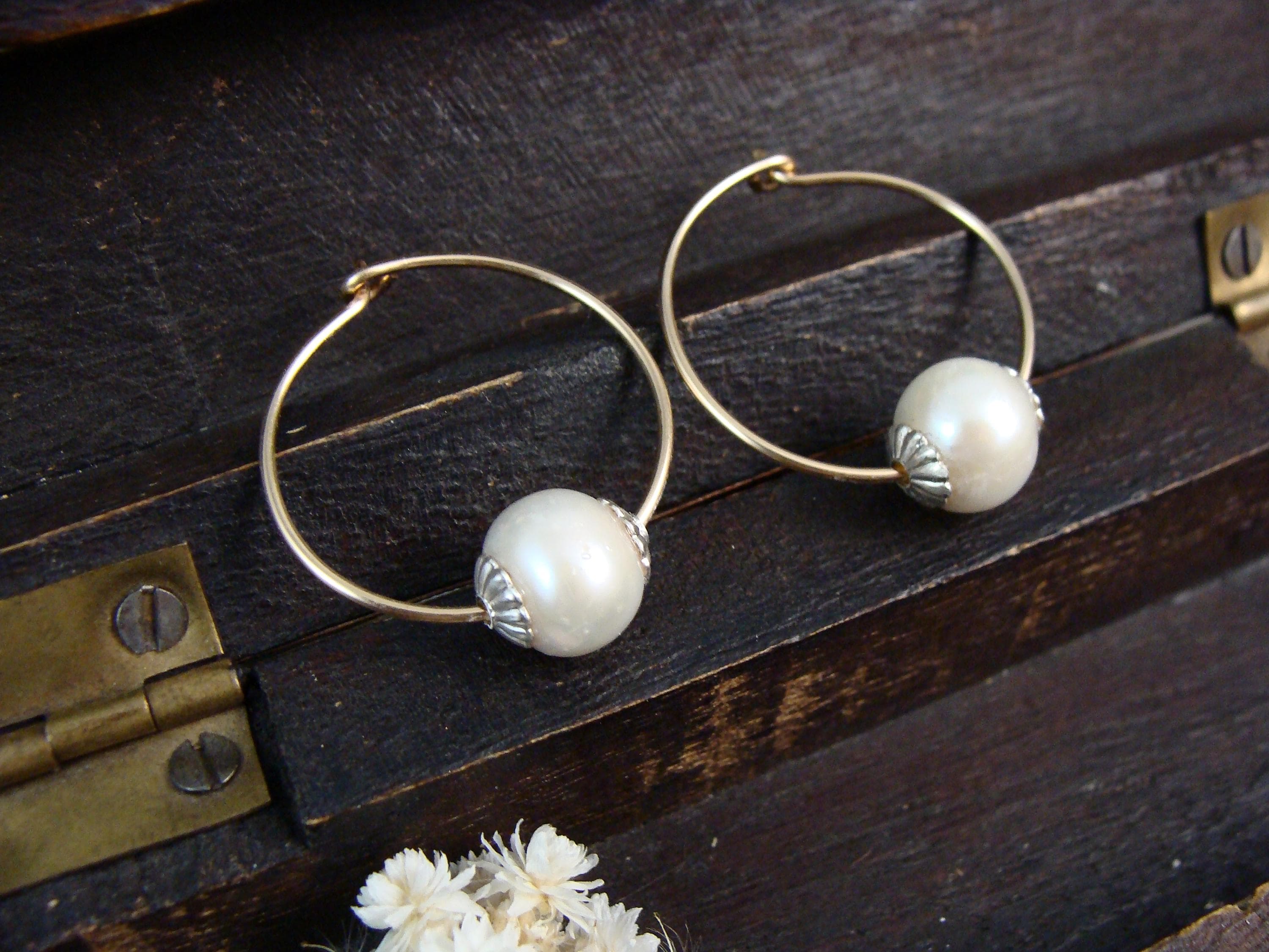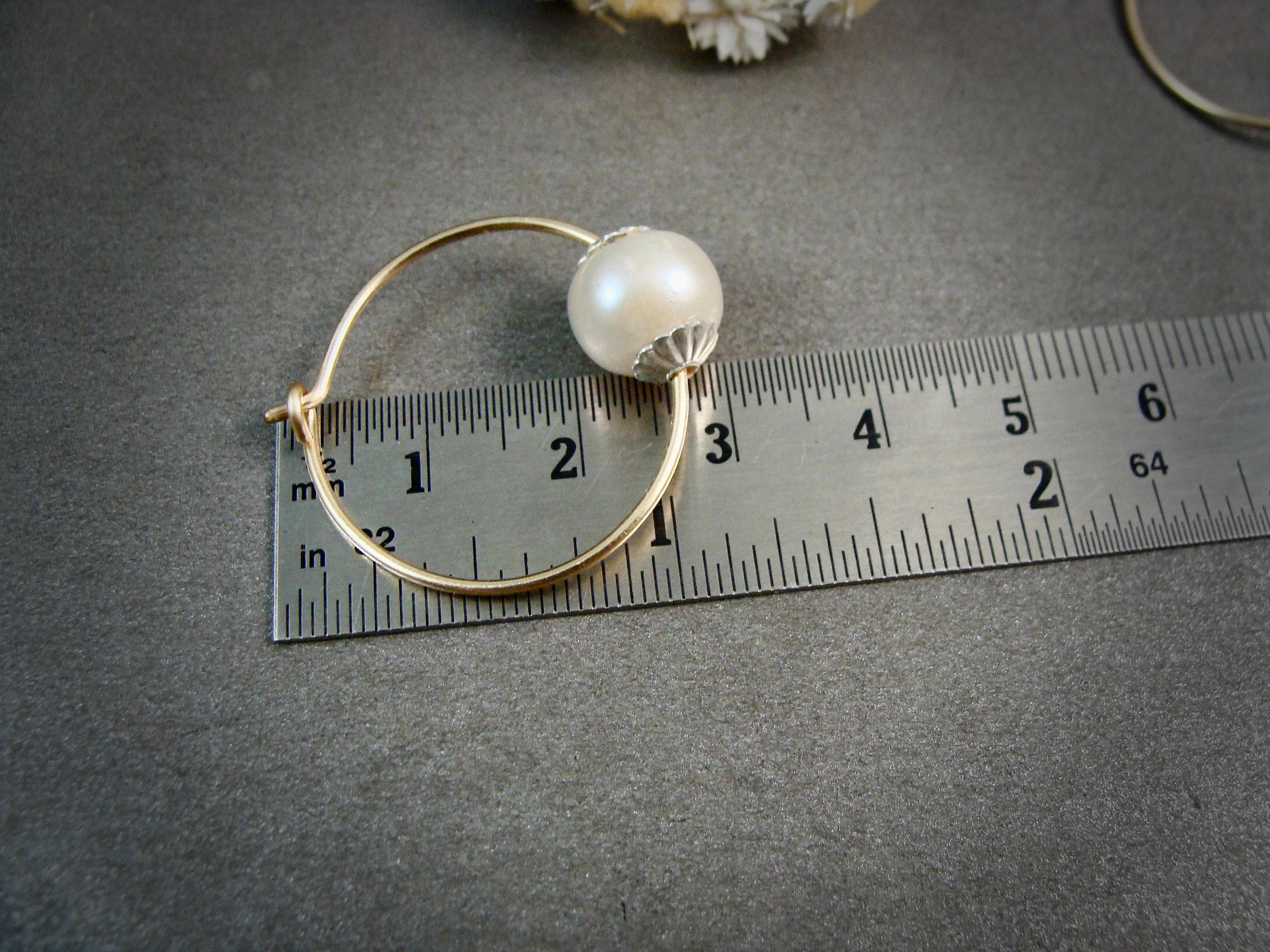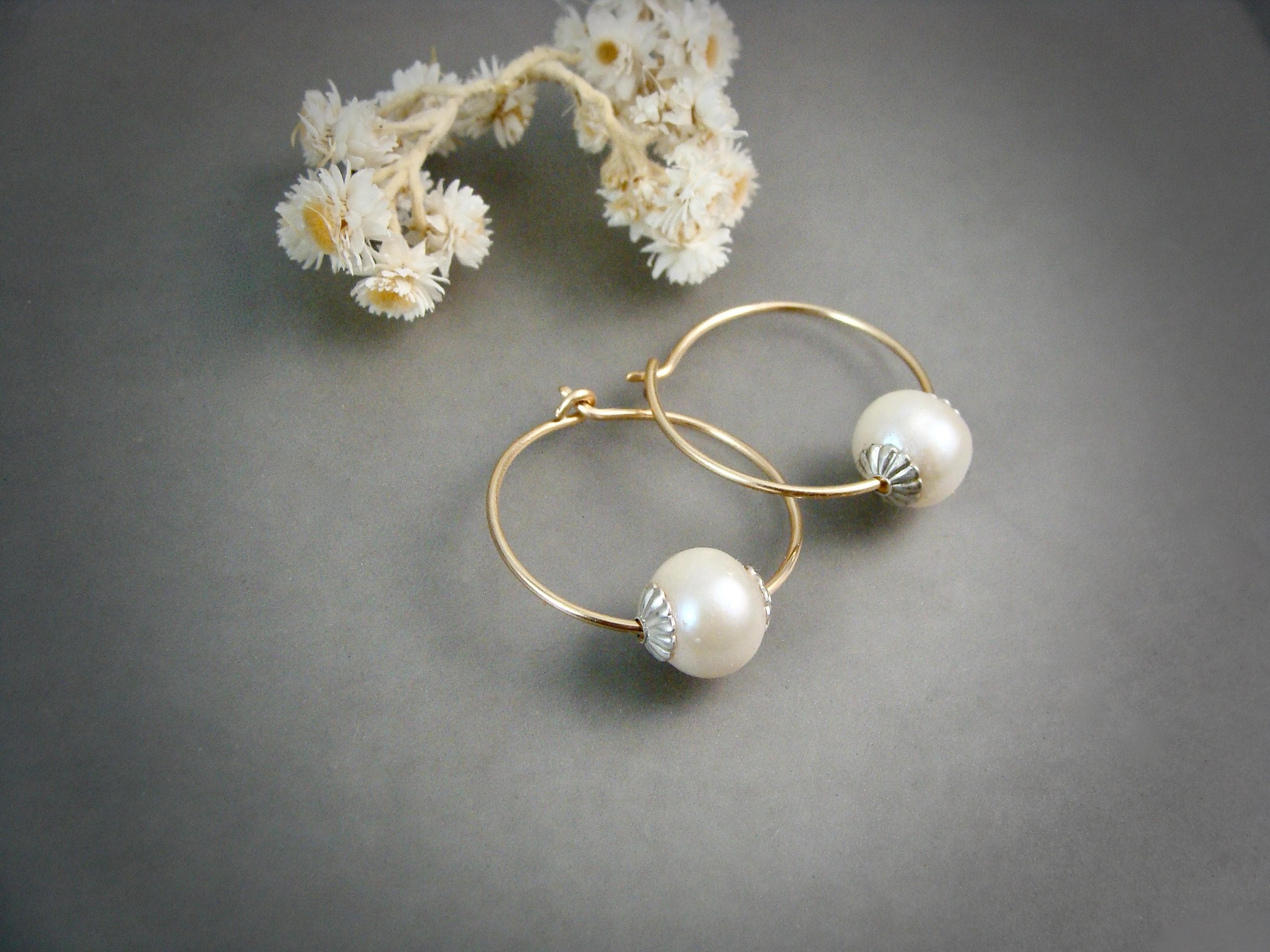 These pearls have been merged with tiny flower like sterling silver 925 caps. The fresh water pearls are on elegant 14k gold filled hoops These simple, elegant earrings are great for everyday.