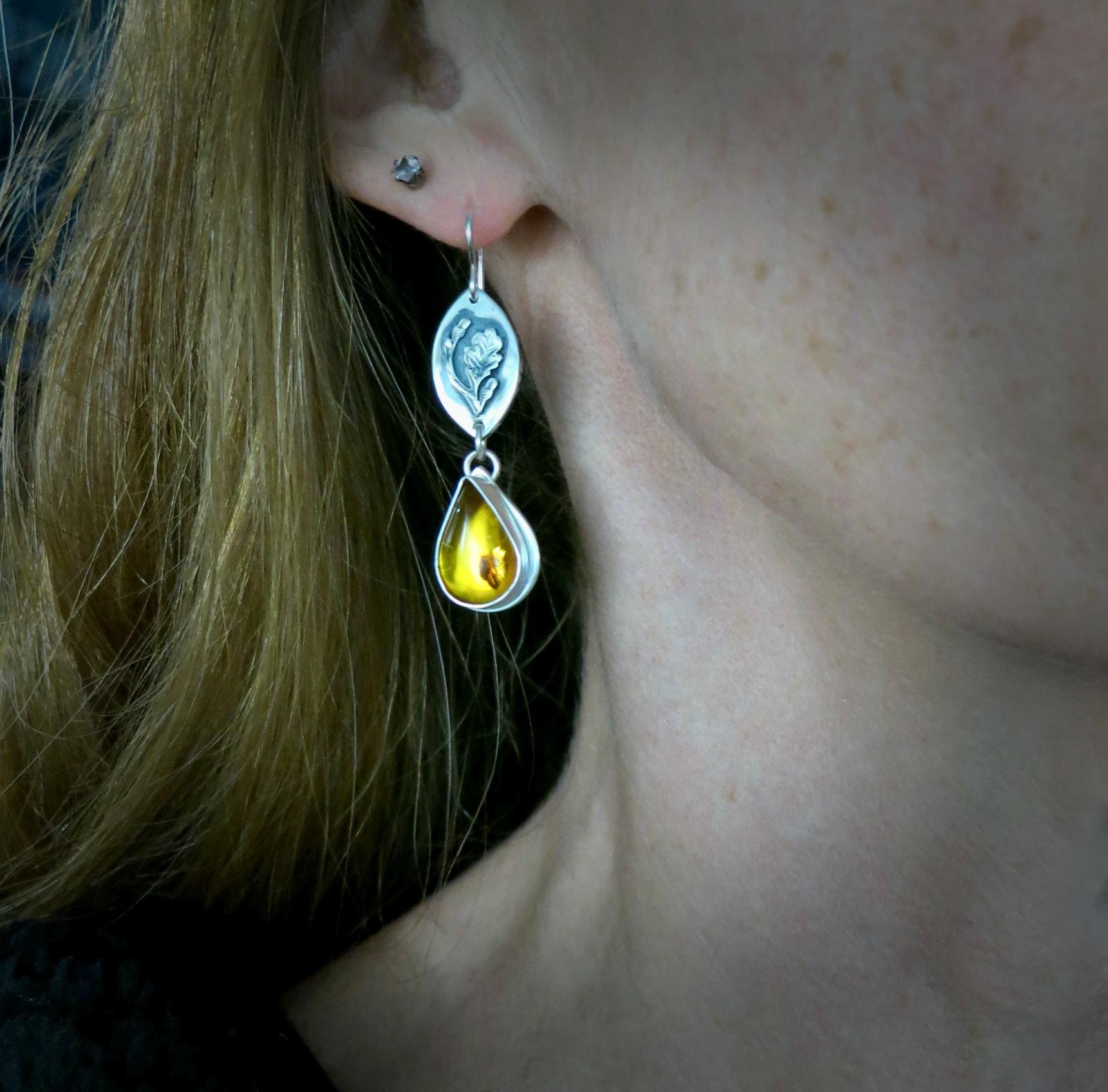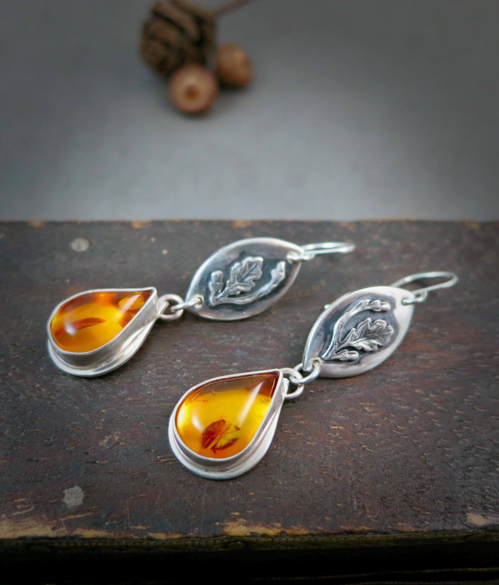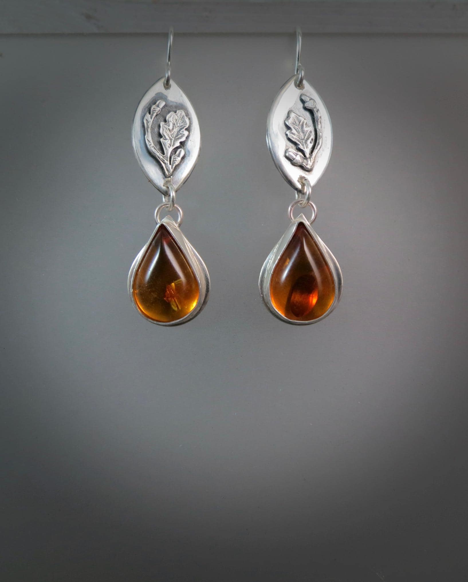 These warm drops of amber have been captured in sterling silver tear drop settings. Like sap dripping from the tree, the gems dangle from delicate sterling oak leaves. The back of the earrings have been stamped with crescent moons and my maker's mark. Sterling silver ear wires.