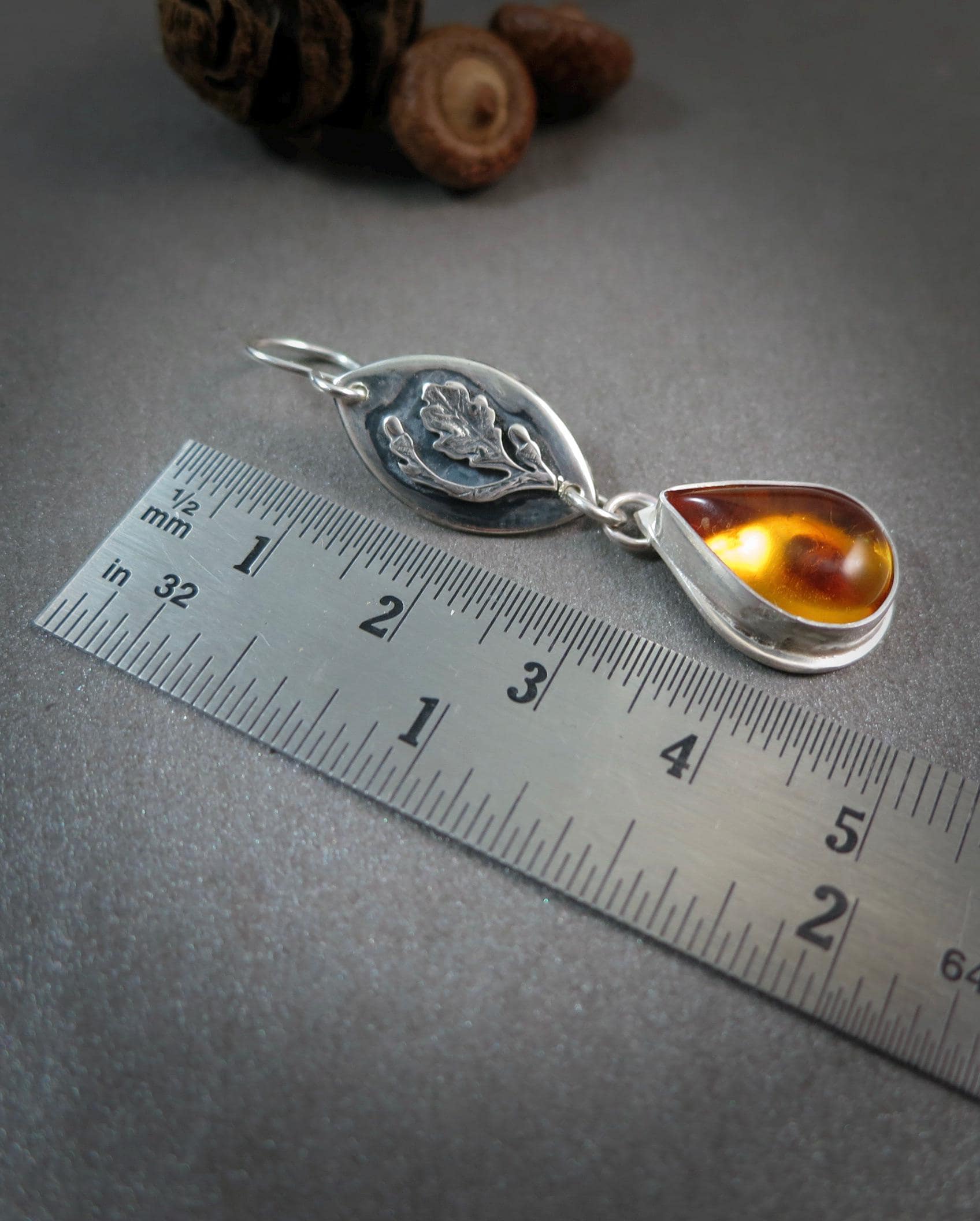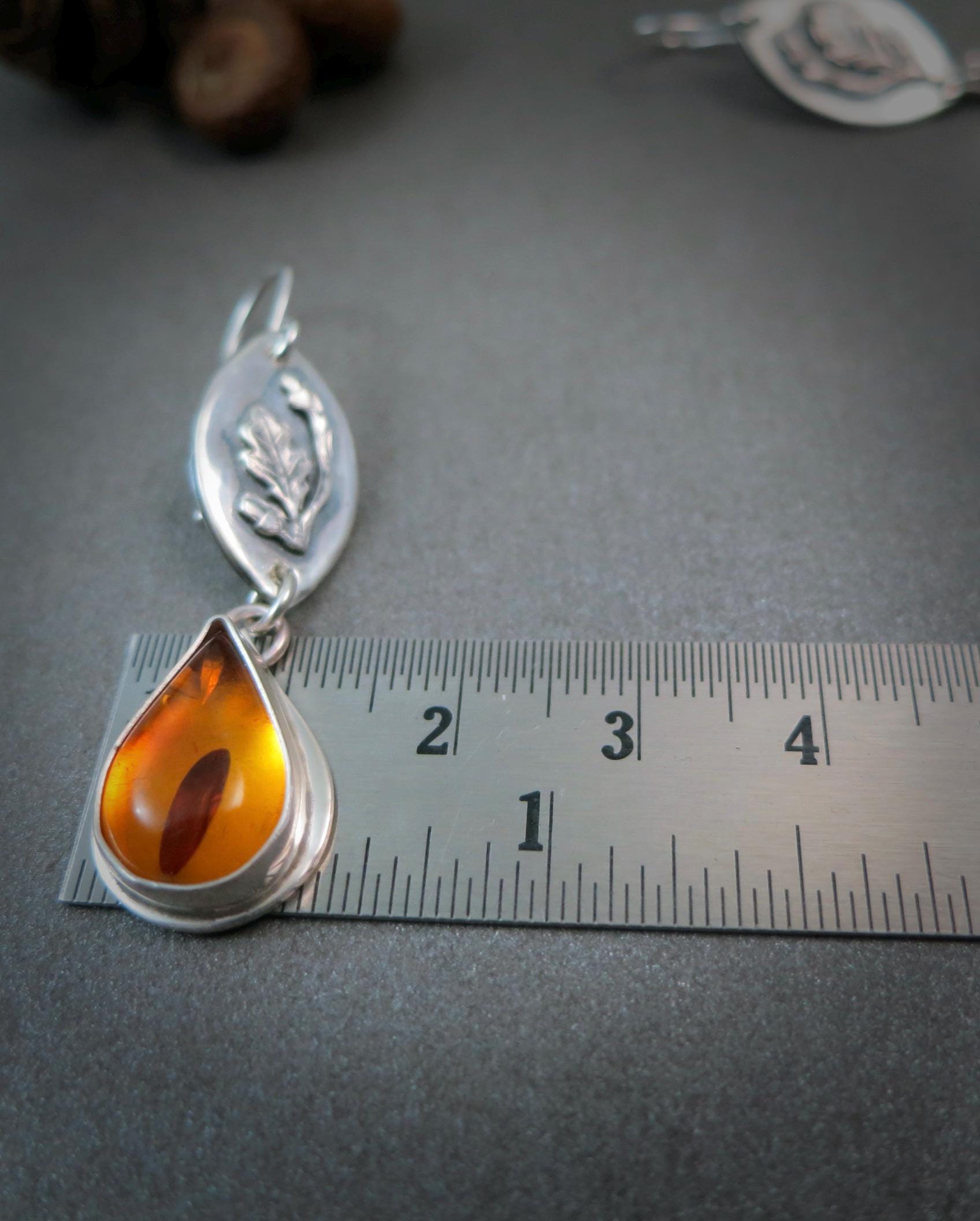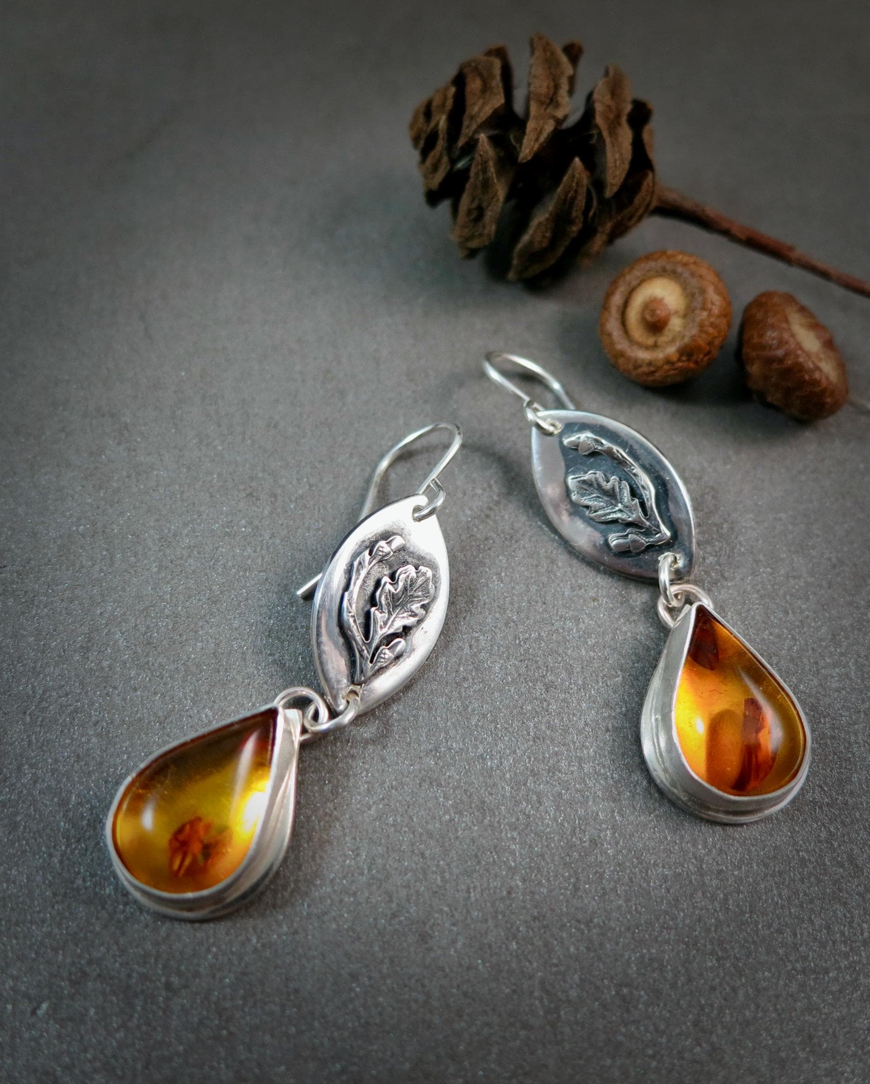 These warm drops of amber have been captured in sterling silver tear drop settings. Like sap dripping from the tree, the gems dangle from delicate sterling oak leaves. The back of the earrings have been stamped with crescent moons and my maker's mark. Sterling silver ear wires.