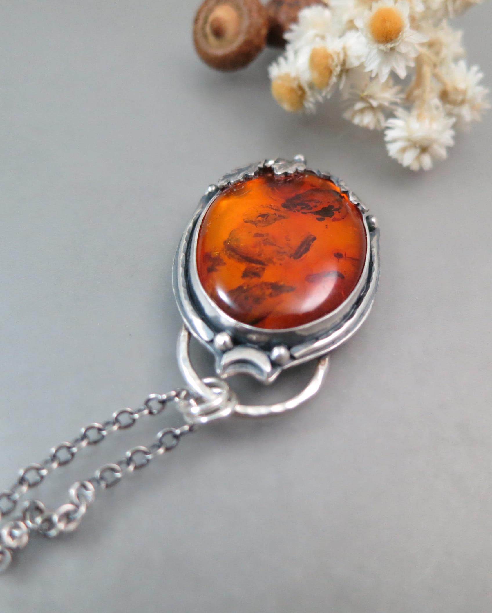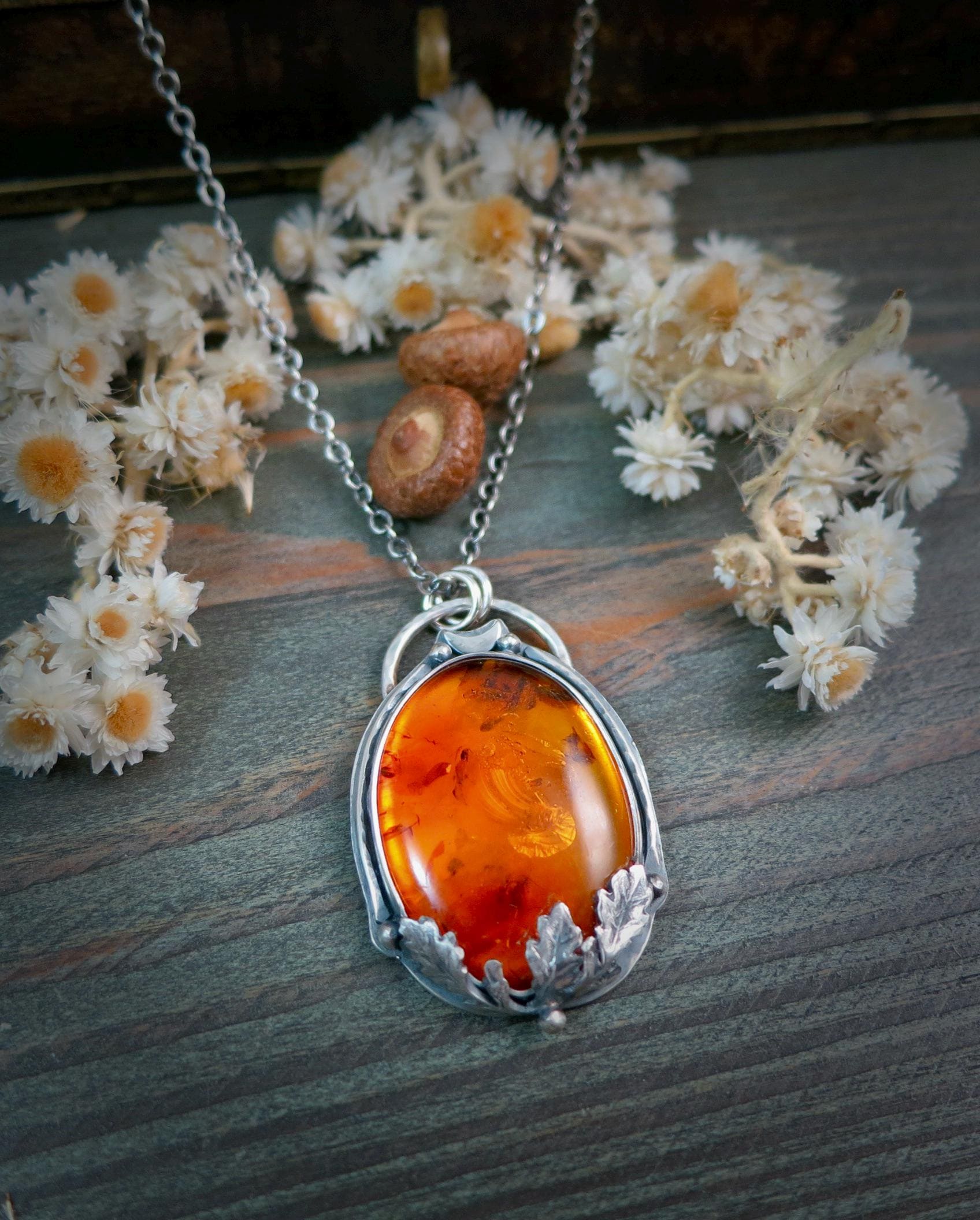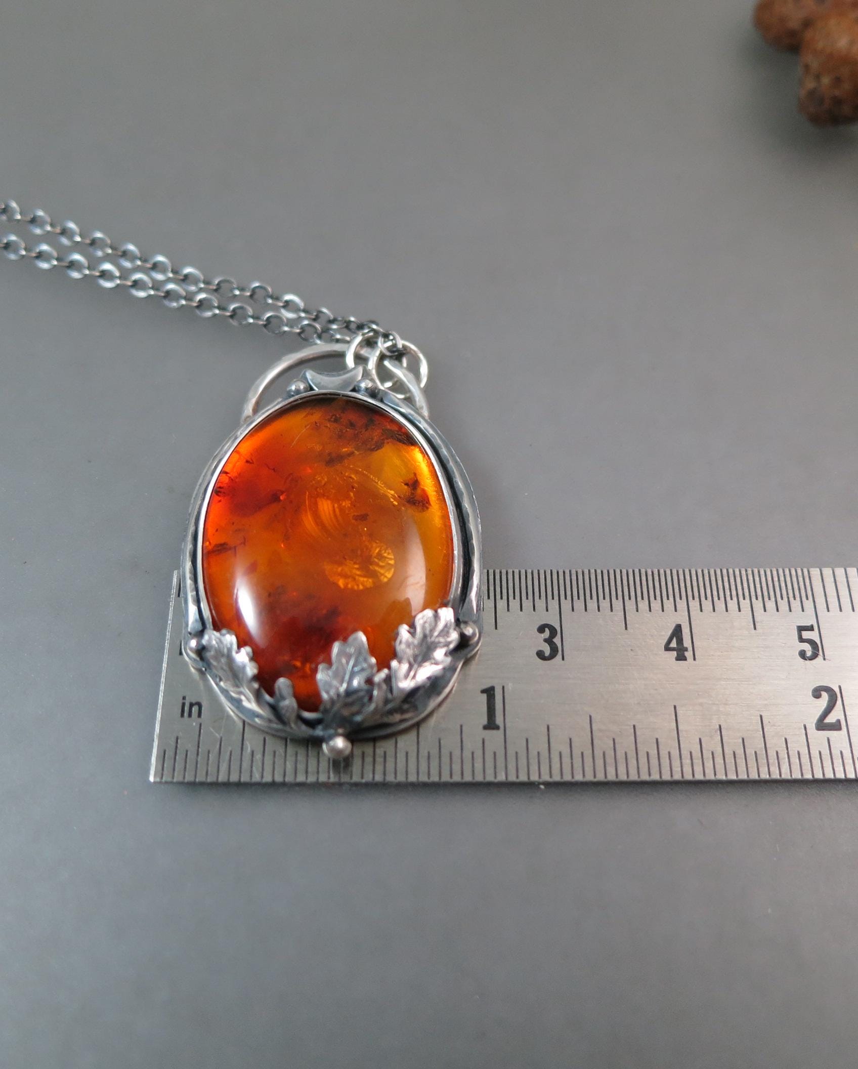 This beautiful warm amber gemstone holds pretty shimmery inclusions trapped within. The stone has been embellished with delicate oak leaves that hug the bottom of the stone. A tiny crescent moon crowns the gem shinning down from above. The back side of the pendant has a tiny oak leave embellishment, is stamped with my maker's mark and 925.