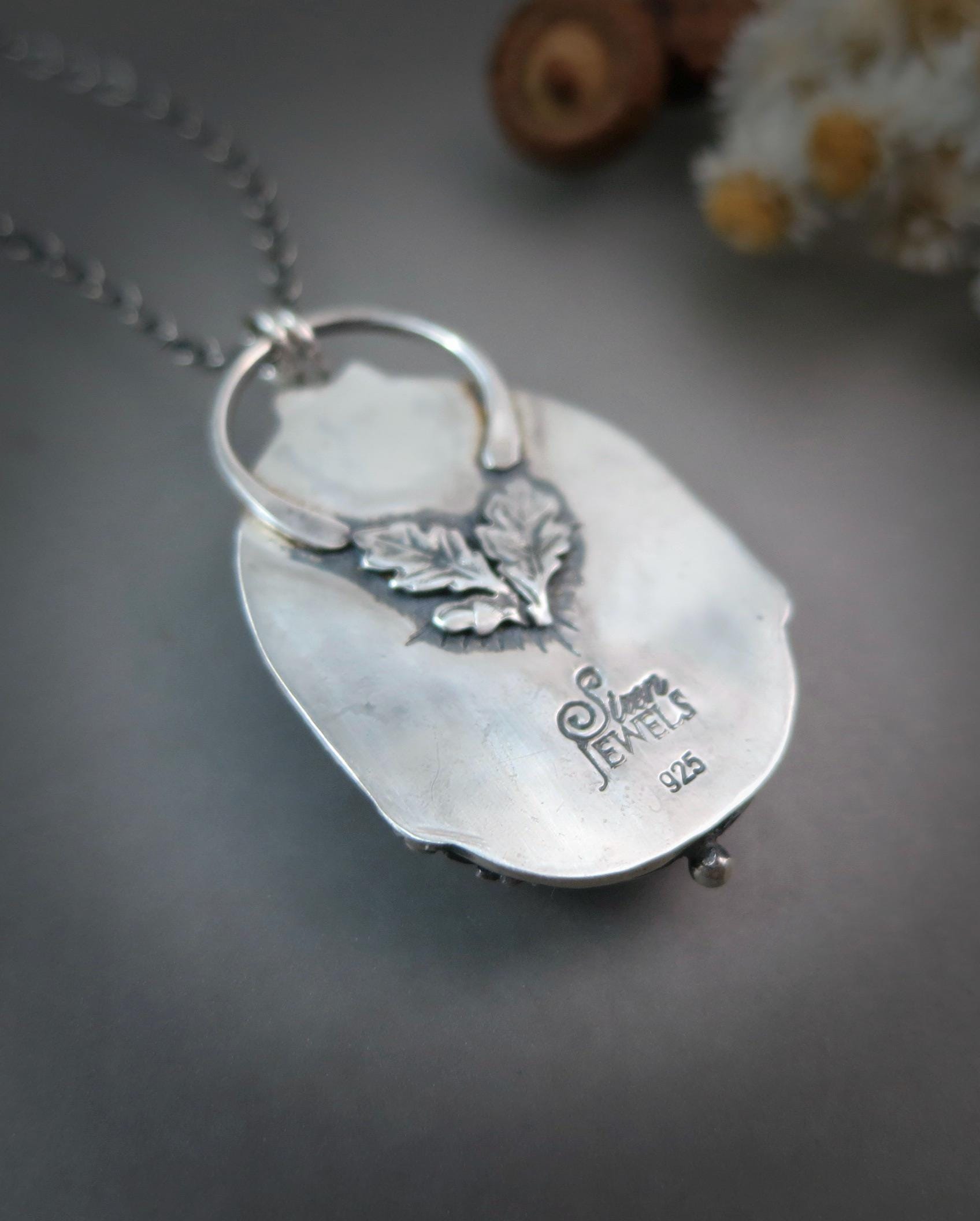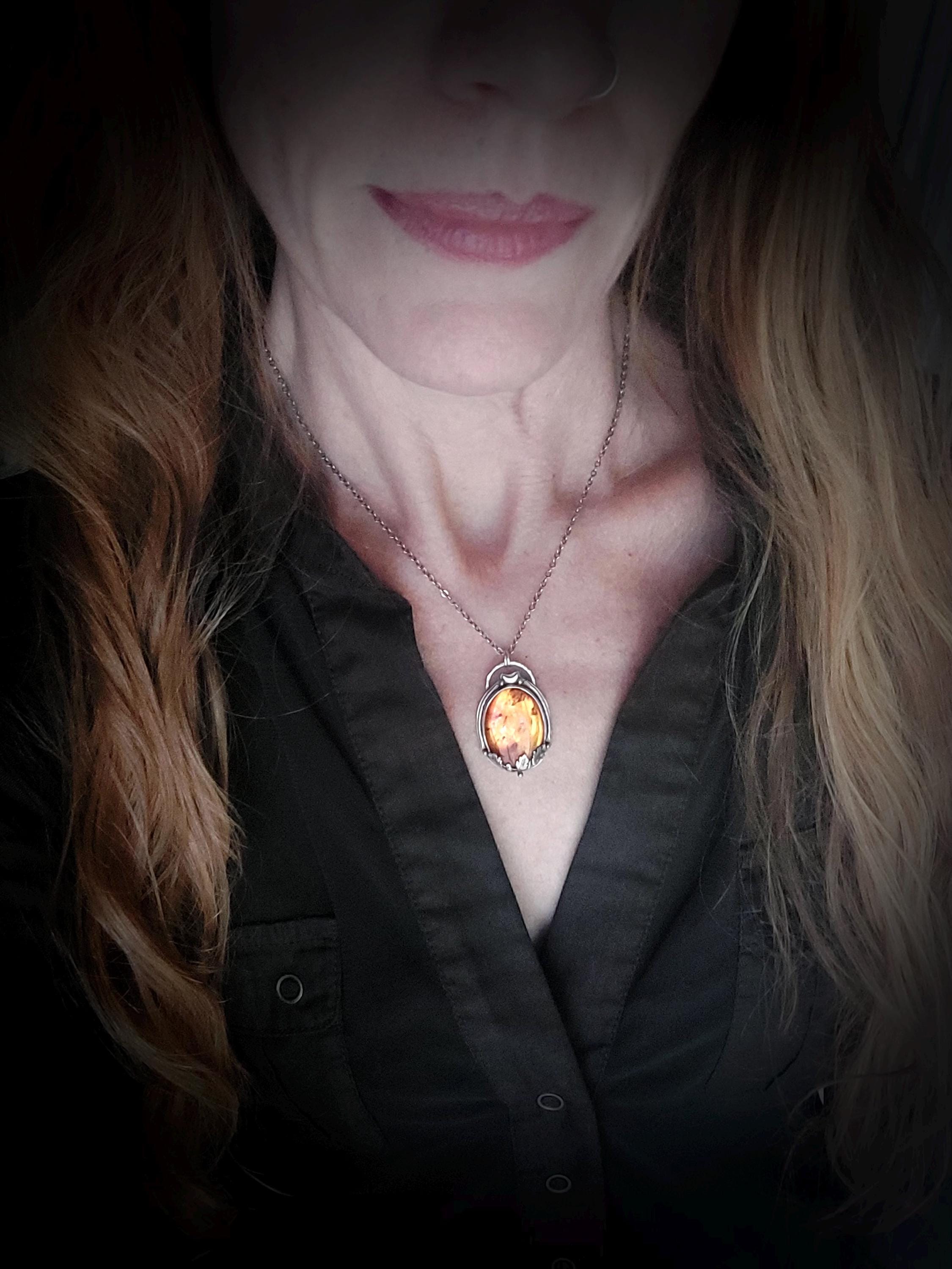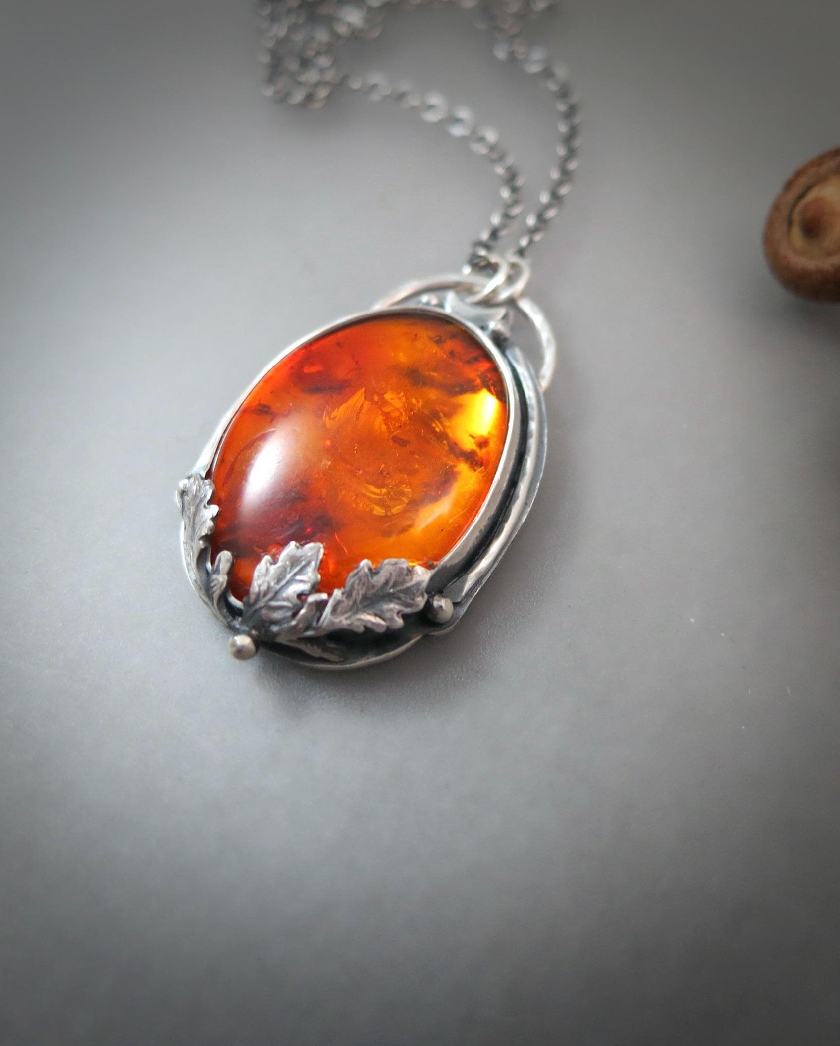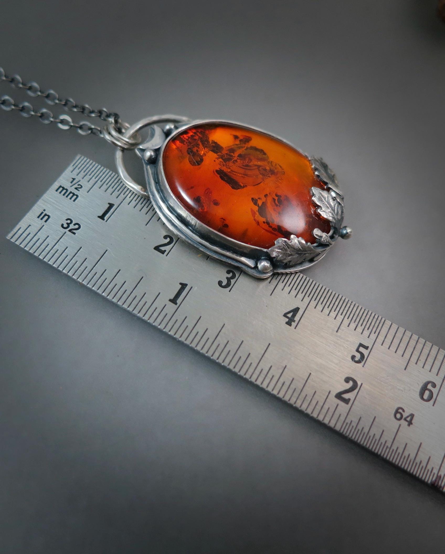 This beautiful warm amber gemstone holds pretty shimmery inclusions trapped within. The stone has been embellished with delicate oak leaves that hug the bottom of the stone. A tiny crescent moon crowns the gem shinning down from above. The back side of the pendant has a tiny oak leave embellishment, is stamped with my maker's mark and 925.