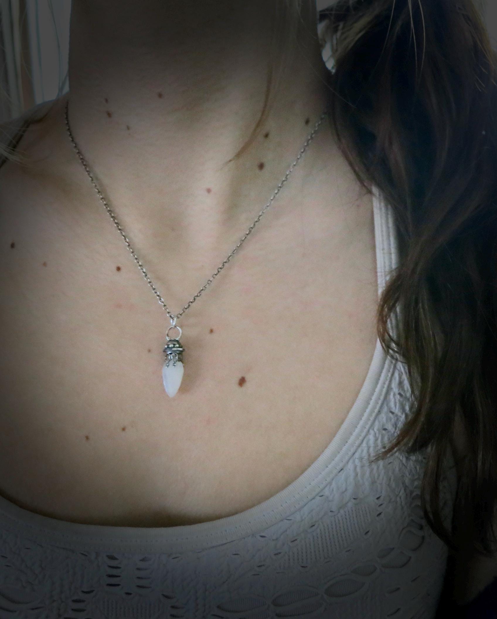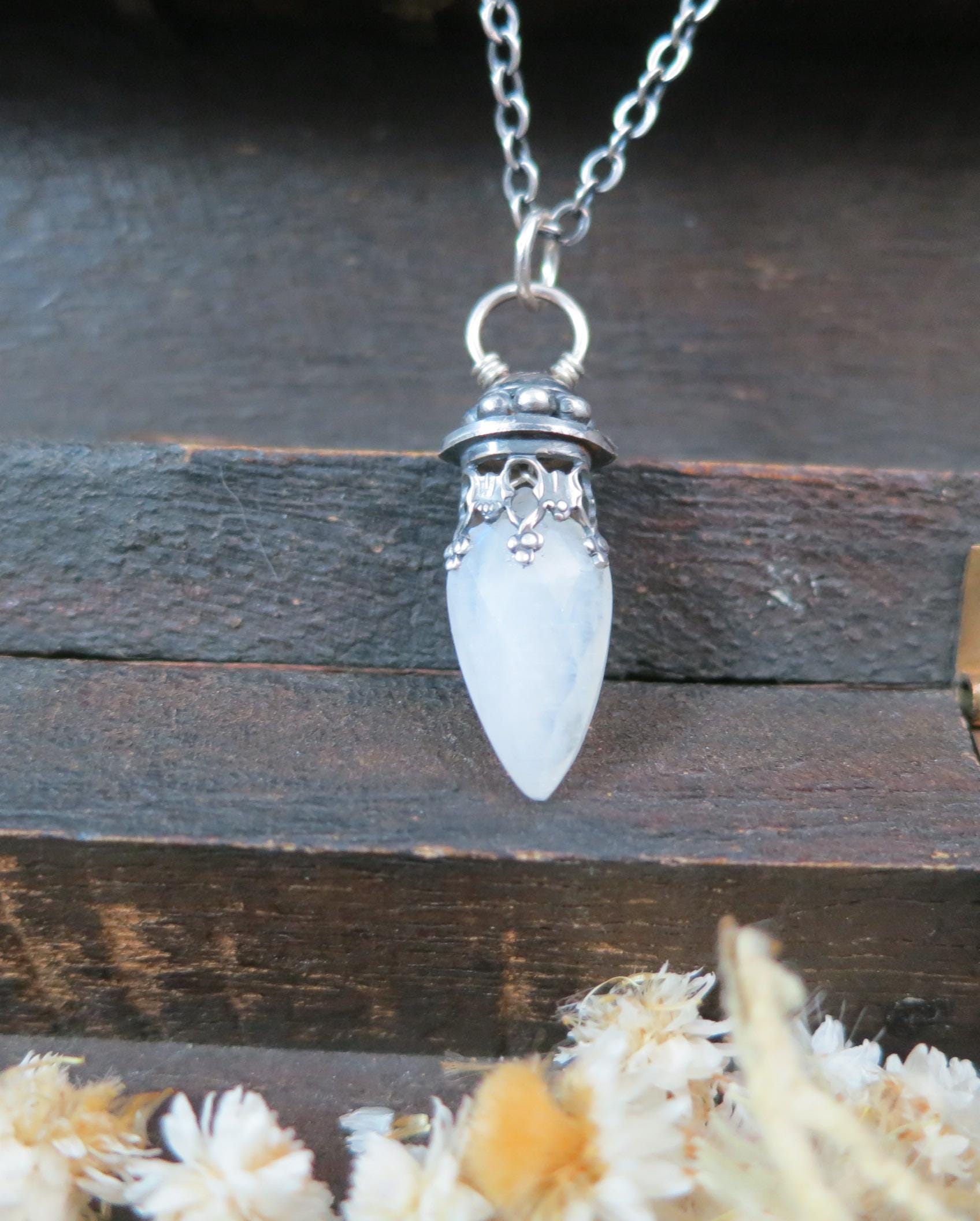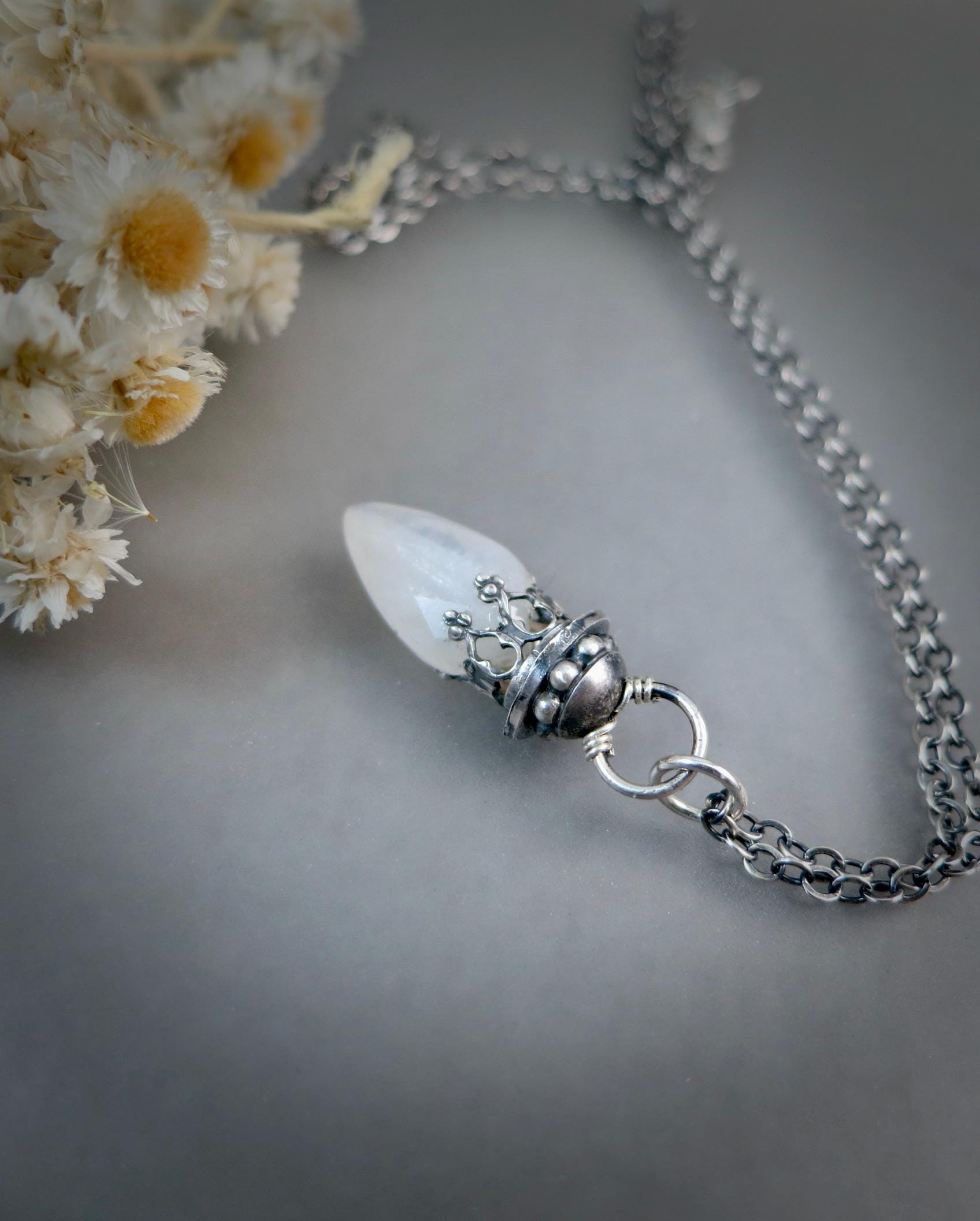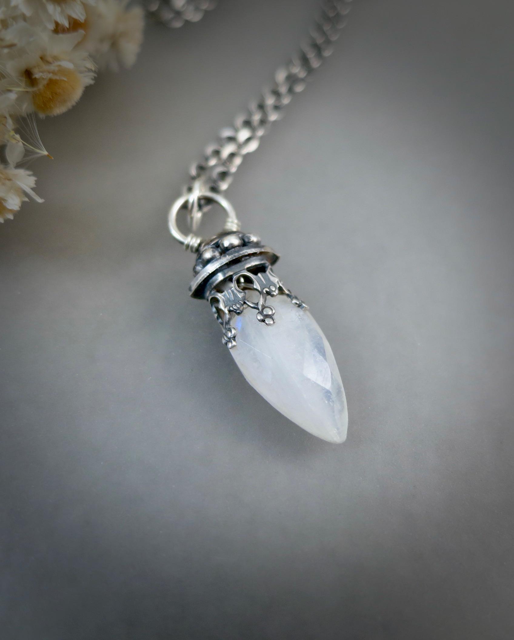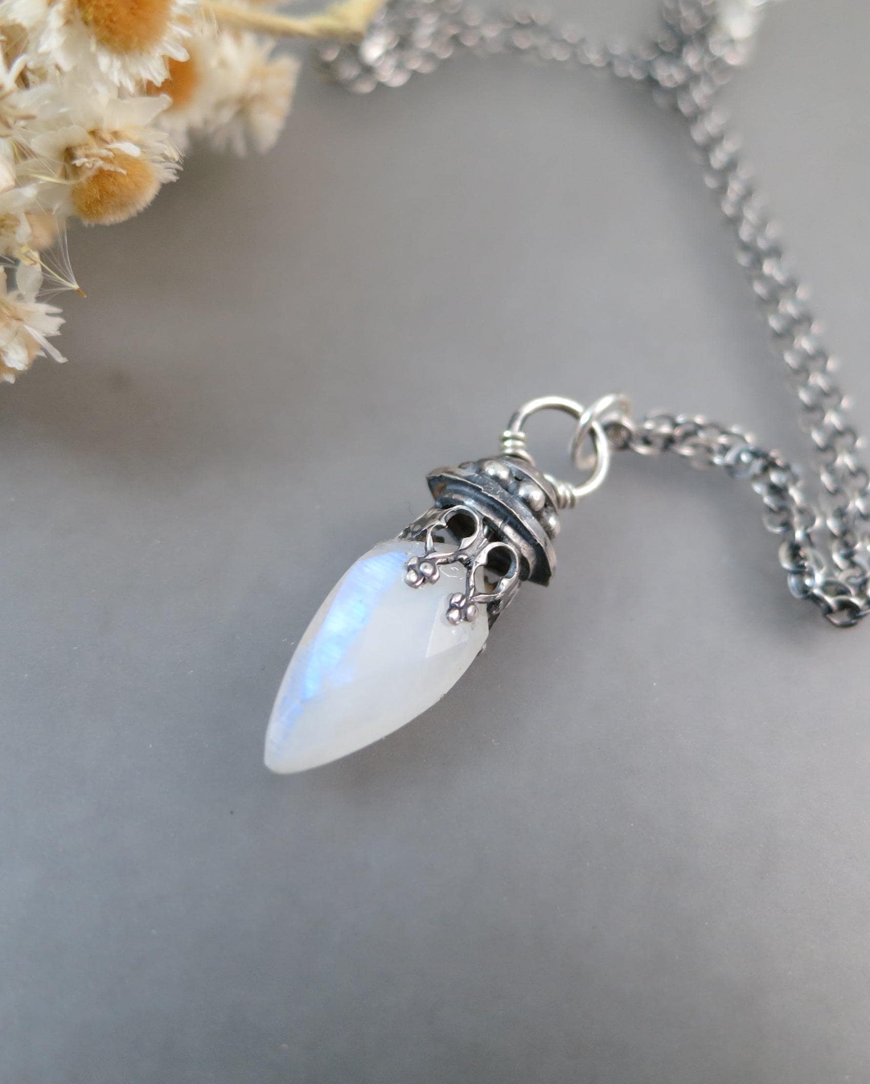 This pretty Moonstone glows greenish blue when struck by the light. The gem hangs from a handmade sterling silver setting. The gem sparkles with many facets to catch the light. The silver surrounding the stone has been given a dark patina for that time worn look.