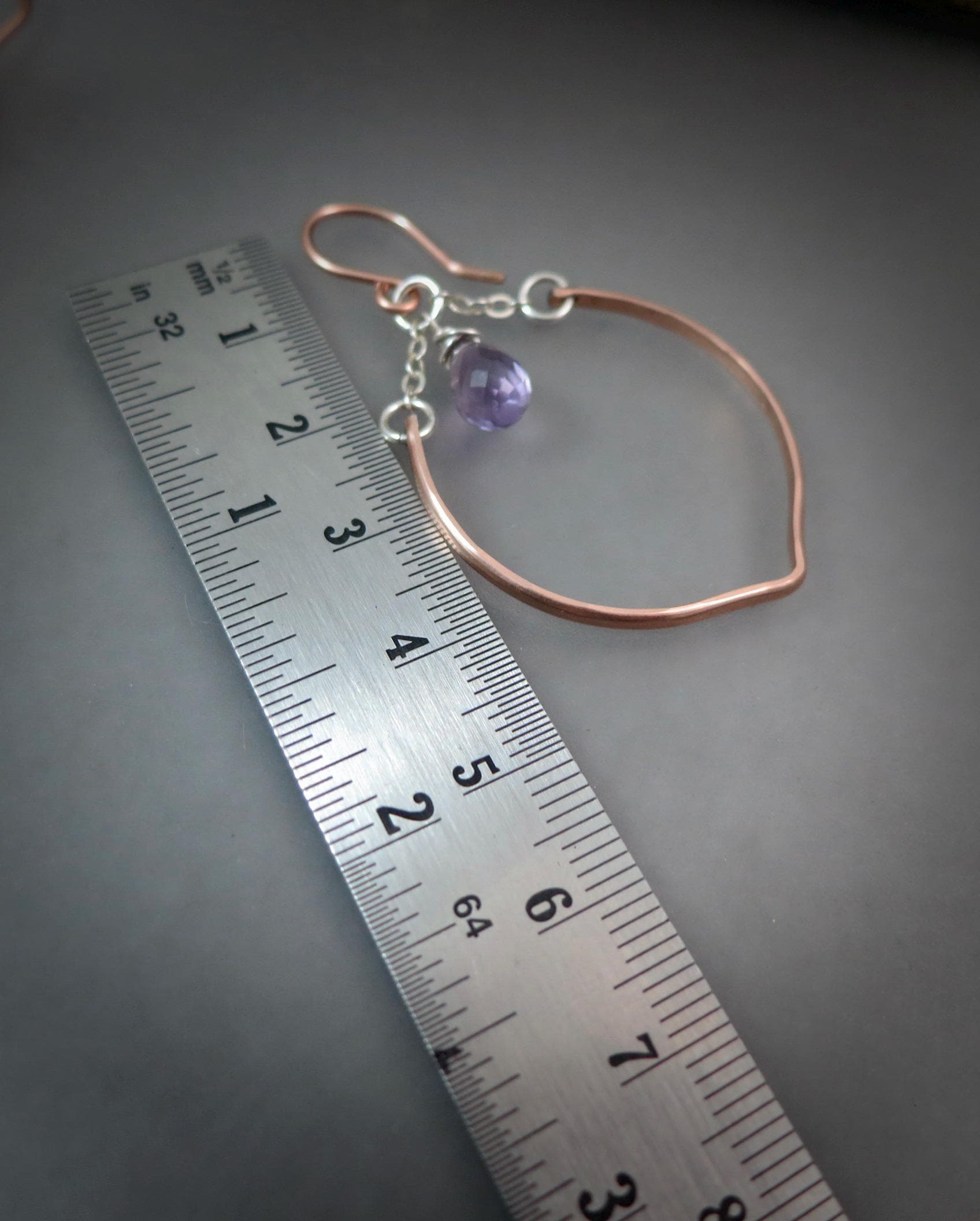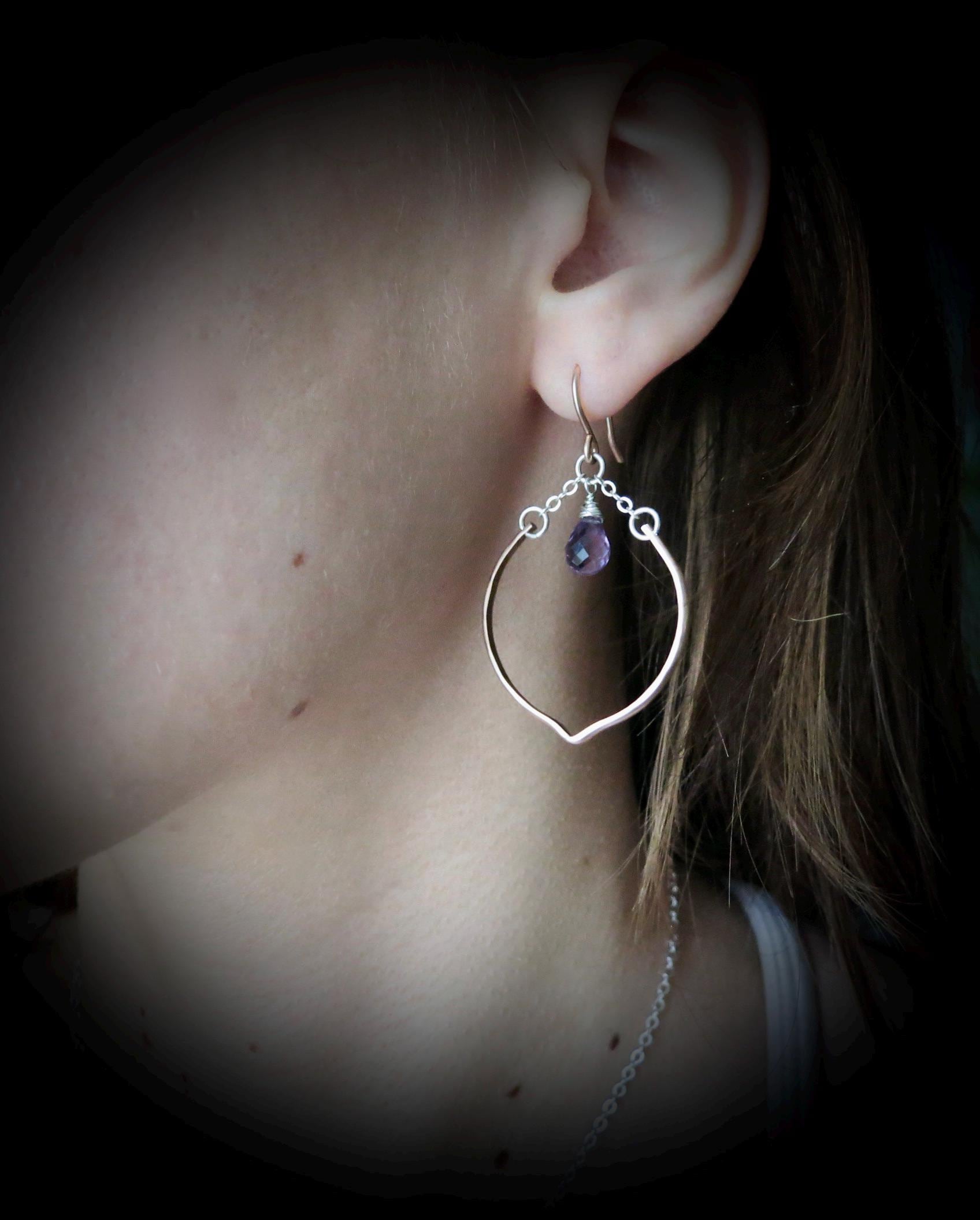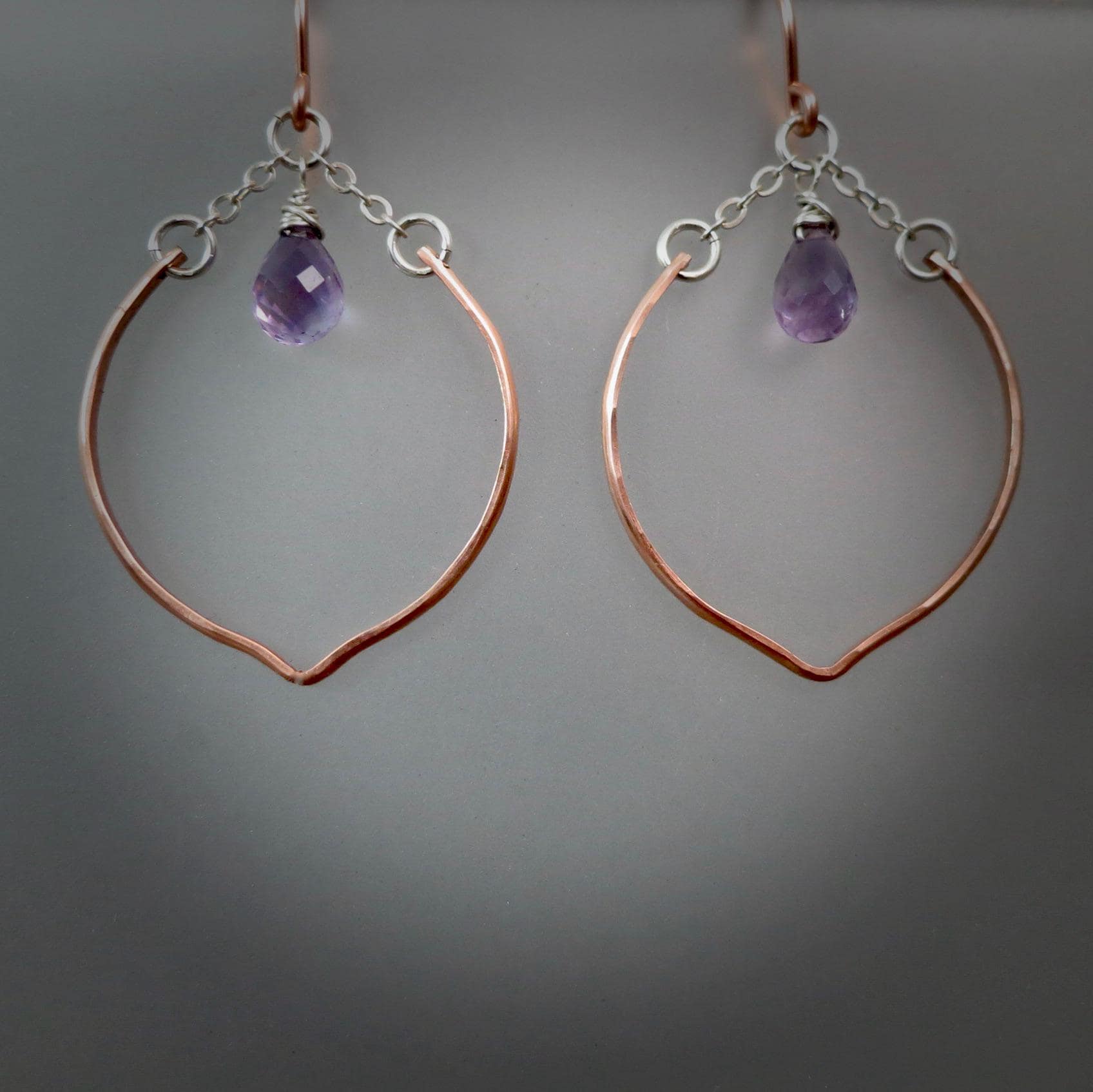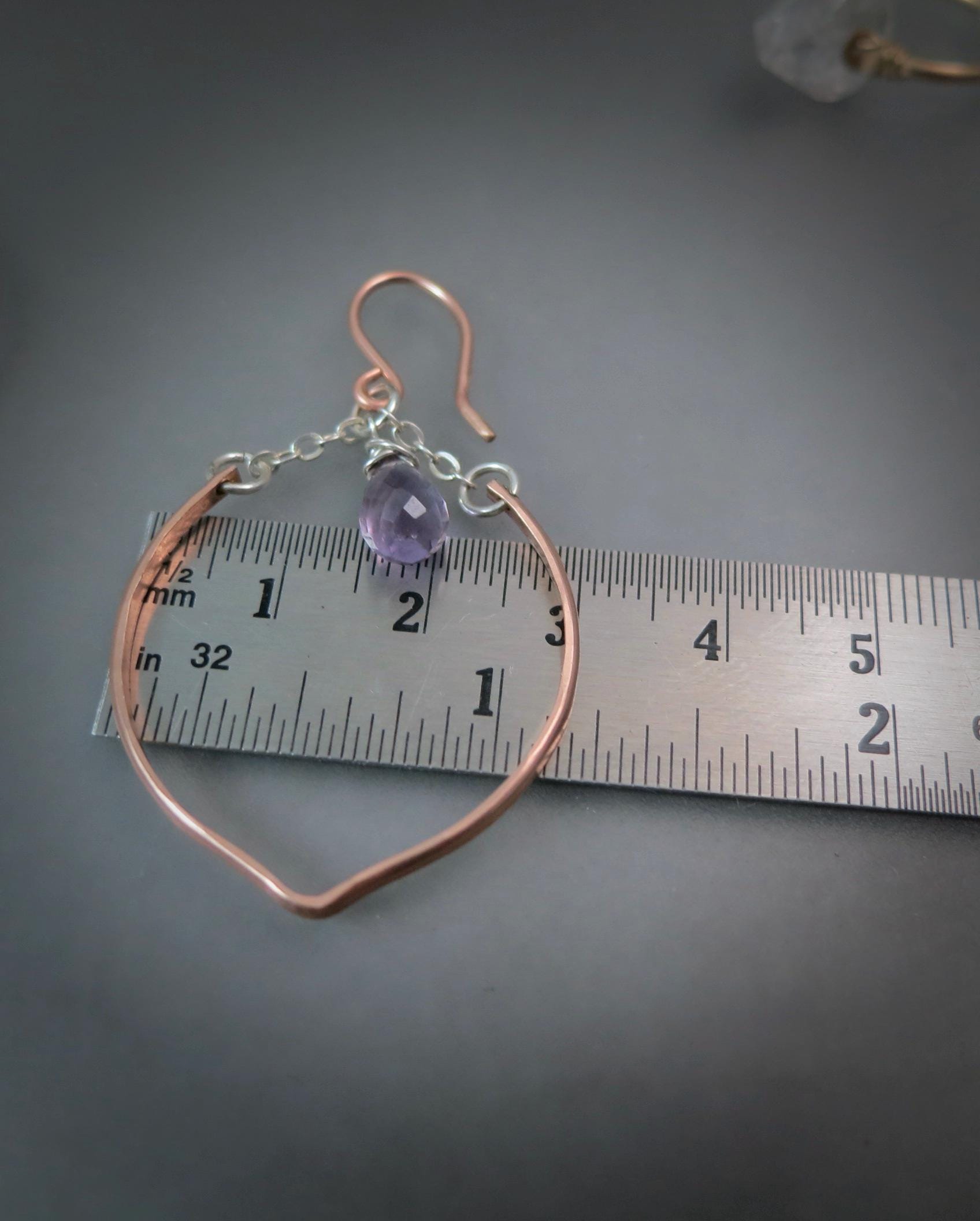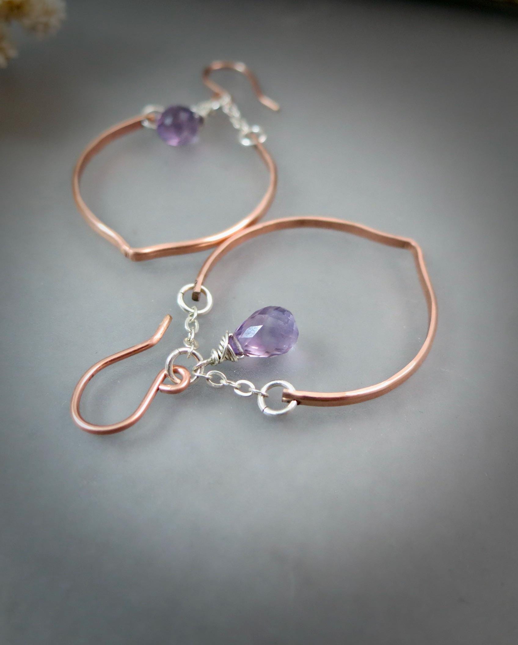 These handmade 14k rose gold filled hammered hoop earrings are a perfect blend of bold design and everyday comfort. Each hoop has been carefully hammered by hand, creating a textured, reflective surface that catches the light beautifully. Lightweight and versatile, the mix of warm rose gold with cool sterling silver give them a nice contrast while the sparkling amethyst adds a little sparkle. Handmade in the Siren Jewels studio, they combine artisan craftsmanship with minimalist elegance.