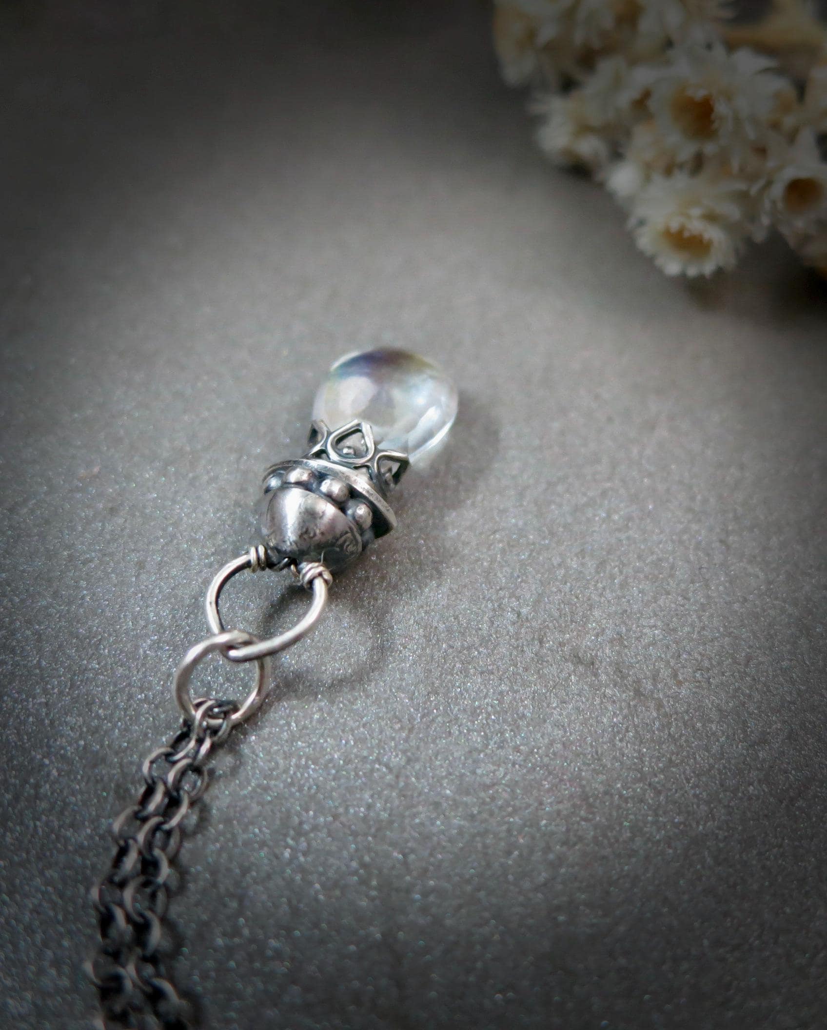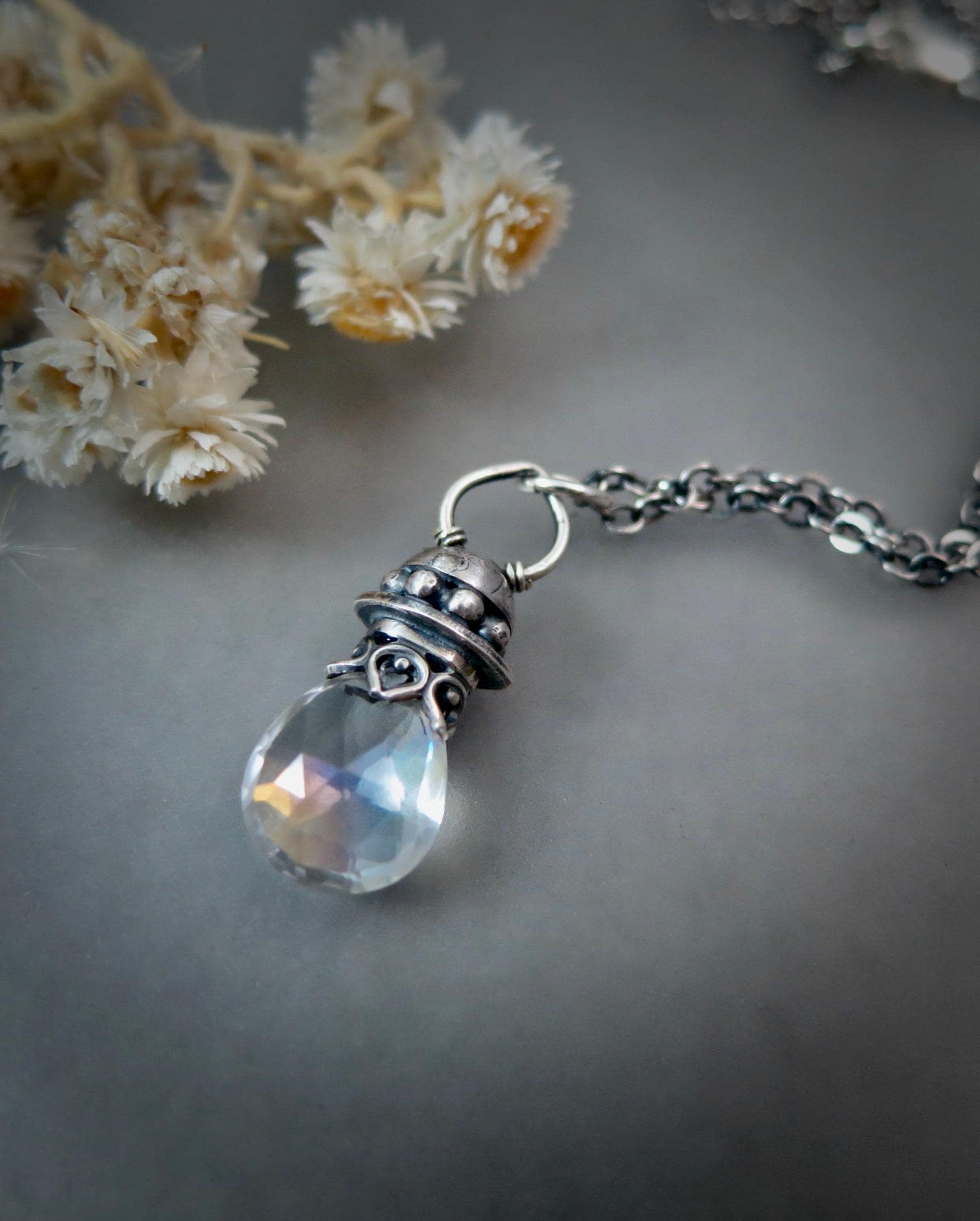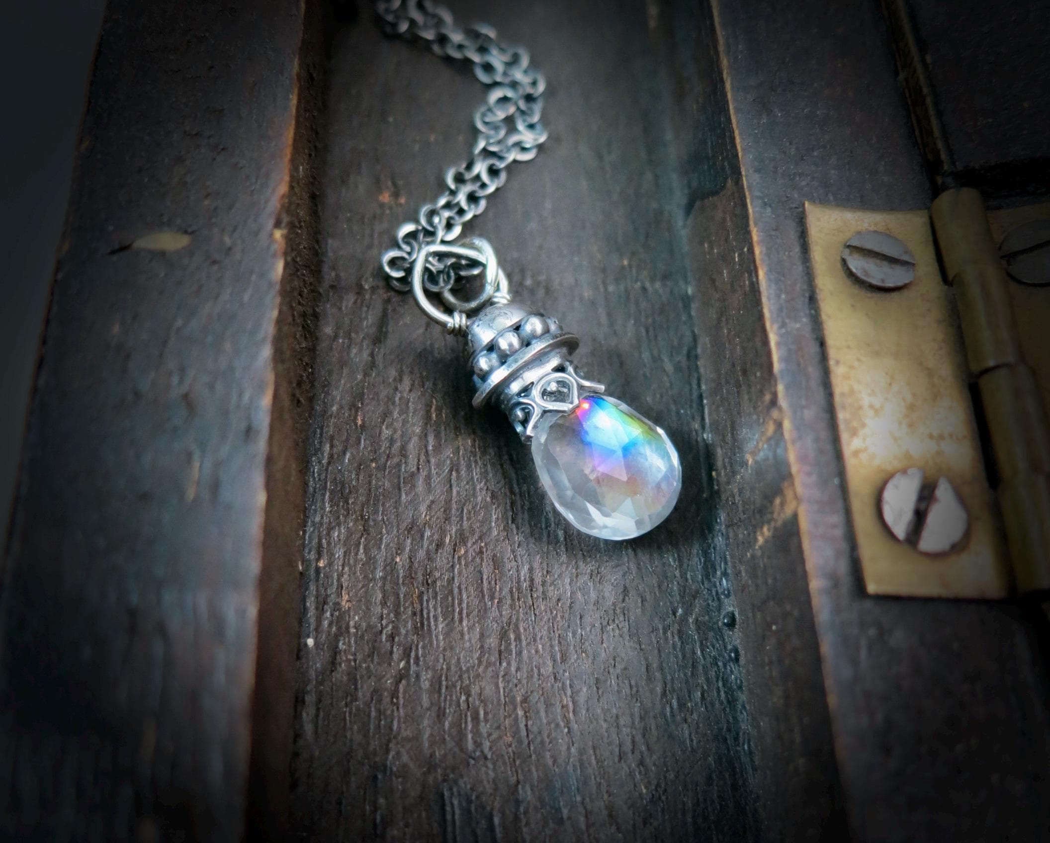 This pretty mystic quartz crystal has a little rainbow within. The gem hangs from a handmade sterling silver setting. The gem sparkles with many facets to catch the light. The silver surrounding the stone has been given a dark patina for that time worn look.
