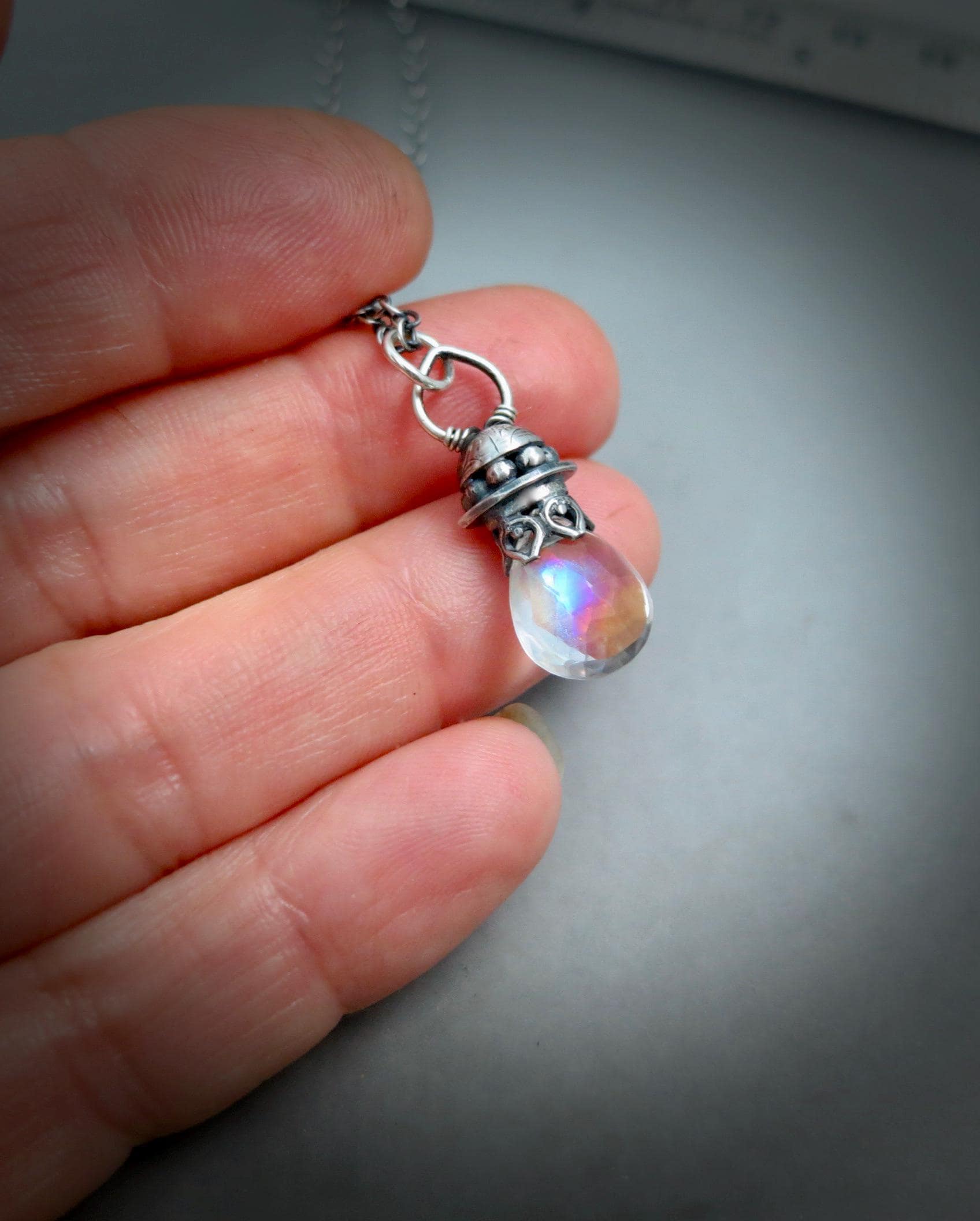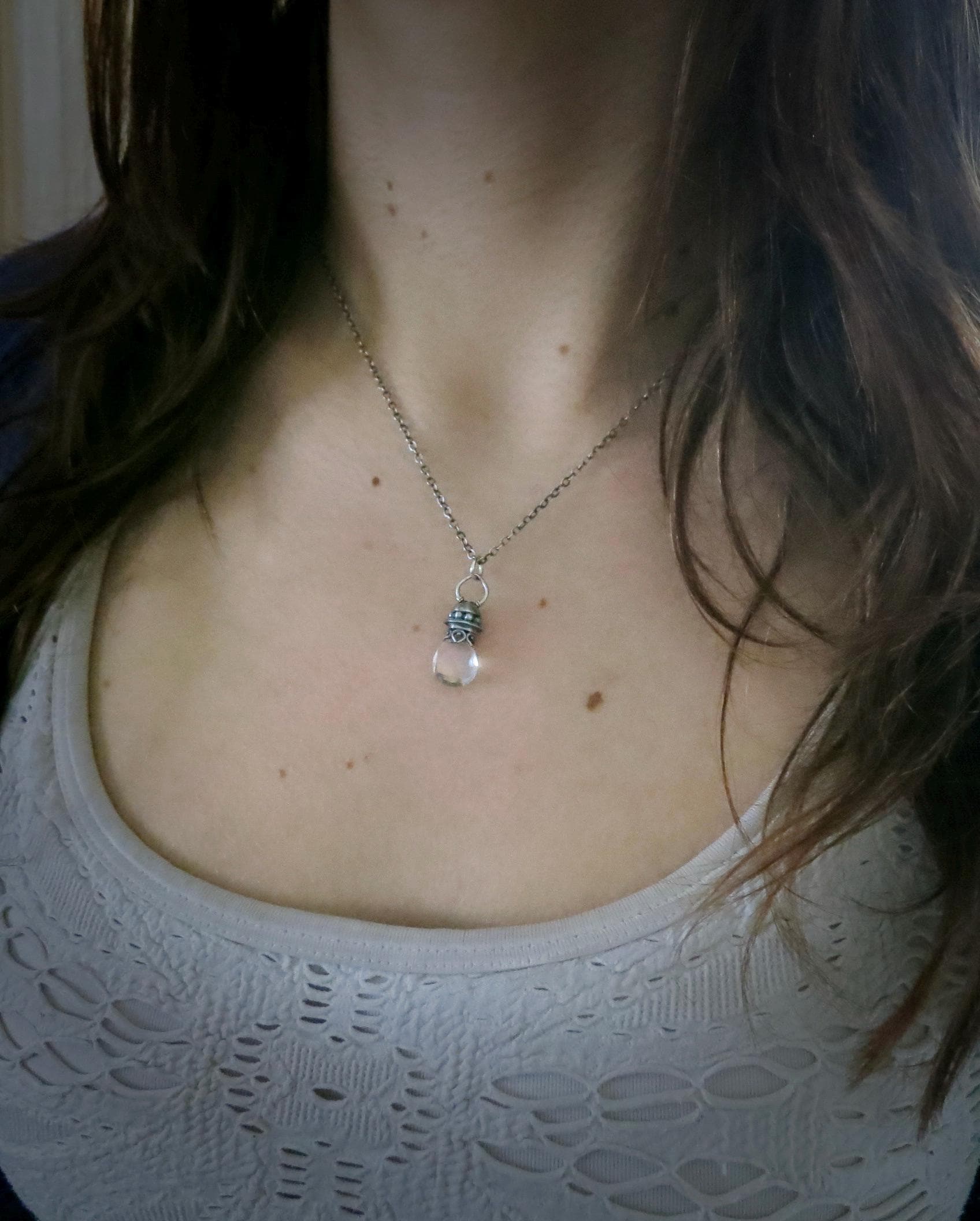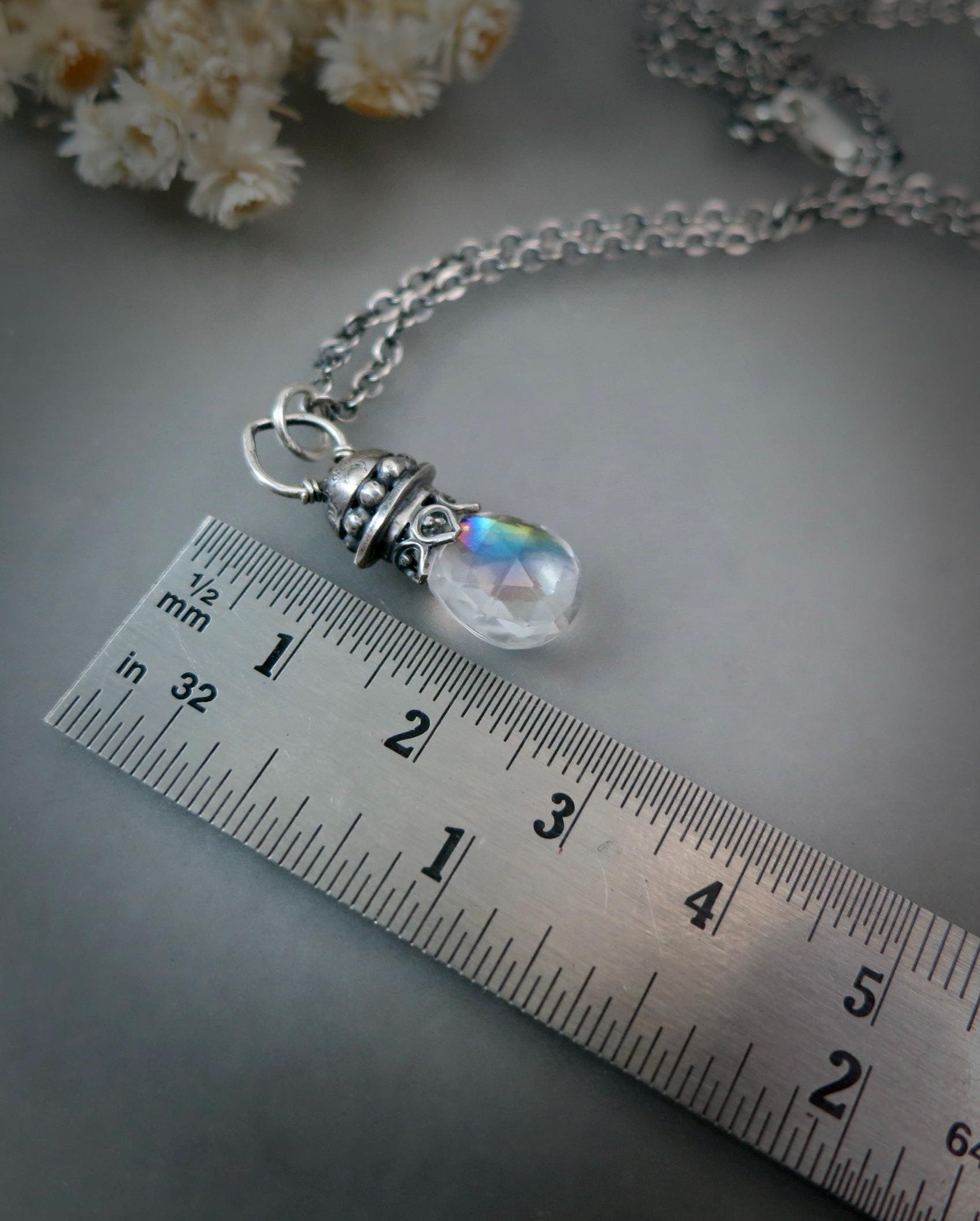 This pretty mystic quartz crystal has a little rainbow within. The gem hangs from a handmade sterling silver setting. The gem sparkles with many facets to catch the light. The silver surrounding the stone has been given a dark patina for that time worn look.