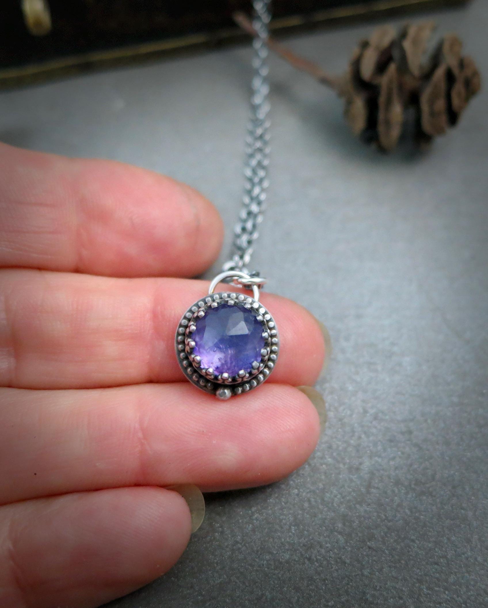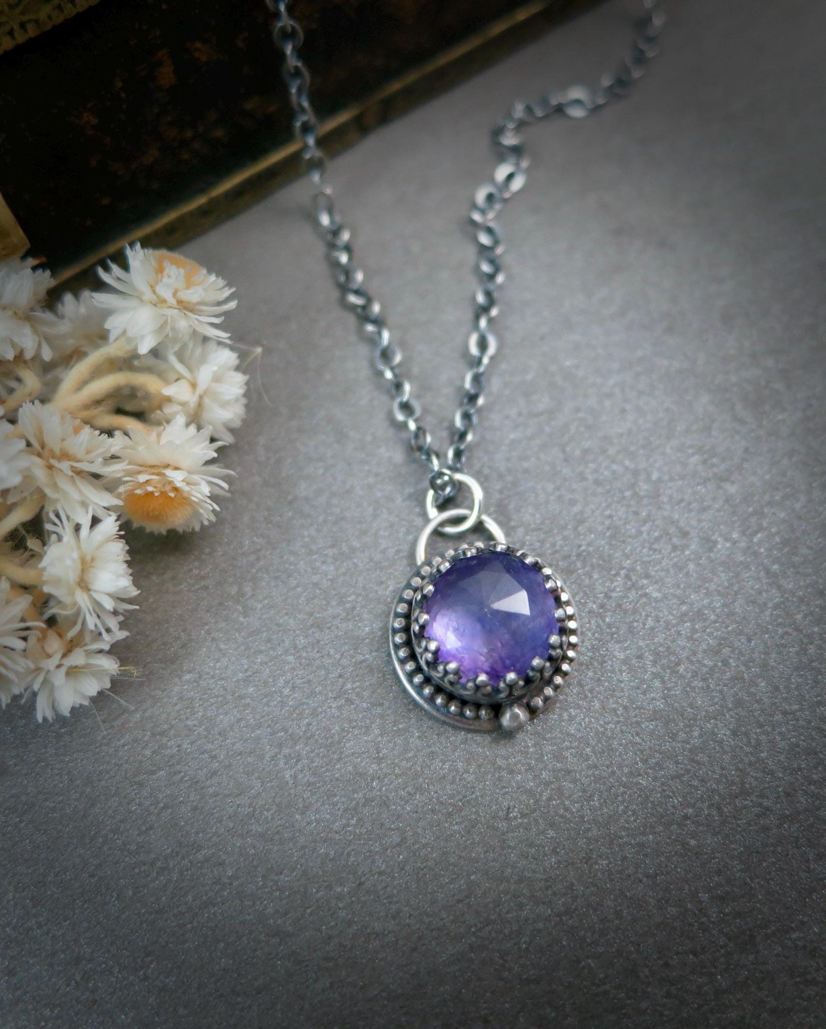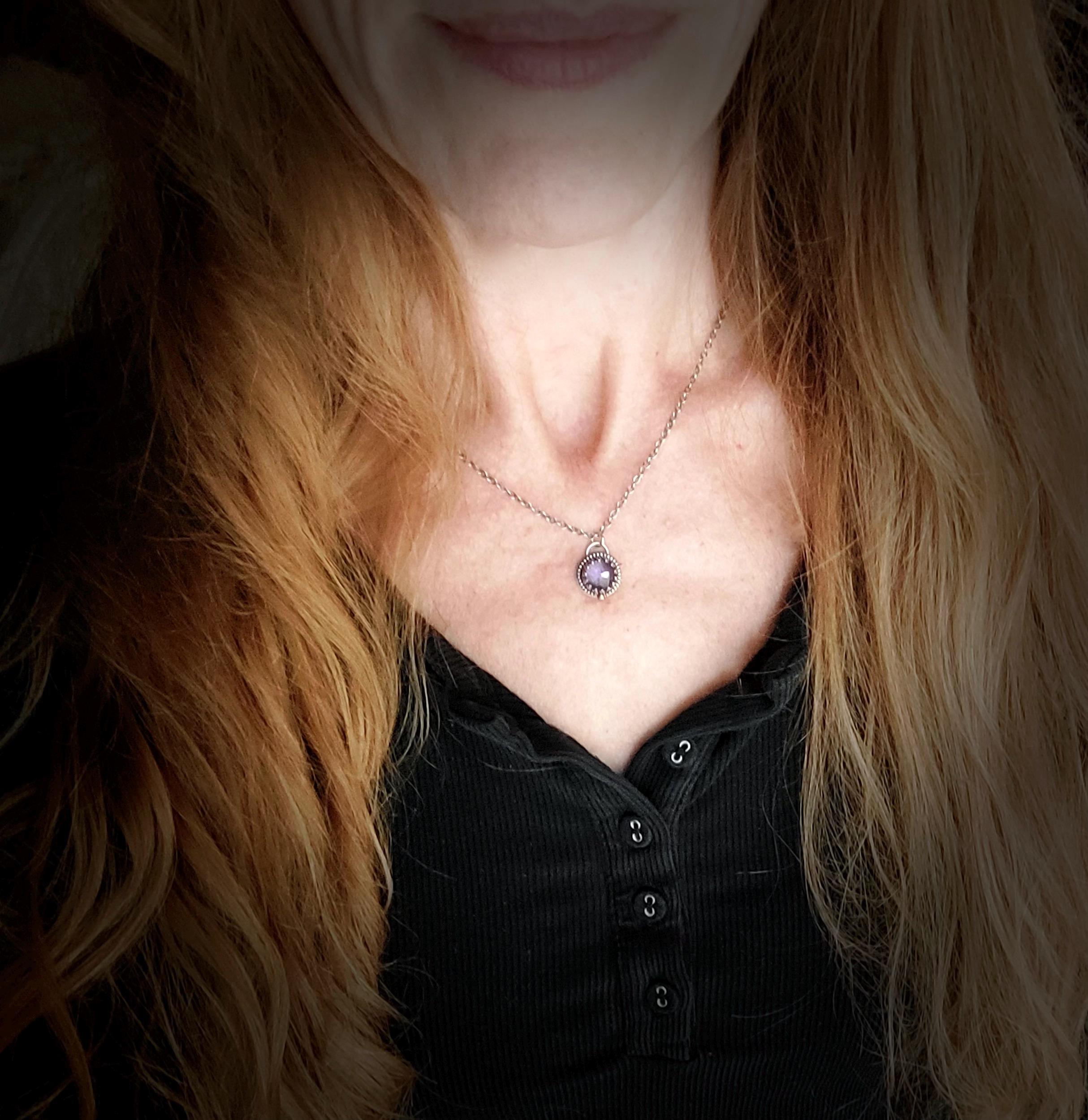 This rose cut amethyst gemstone has lots of facets to catch the light. The stone has been captured in delicate sterling silver filigree. The silver has been oxidized to add contrast and give that time worn look. The back of the pendant is stamped with my makers mark and 925. This tiny treasure hangs from a sterling silver chain. Amethyst is the Birthstone for February.