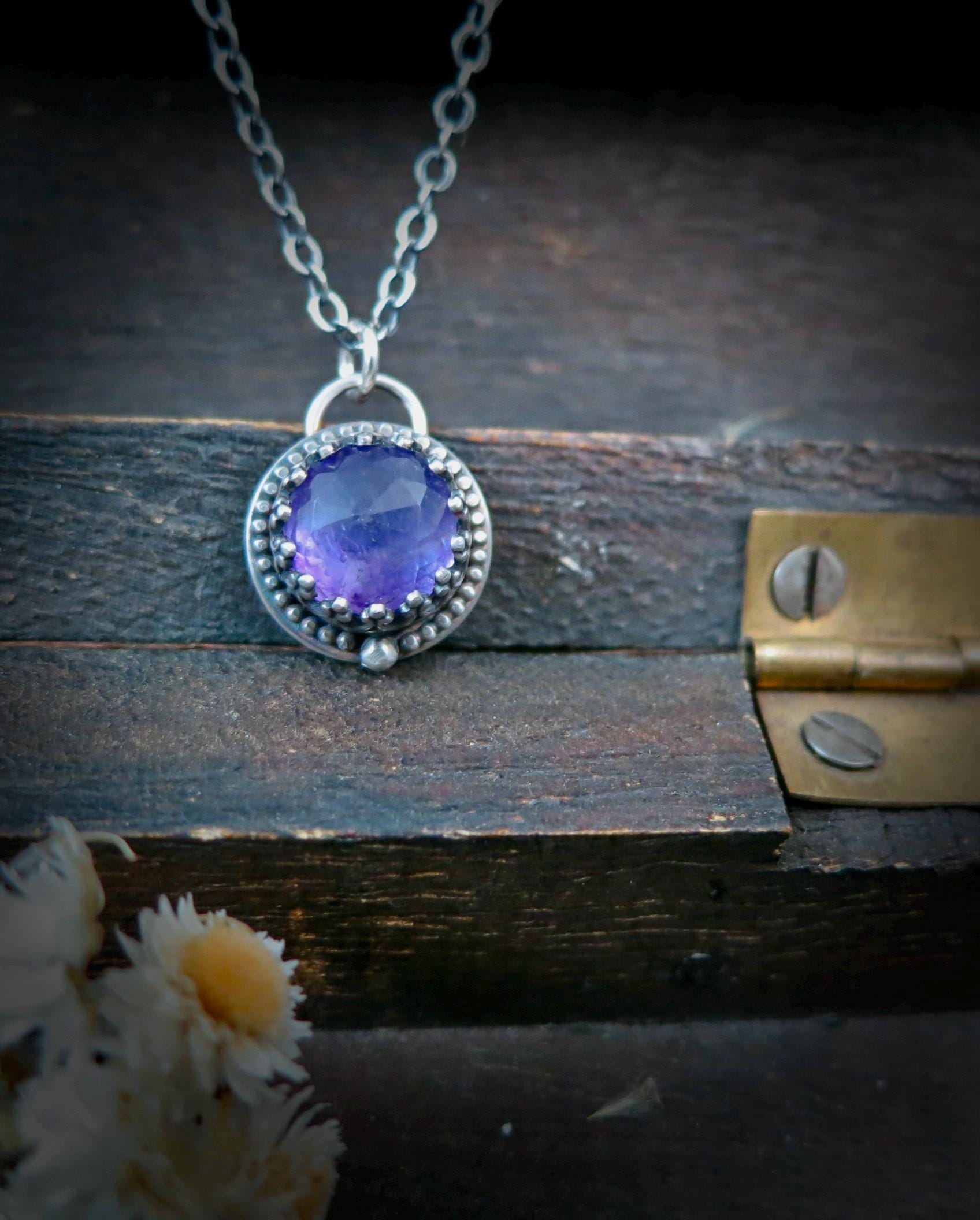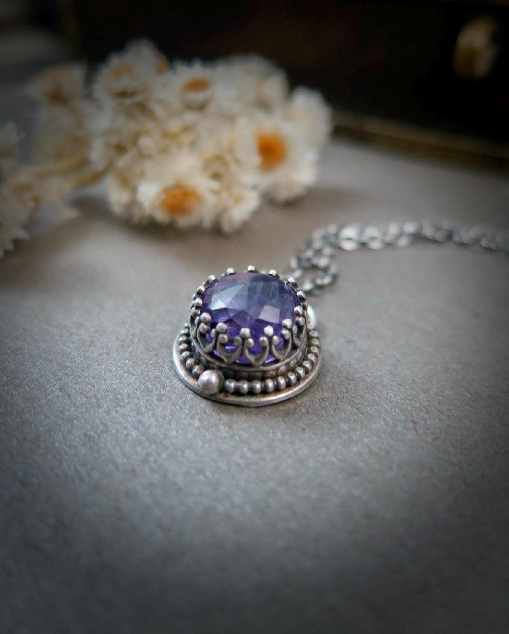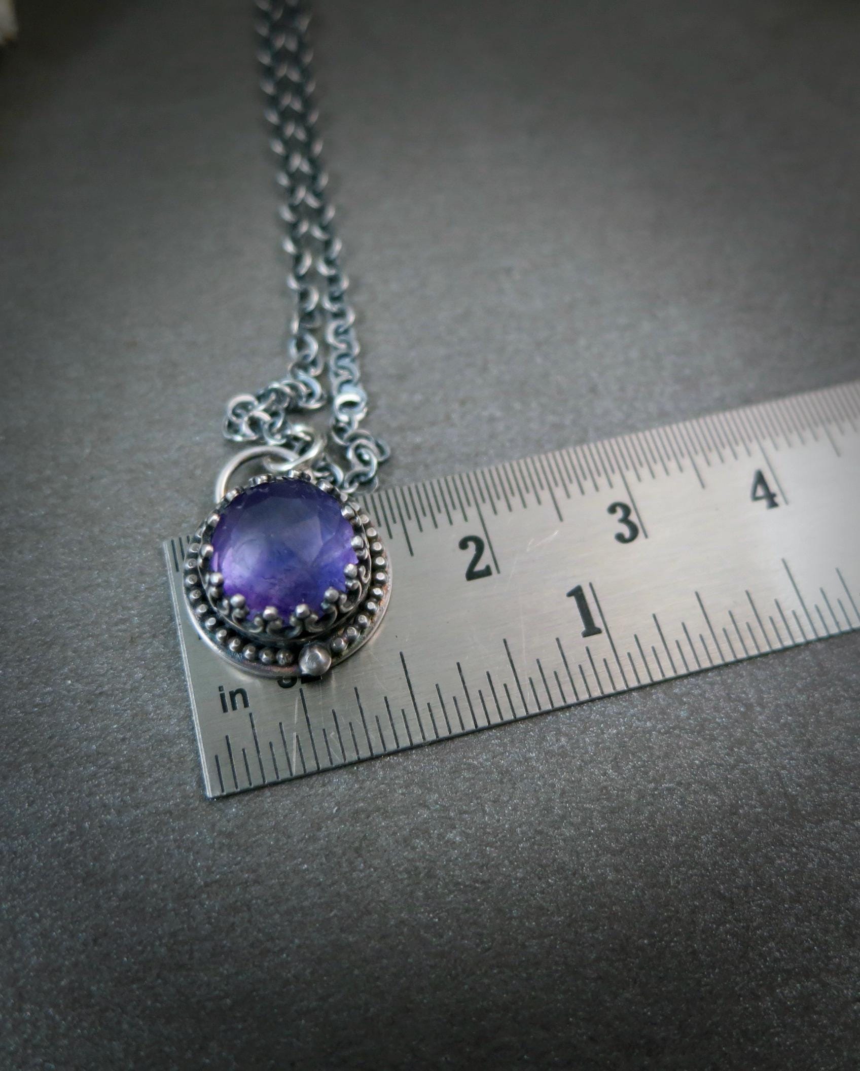This rose cut amethyst gemstone has lots of facets to catch the light. The stone has been captured in delicate sterling silver filigree. The silver has been oxidized to add contrast and give that time worn look. The back of the pendant is stamped with my makers mark and 925. This tiny treasure hangs from a sterling silver chain. Amethyst is the Birthstone for February.