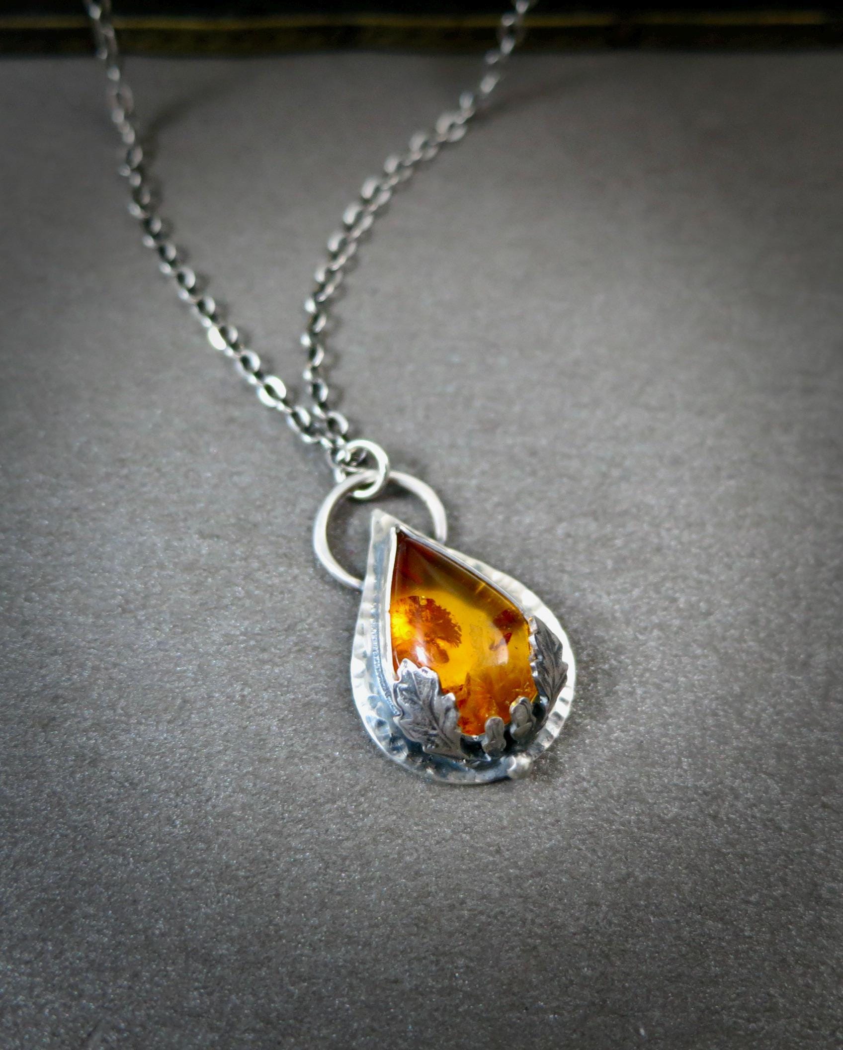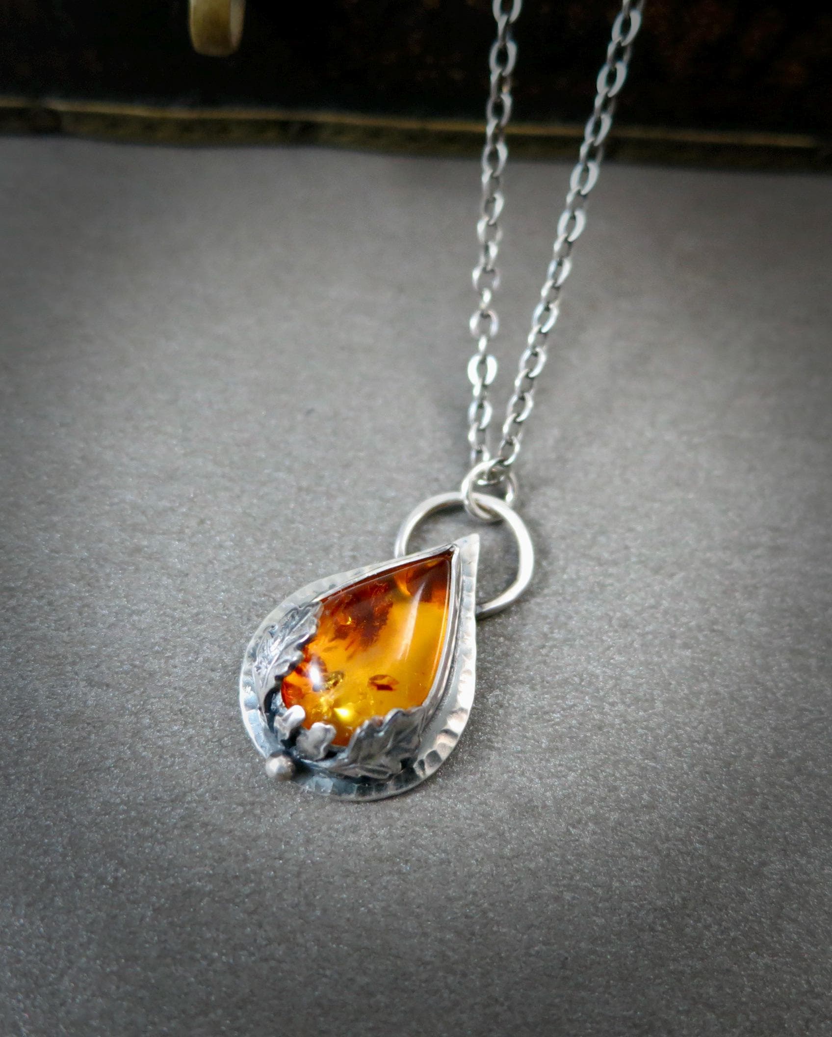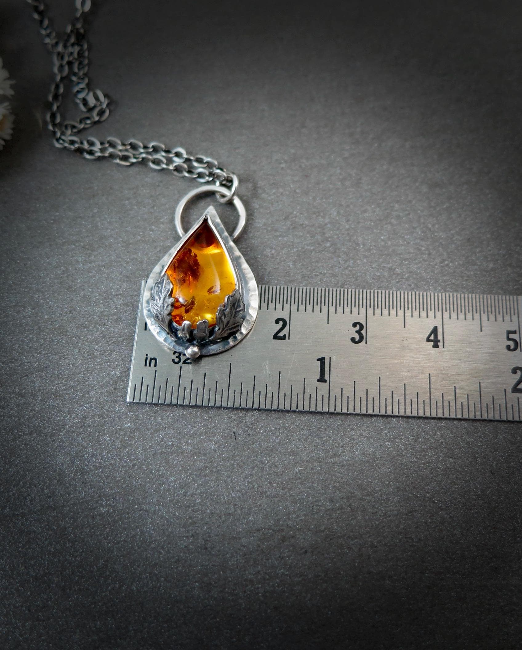 This amber droplet has shimmery inclusions trapped with in. The gem has been sterling silver with delicate oak leaves hugging the bottom of the stone. A drop of silver rest at the bottom of the stone with an arching hammered ring at the top. The back of the pendant has been stamped with 925 and my maker's mark. A beautiful gift for her, this amber necklace radiates natural warmth and timeless elegance.