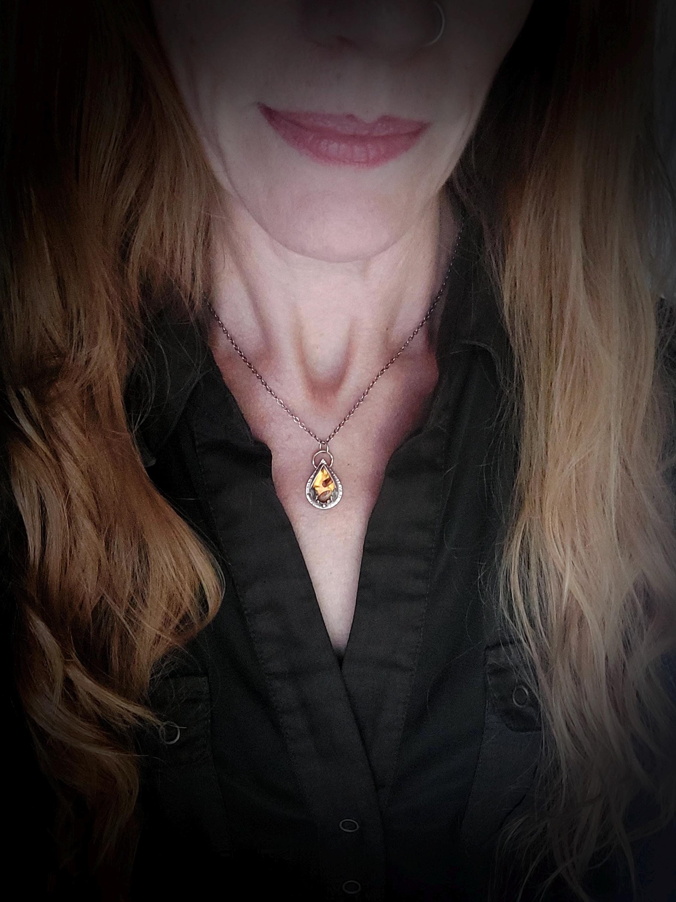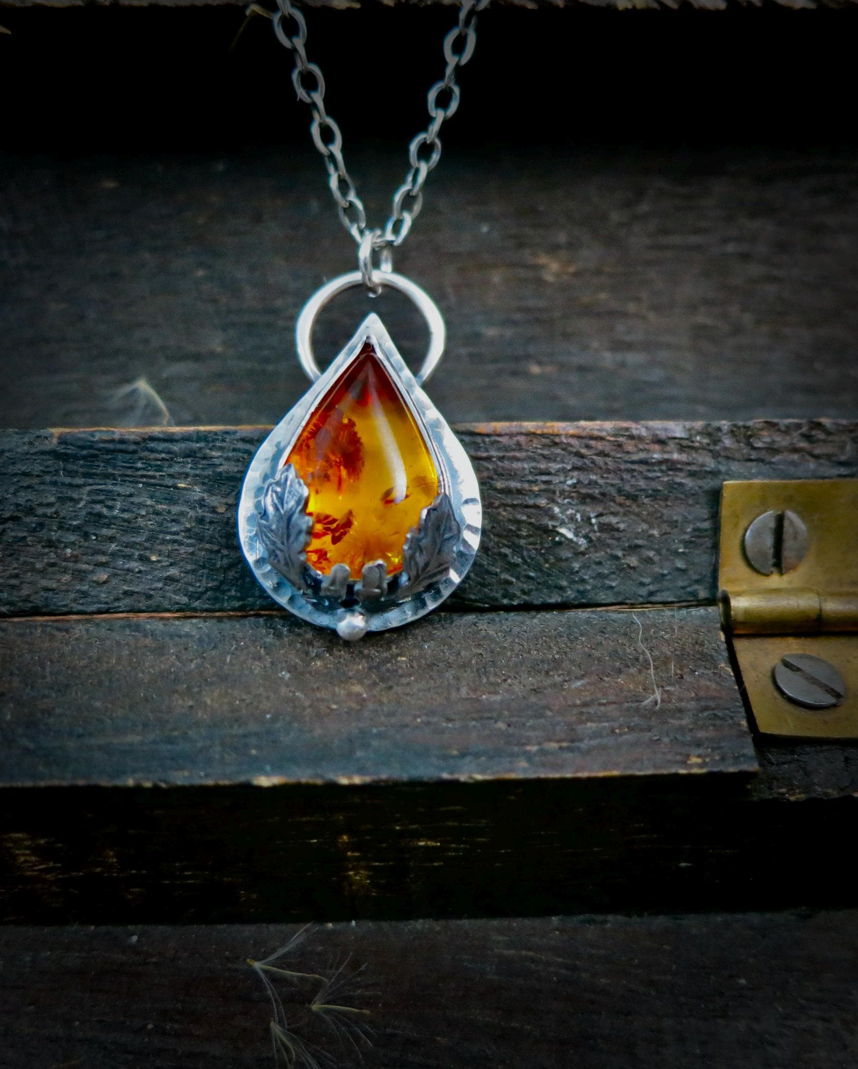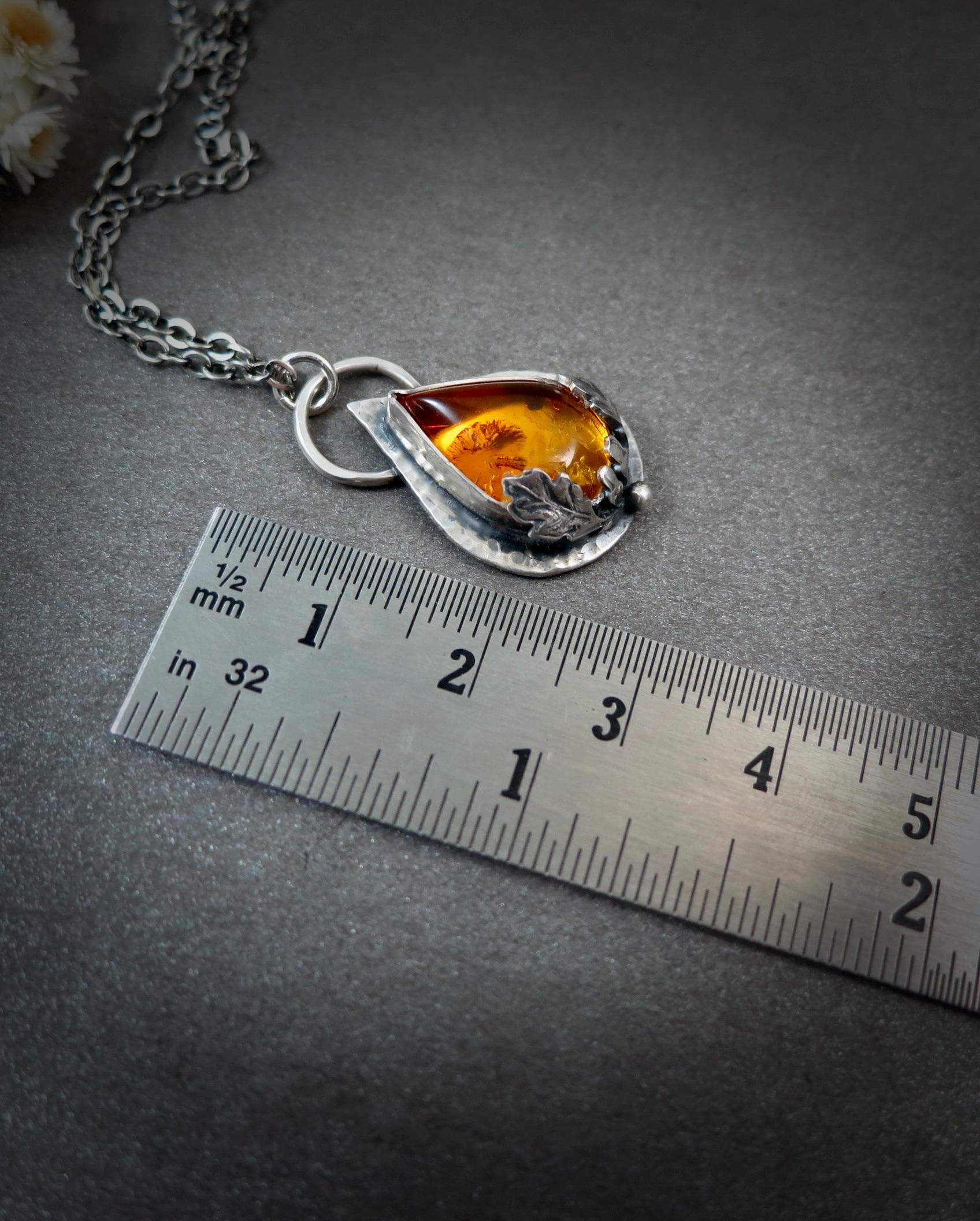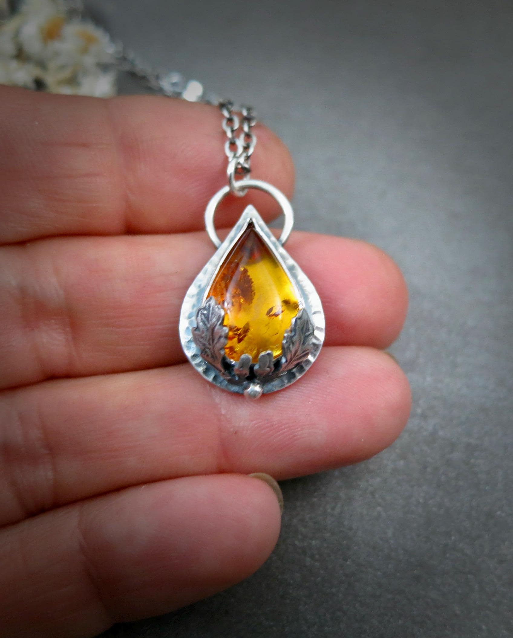 This amber droplet has shimmery inclusions trapped with in. The gem has been sterling silver with delicate oak leaves hugging the bottom of the stone. A drop of silver rest at the bottom of the stone with an arching hammered ring at the top. The back of the pendant has been stamped with 925 and my maker's mark. A beautiful gift for her, this amber necklace radiates natural warmth and timeless elegance.