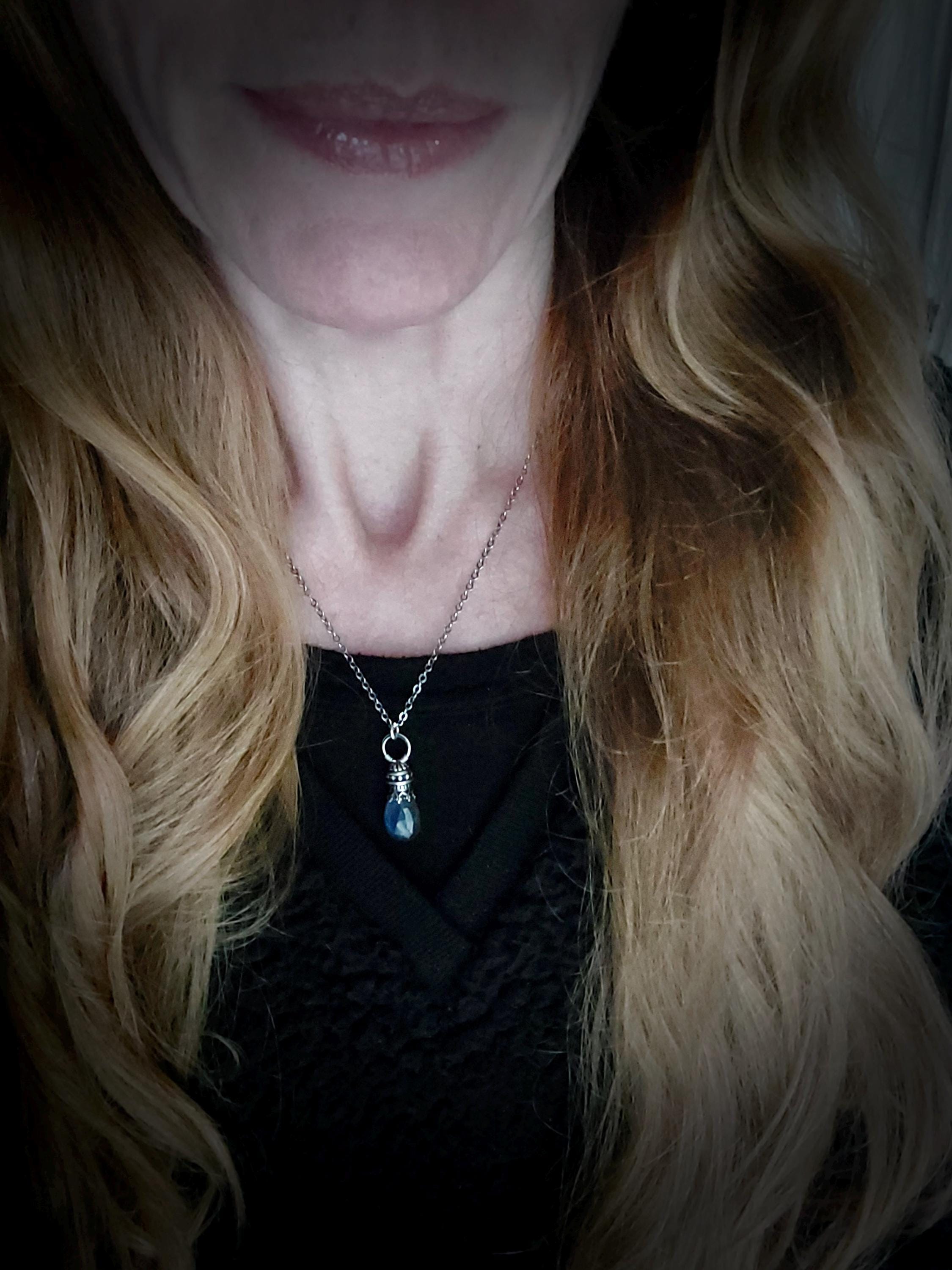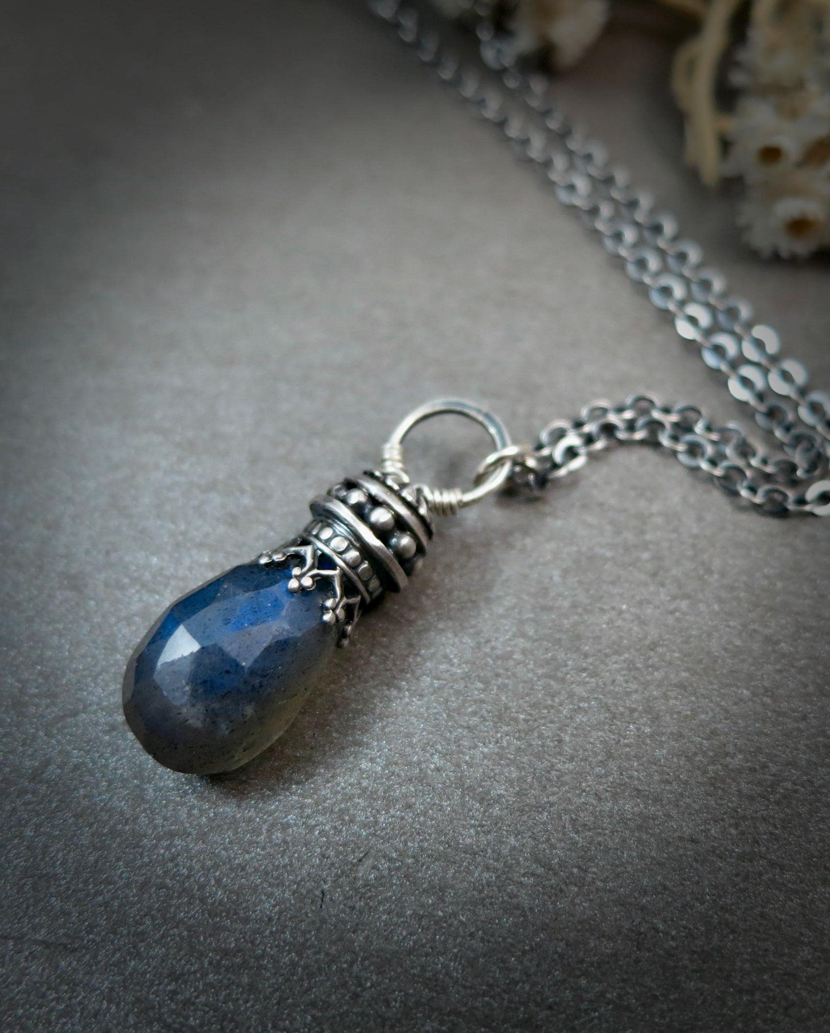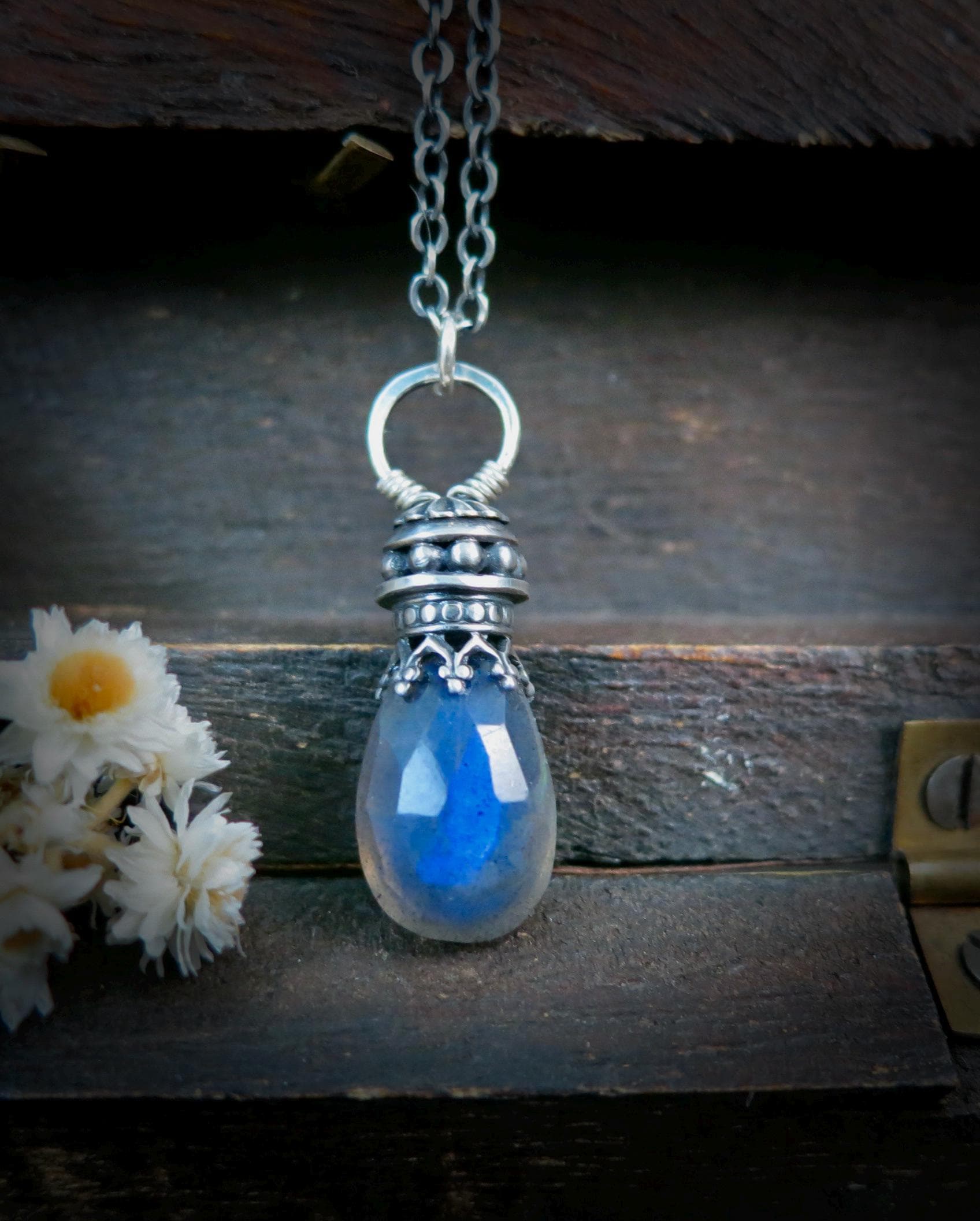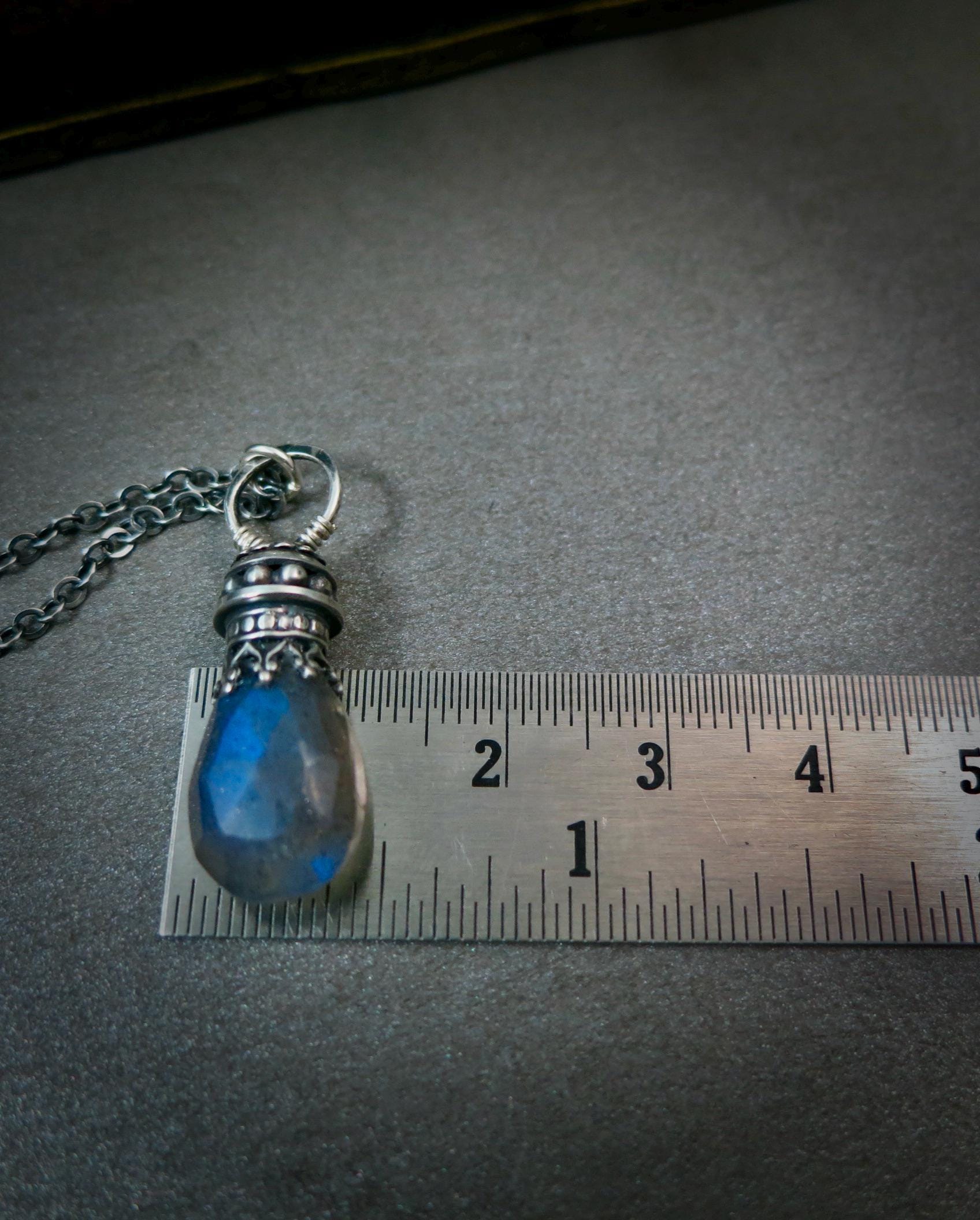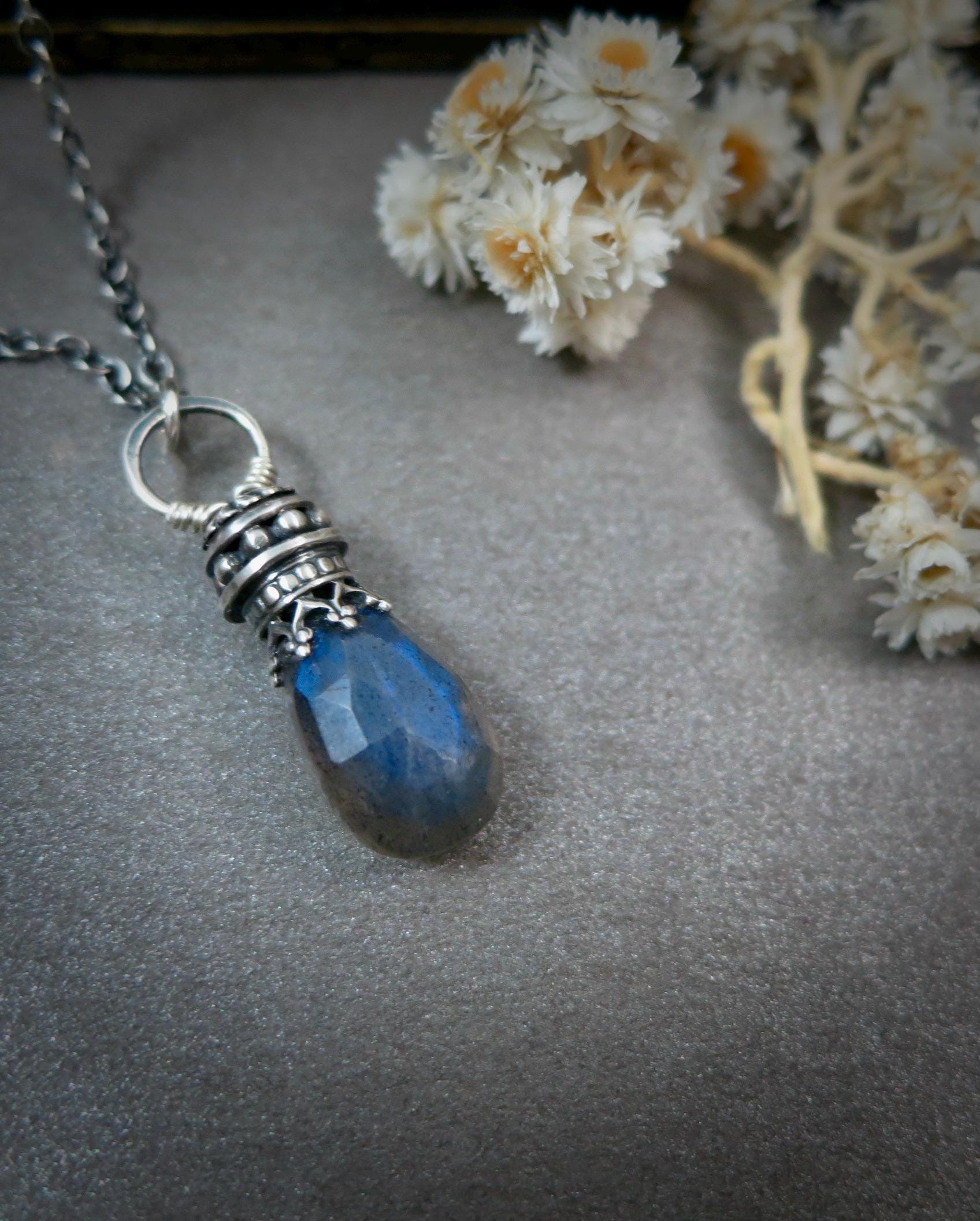 This sterling silver and labradorite has been set in a handmade, finely detailed sterling silver embellishment. The stone glows with hues of watery blue when struck with the light. The setting has been lightly antiqued to add drama and contrast. The pendant is open on both sides. Comes is a stylish gift box, a perfect gift for you or someone else.