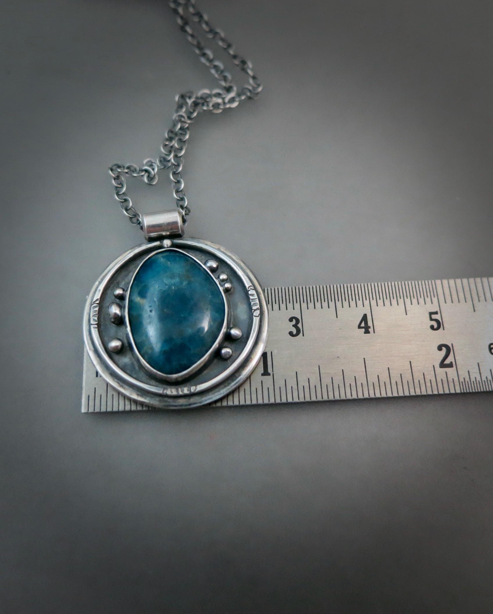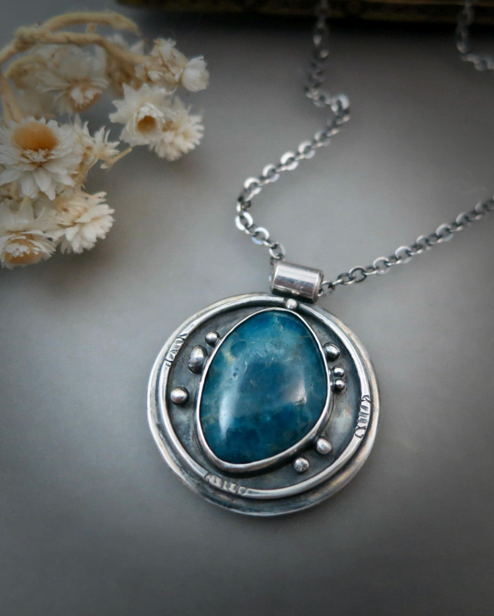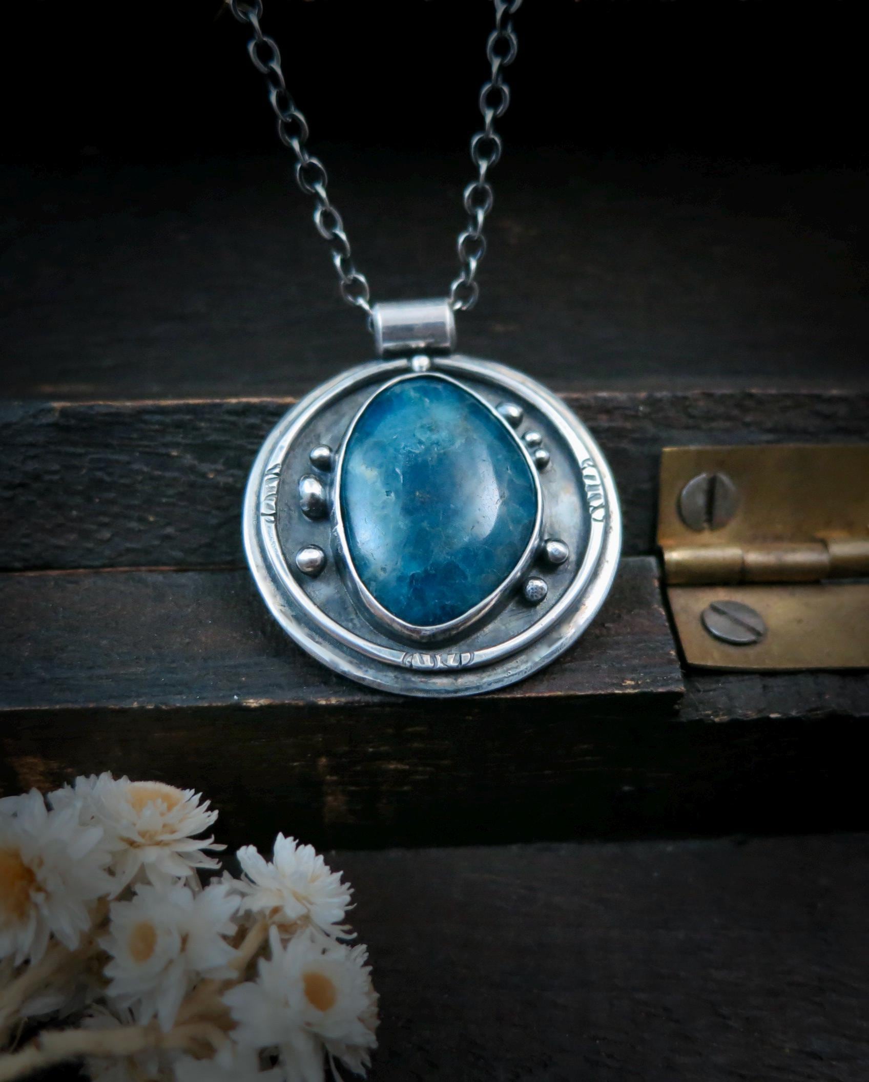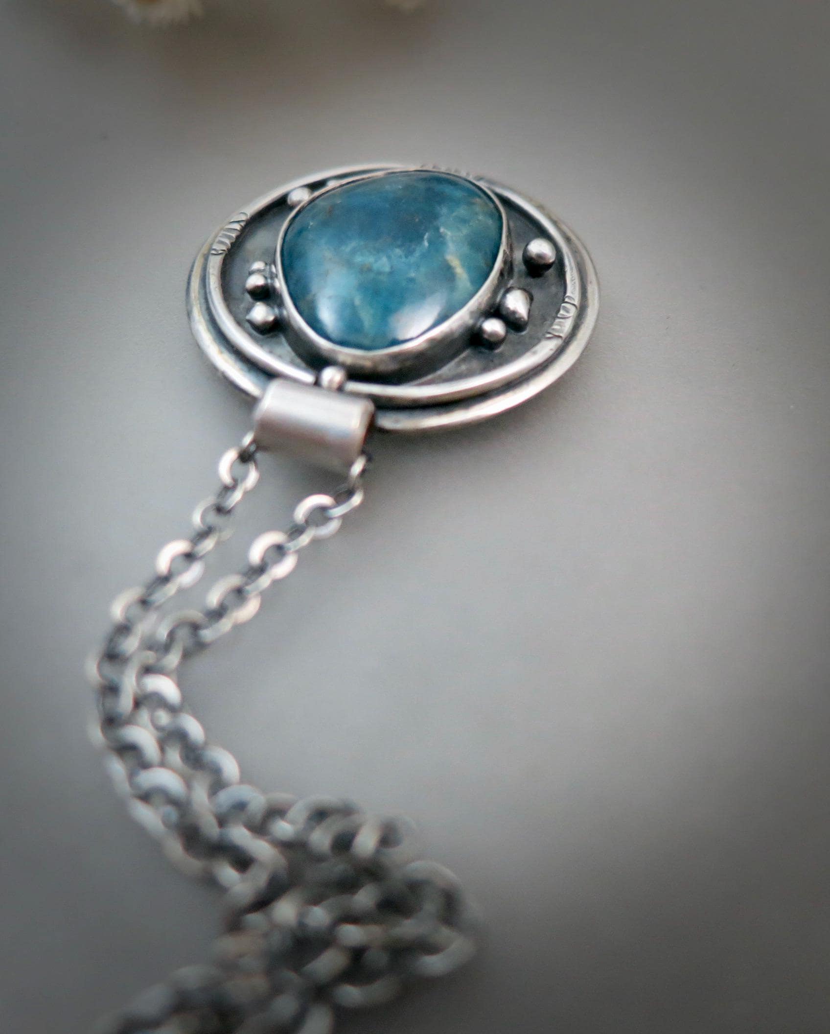 This smooth apatite gemstone is surrounded with eight tiny drops of sterling silver. The angel number eight symbolizes new beginnings, regeneration, abundance and eternity. The backdrop of the pendant has been given a rich dark patina to add contrast to the bright silver details. The back of the pendant has been roller printed with a sacred geometry design. The center has been stamped with a my maker's mark and 925.