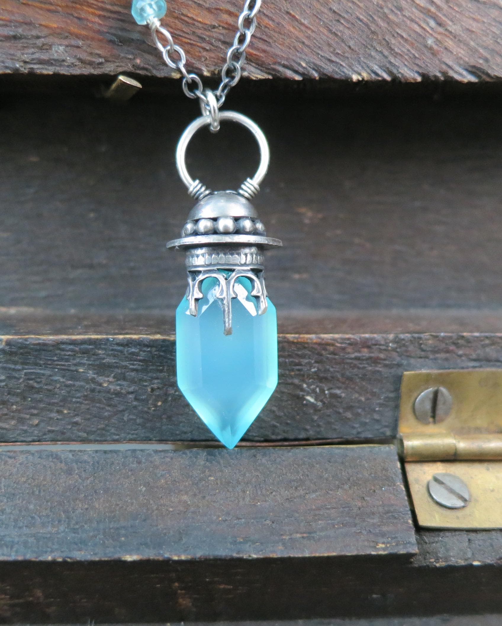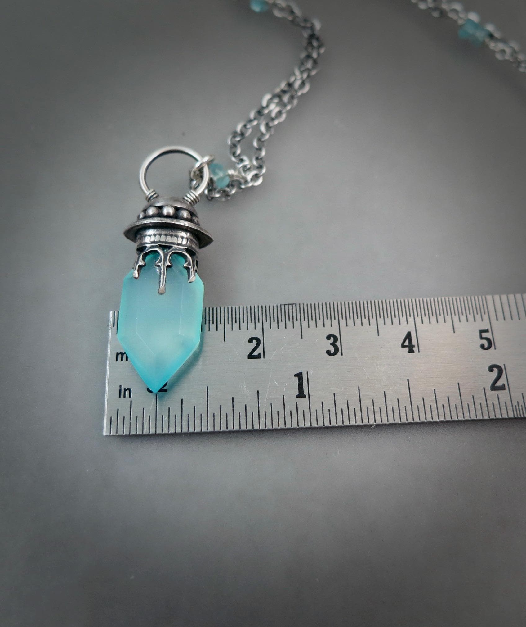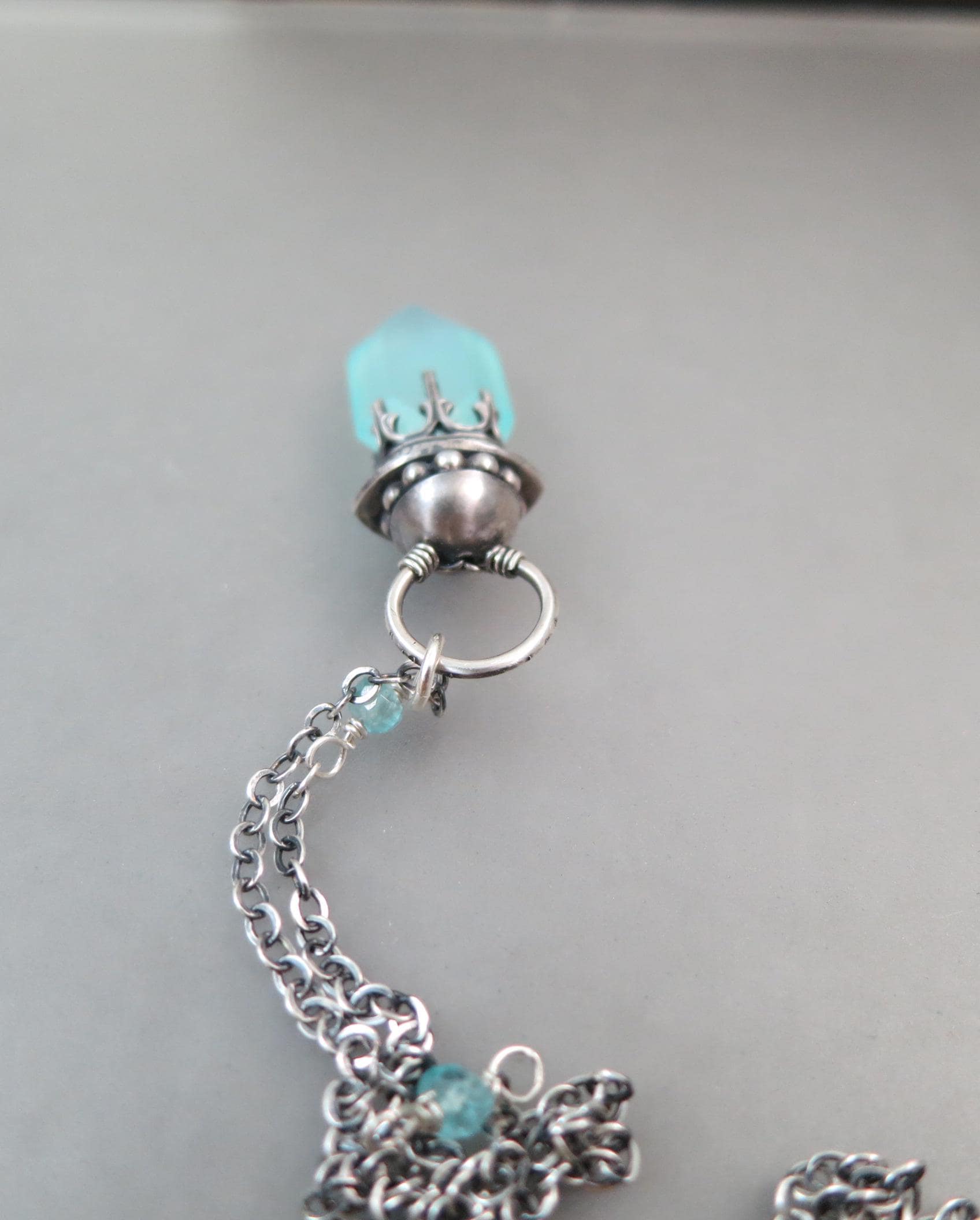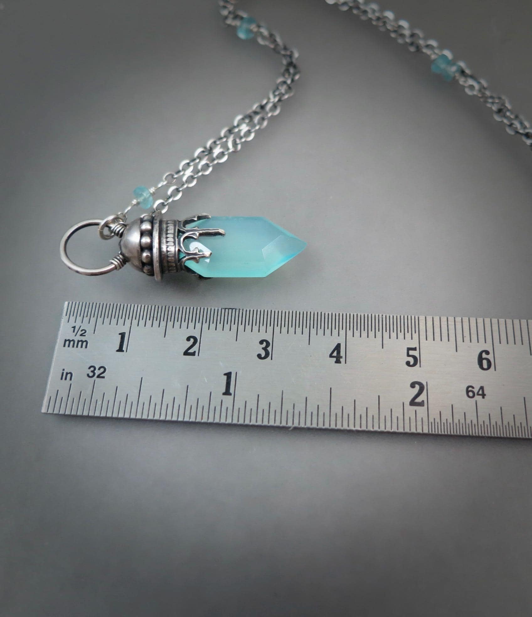 This calming pendulum pendant features a aqua blue chalcedony.. The stone hangs from a handmade, finely detailed sterling silver embellishment. The setting has been lightly antiqued to add drama and contrast. The pendant hangs from a sterling silver chain with apatite accent beads. The pendant is open on both sides.
