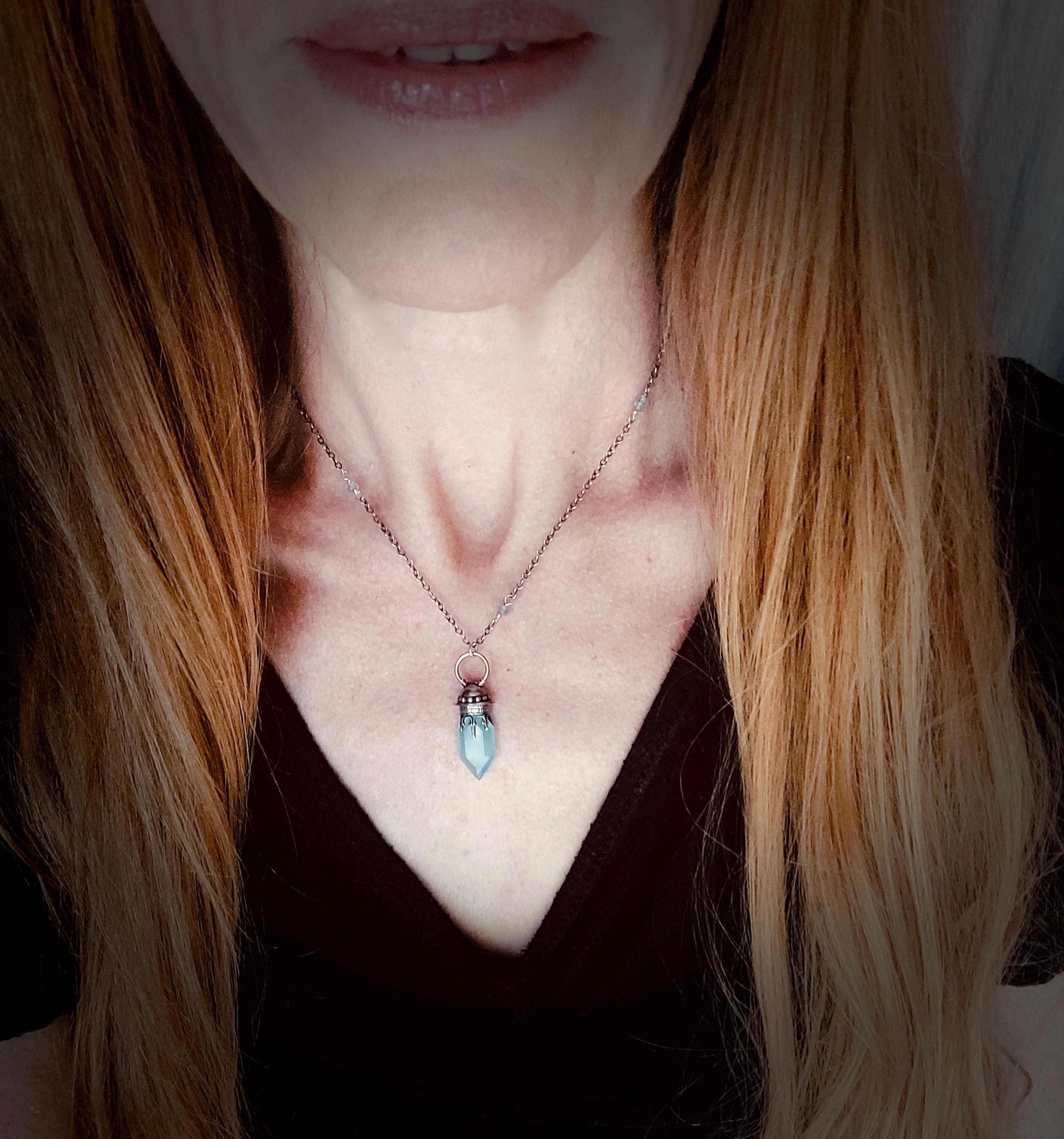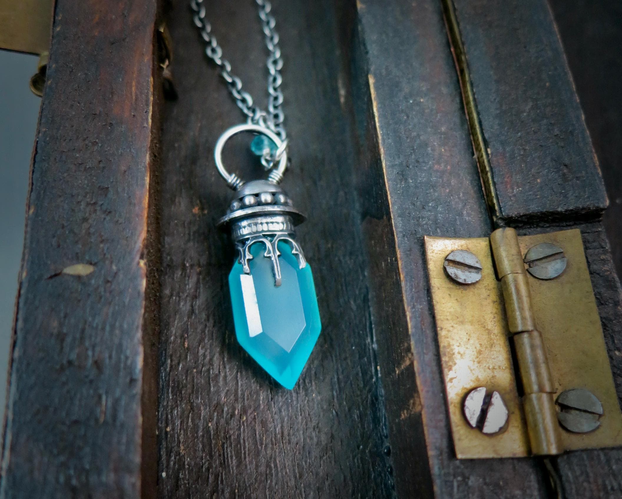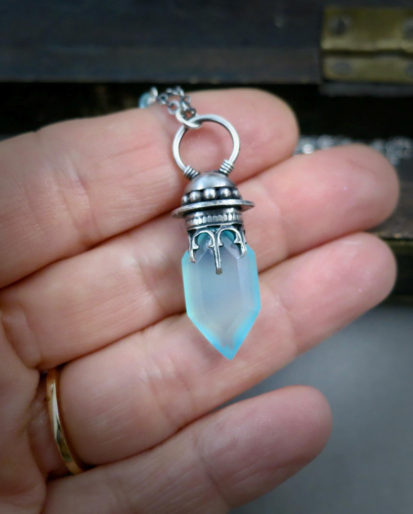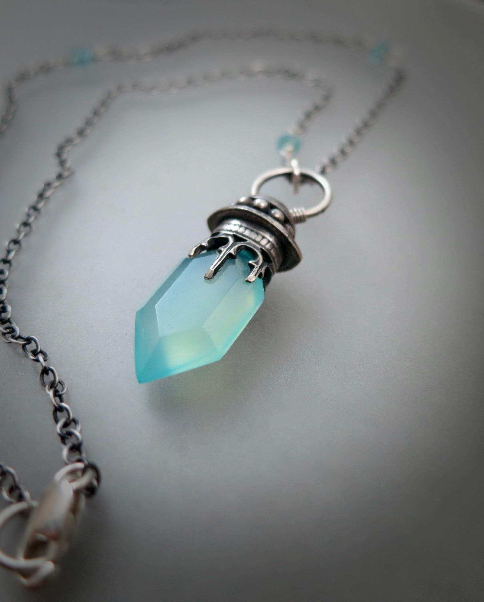 This calming pendulum pendant features a aqua blue chalcedony.. The stone hangs from a handmade, finely detailed sterling silver embellishment. The setting has been lightly antiqued to add drama and contrast. The pendant hangs from a sterling silver chain with apatite accent beads. The pendant is open on both sides.