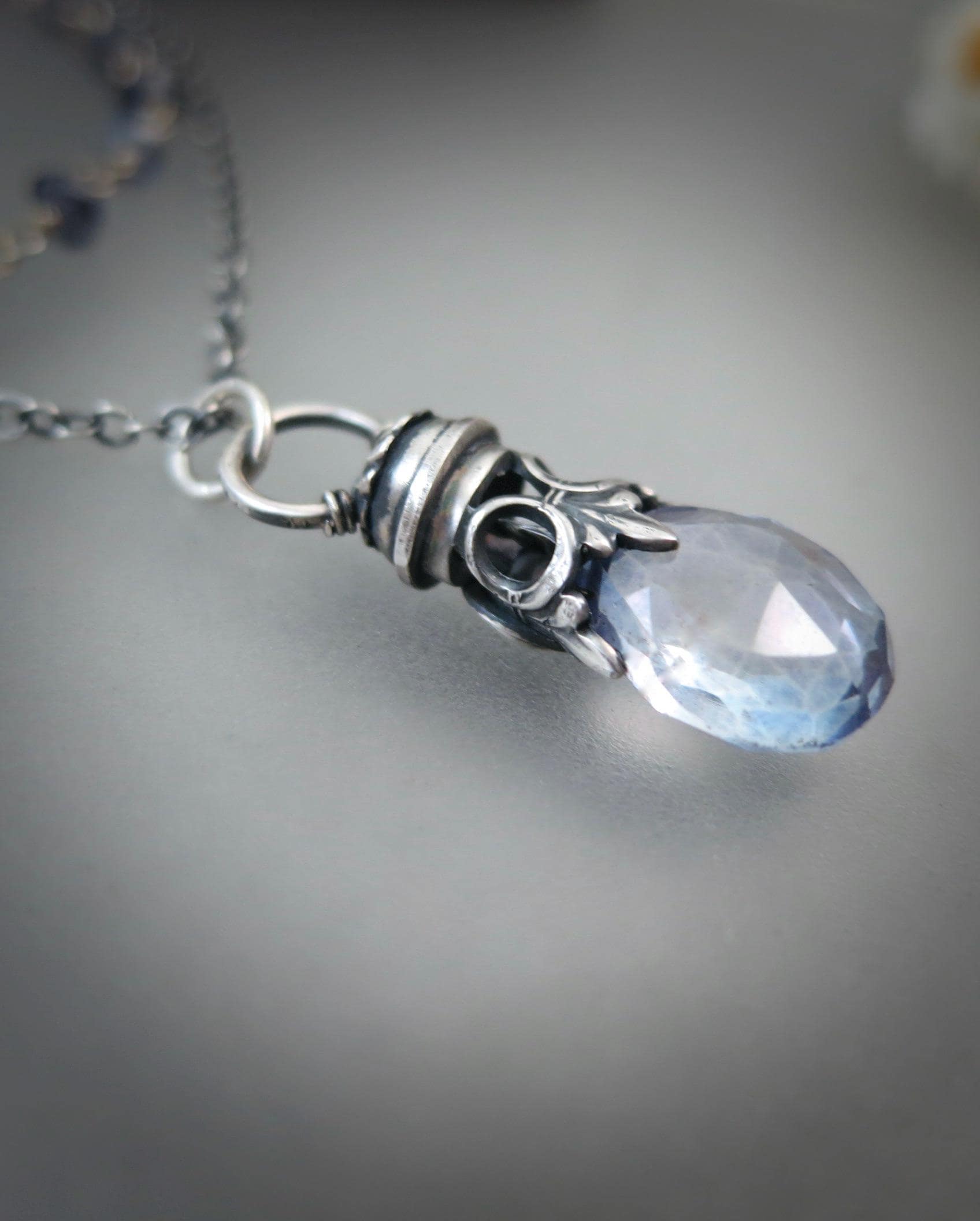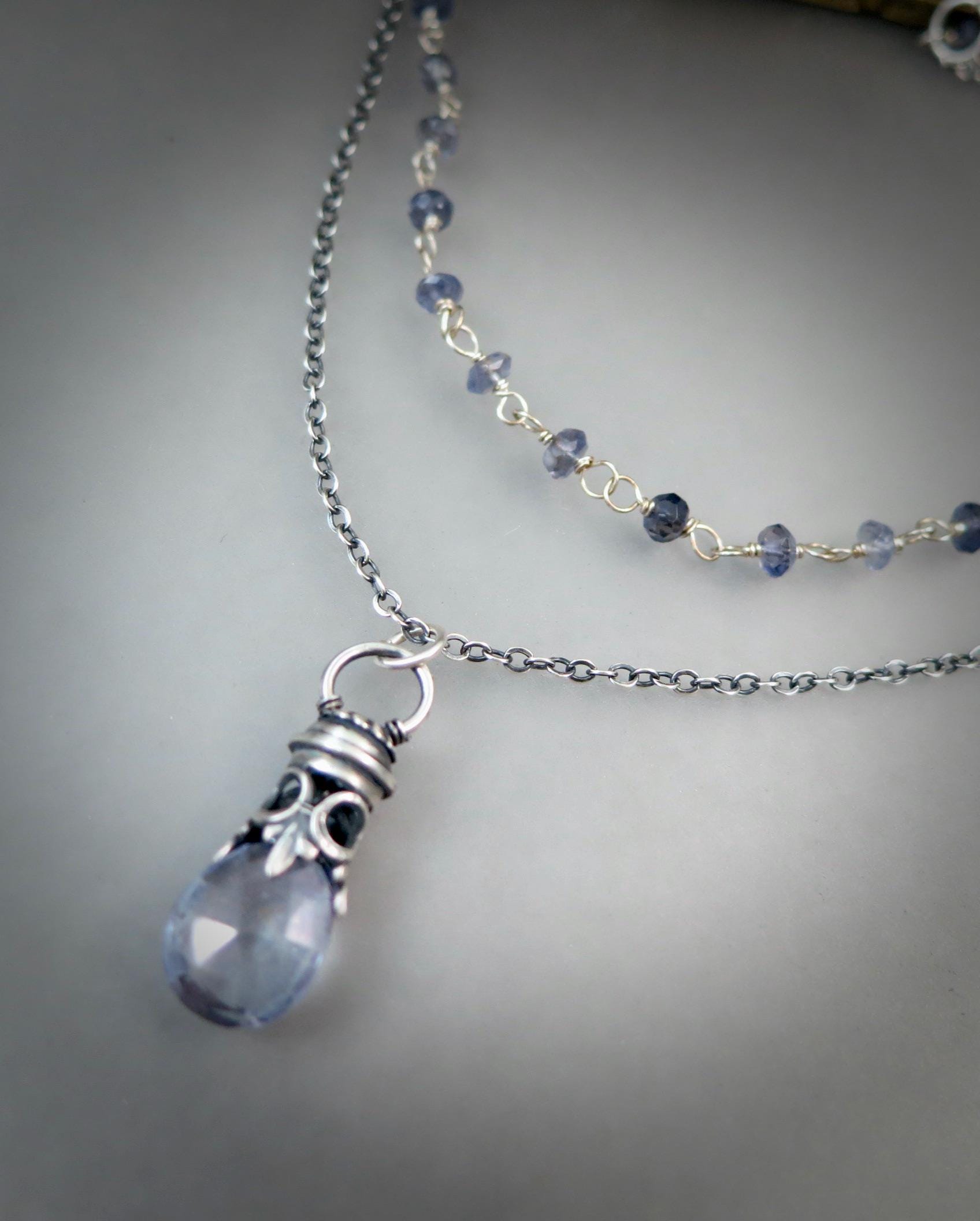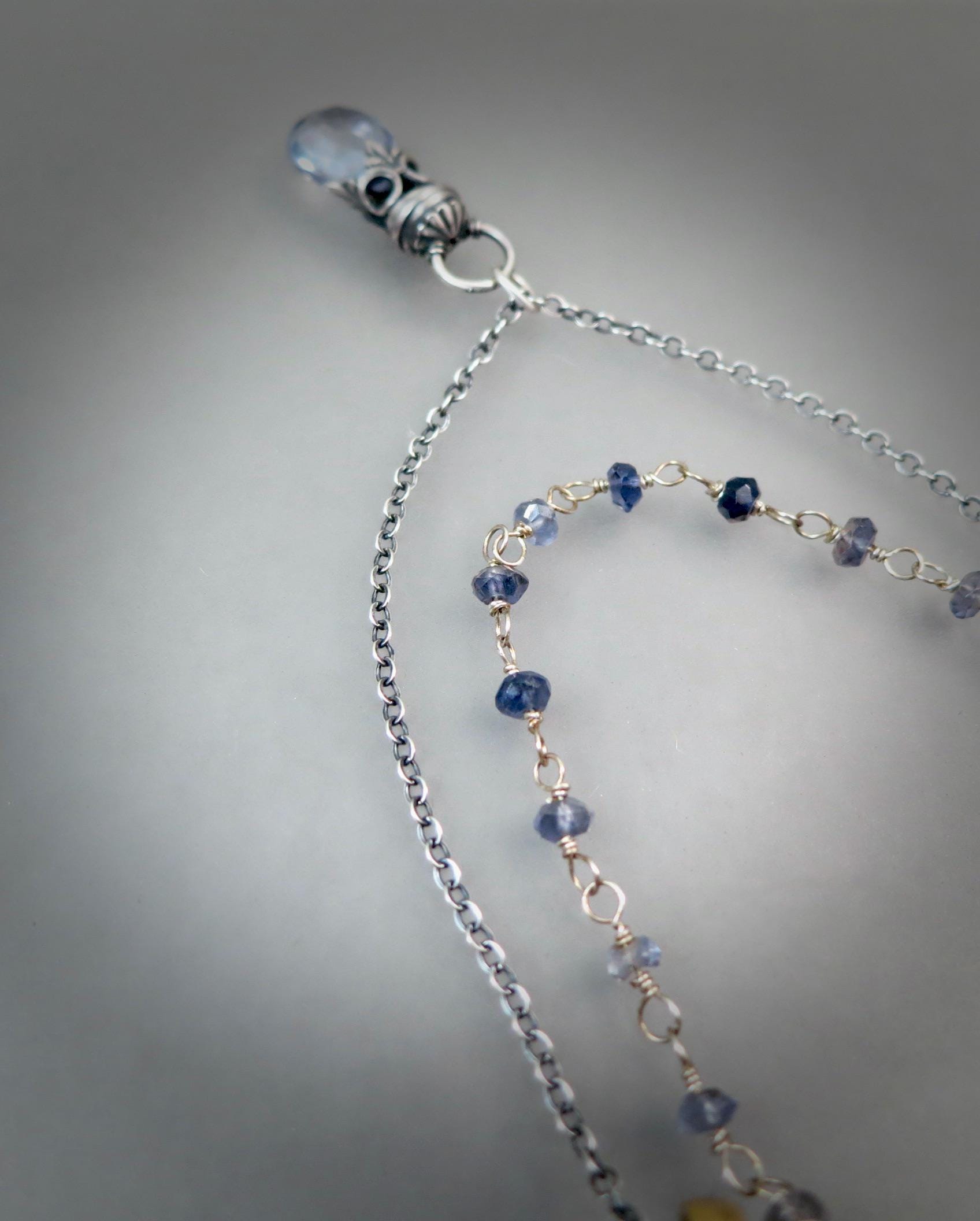 This charming little pendant features a faceted blue quartz gemstone. The stone hangs from a handmade, finely detailed sterling silver embellishment. The setting has been lightly antiqued to add drama and contrast. A second hand beaded strand of iolite that floats above the pendant. The chains are joined together with delicate loops.
