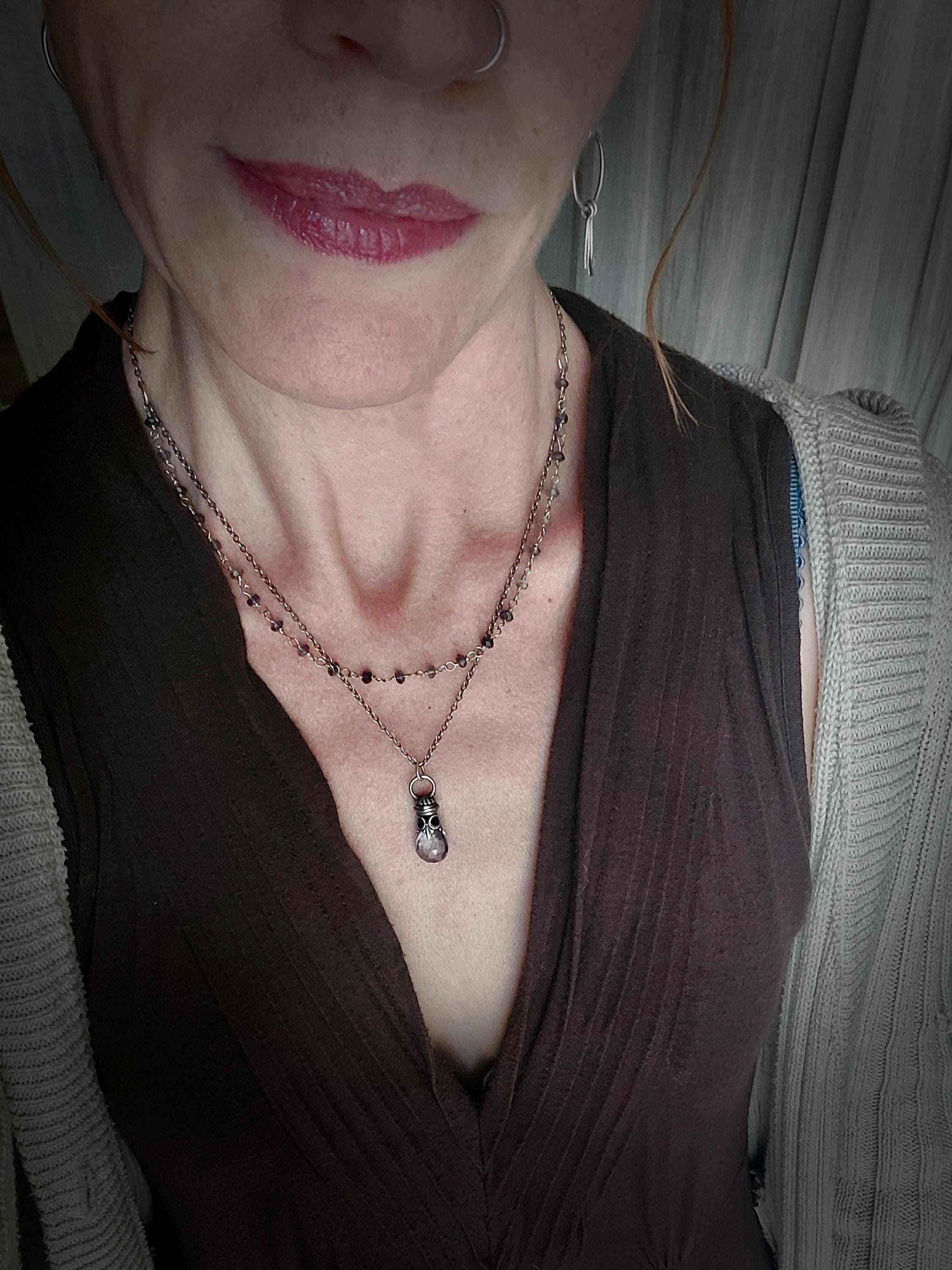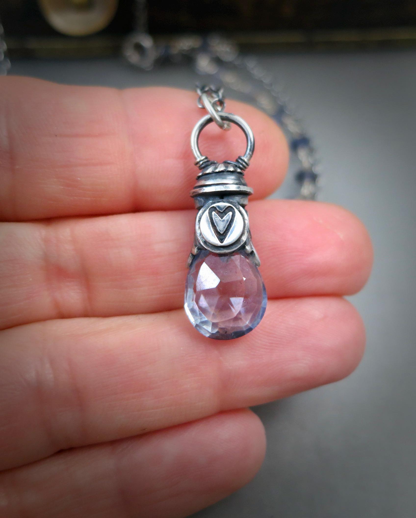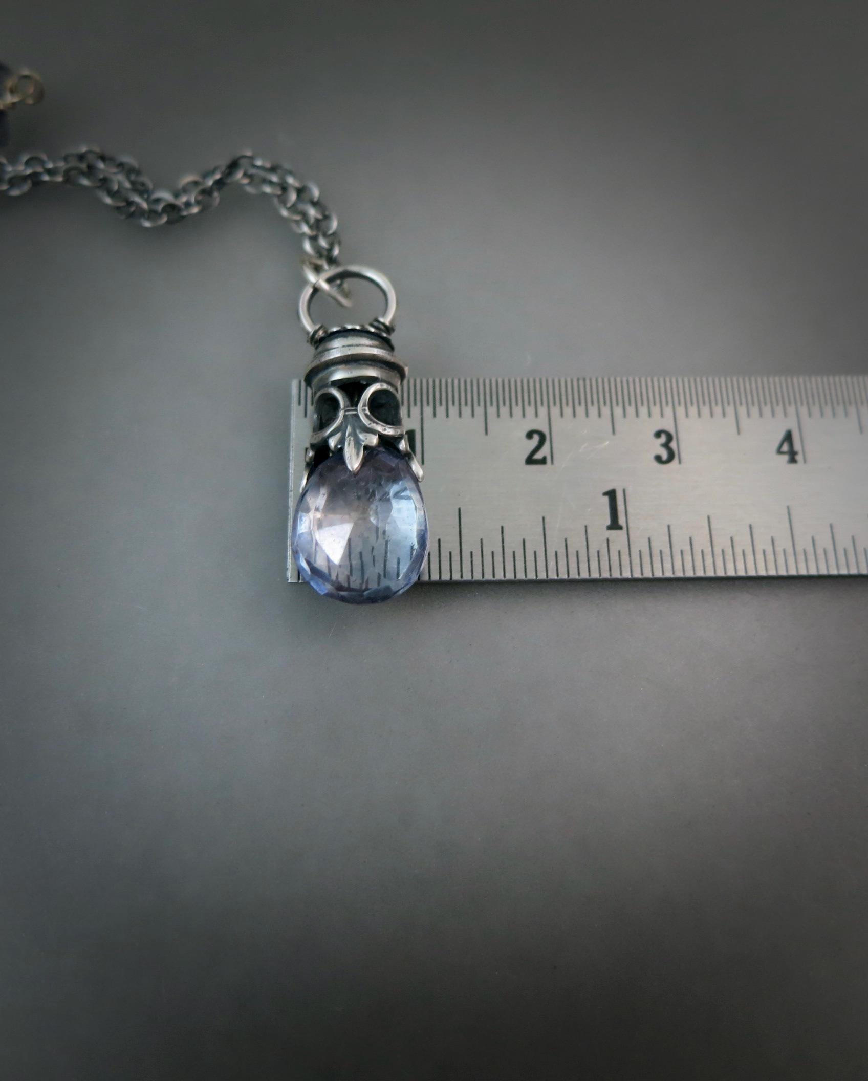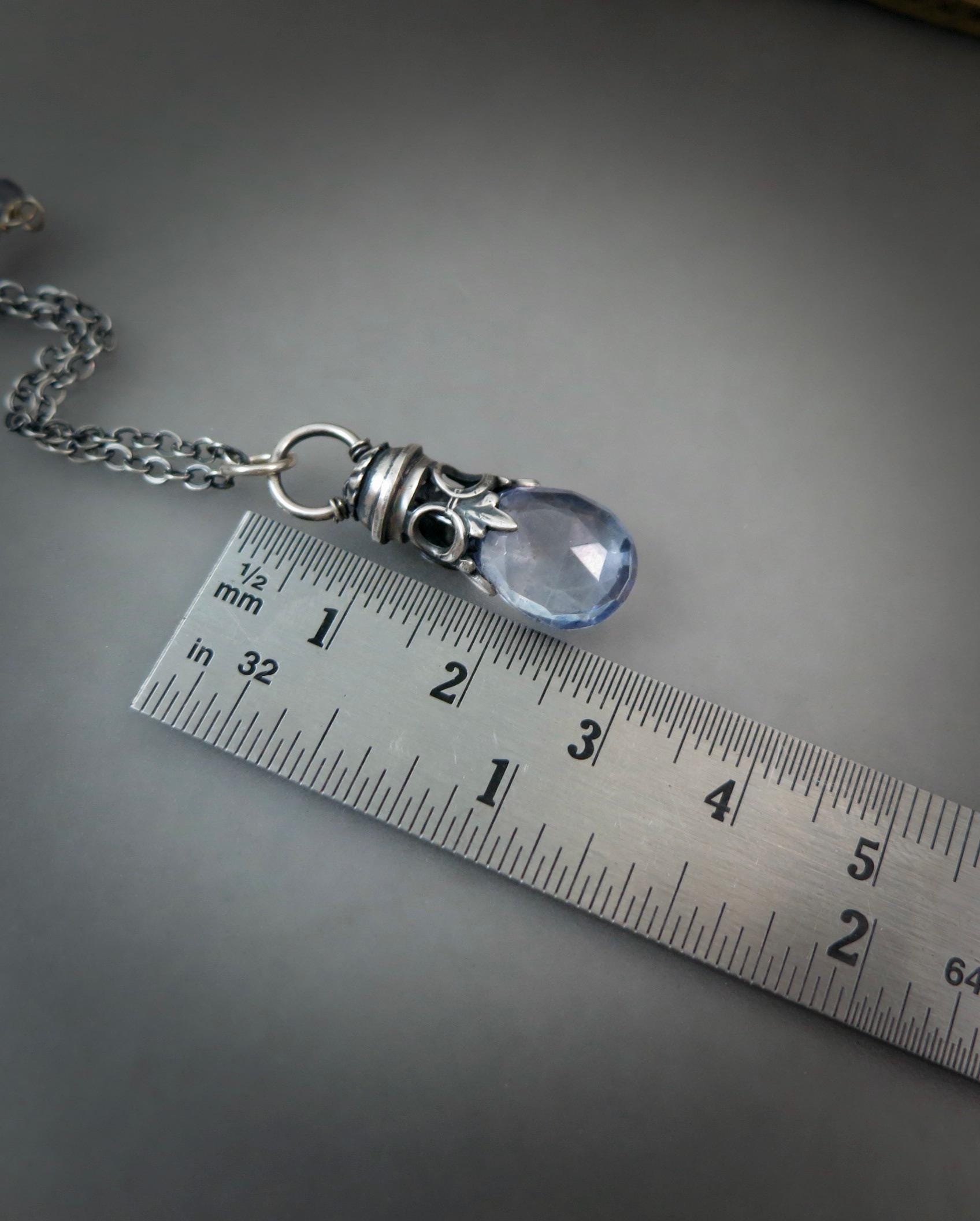 This charming little pendant features a faceted blue quartz gemstone. The stone hangs from a handmade, finely detailed sterling silver embellishment. The setting has been lightly antiqued to add drama and contrast. A second hand beaded strand of iolite that floats above the pendant. The chains are joined together with delicate loops.