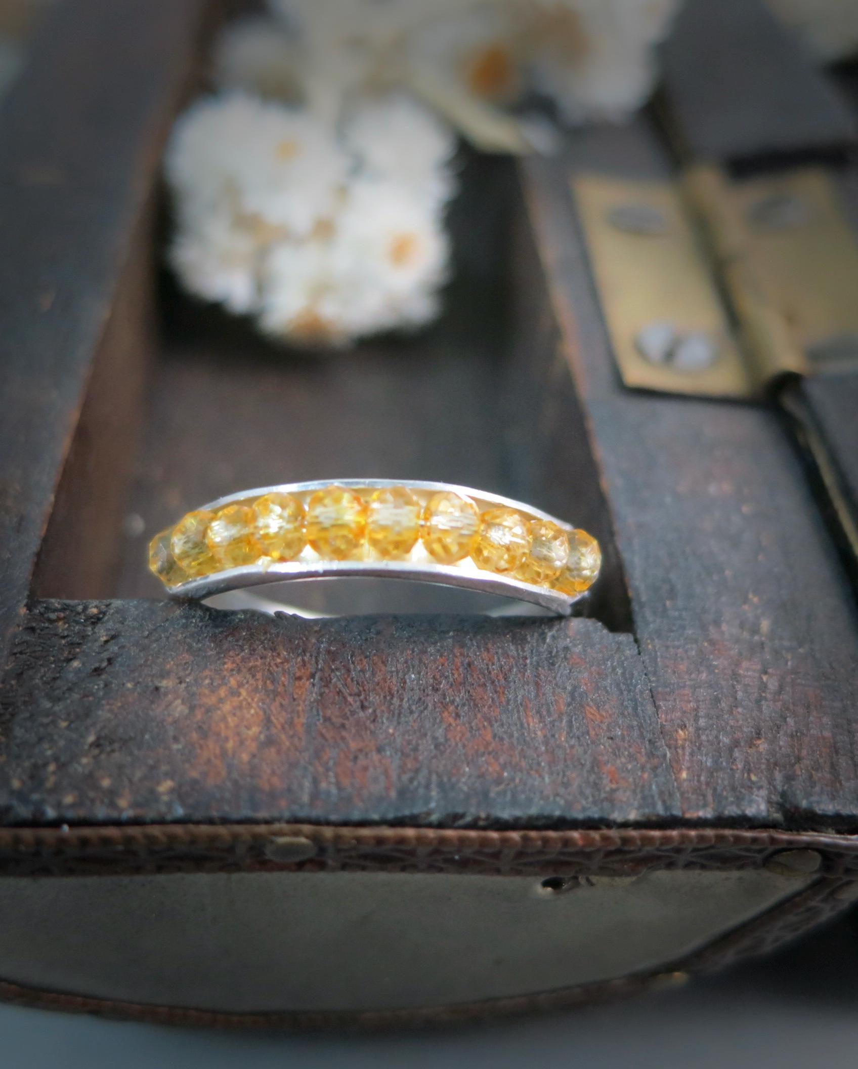 A whole bunch of pretty citrine sparkle from within the folds of this fine silver bracelet. The stones are held securely in place by sterling wire that runs through the center of the stones. The stones are separated by a 1 inch section that has been hammered to give texture. Coordination ring available in my shop.