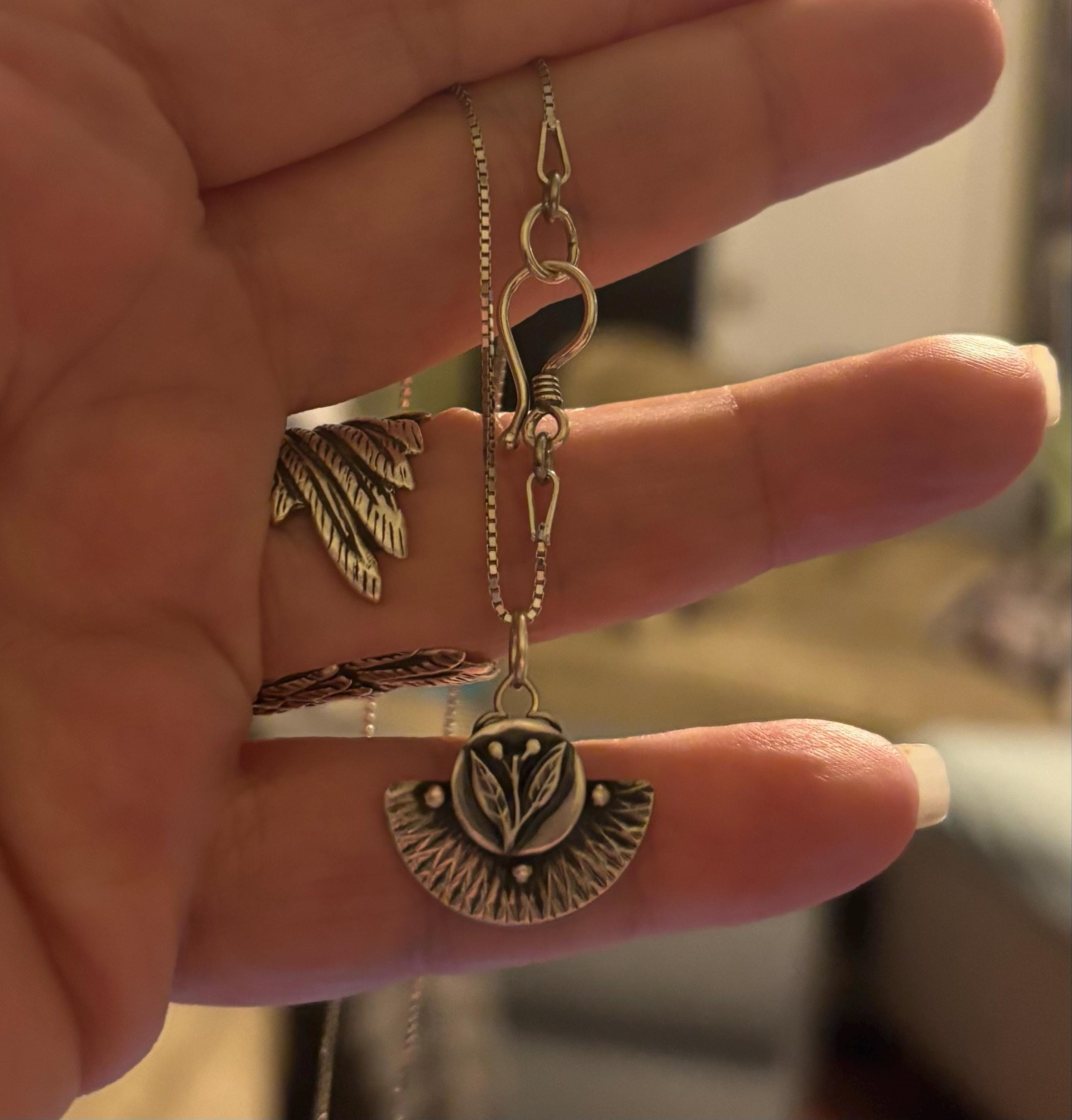 This charming little unusual pendant features a tiny flower rising up from the energy of the earth below. The silver has been given a dark patina, then lightly brushed away to reveal the bright sterling highlights underneath. This tiny treasure has an easy, time worn look. The back of the pendant has been stamped with my maker's mark and 925. Great for layering. Modeled with my wedjat protection amulet.