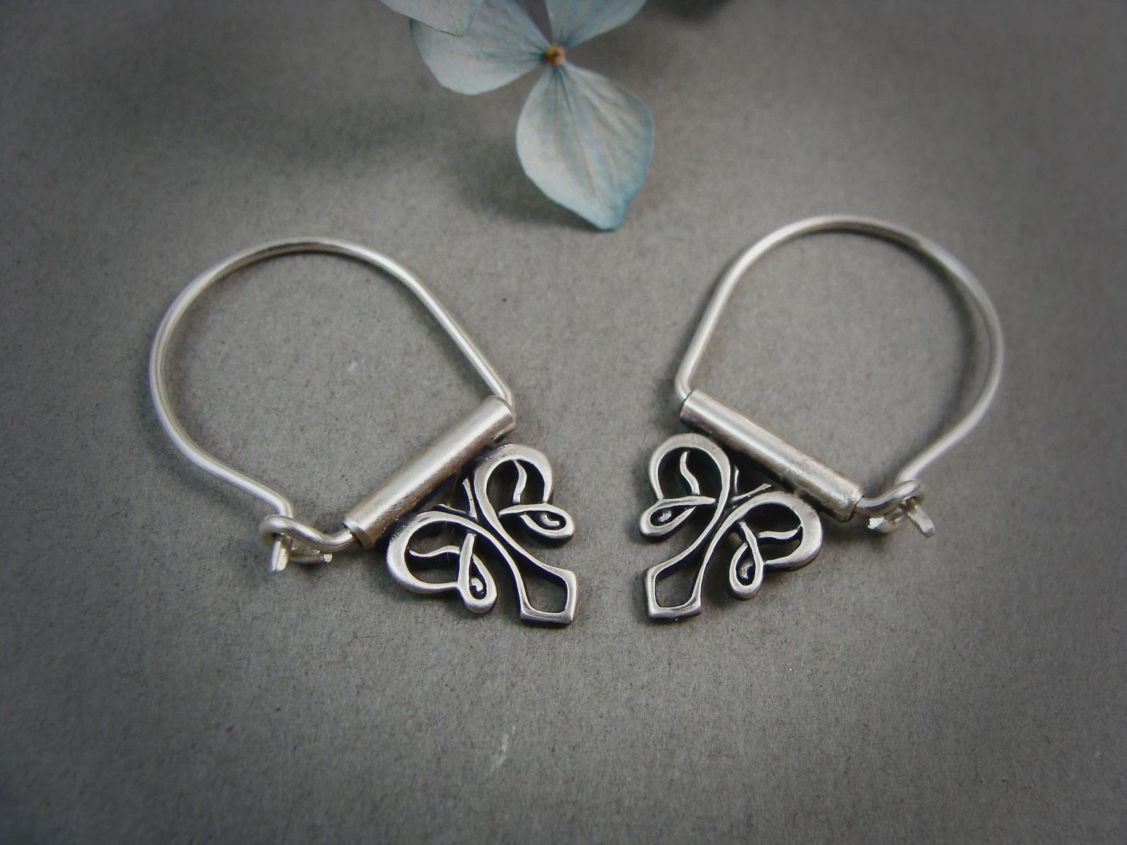 These handmade Art Nouveau sterling silver hoop earrings feature gracefully flowing curves inspired by the elegance of the Art Nouveau era. The pretty embellishments have been merged with silver tubes. The embellishments sway freely from sterling wire that has been hand formed into a loop style earring. The silver has been lightly oxidize to bring out all the delicate details. Smaller hoop size available.
