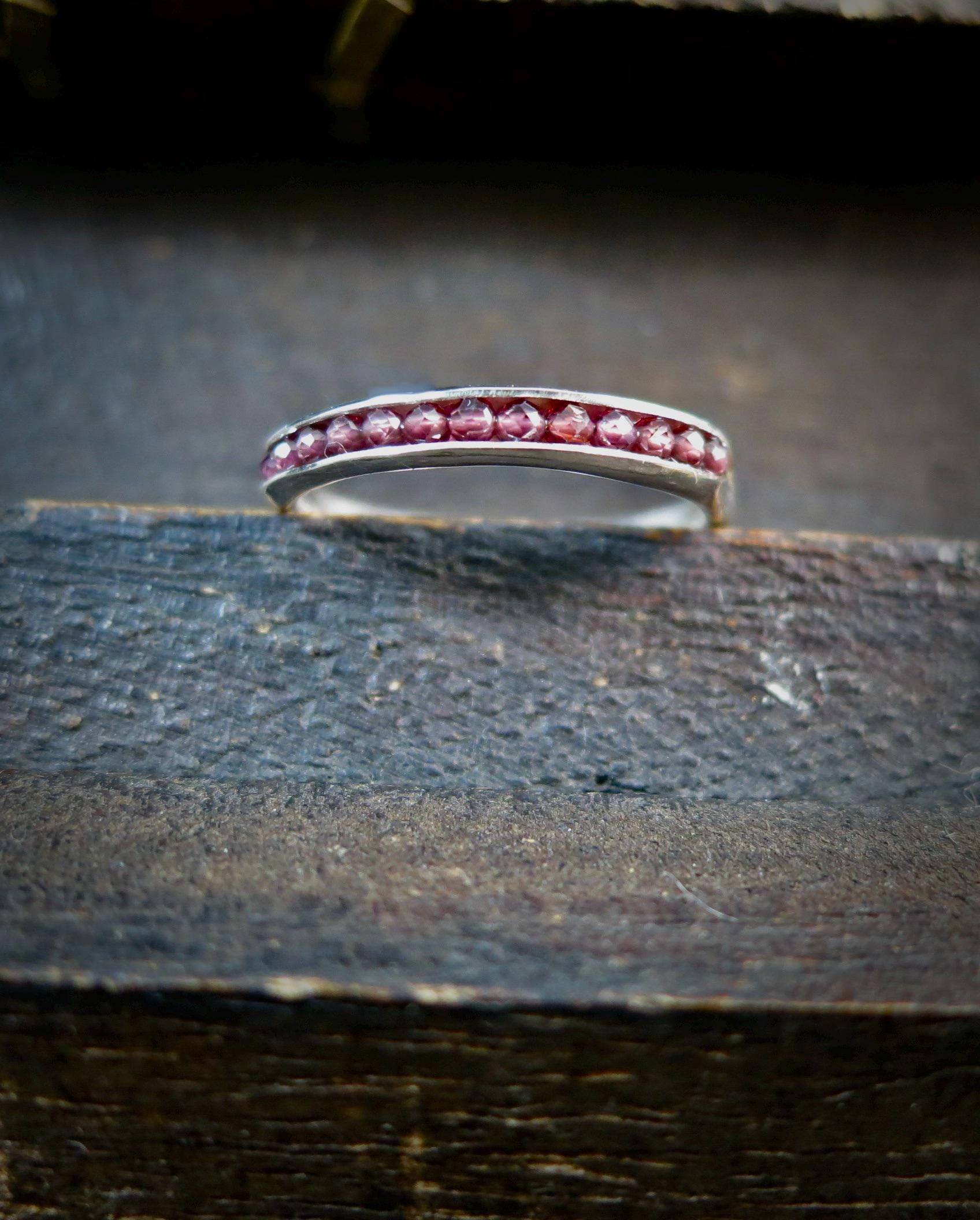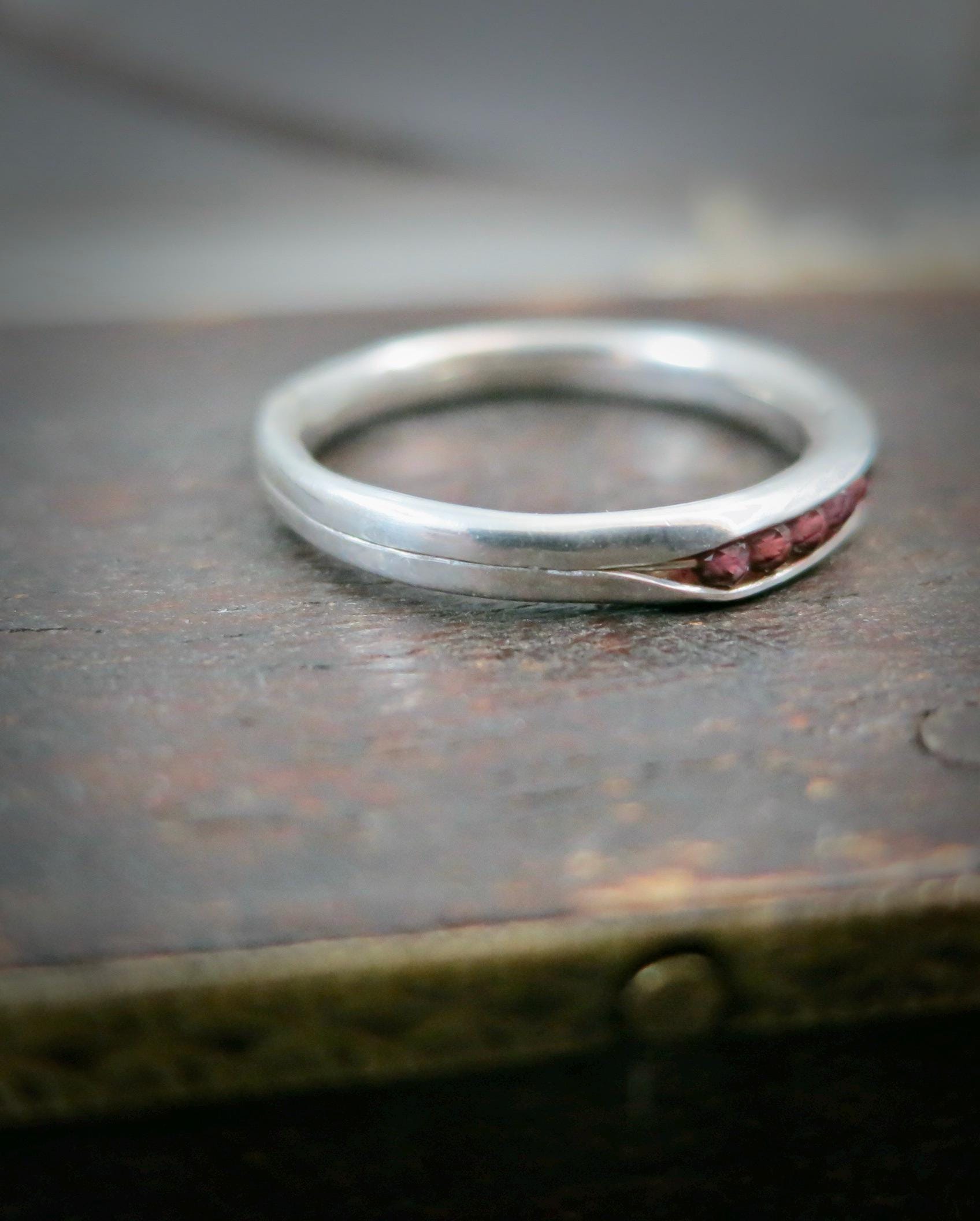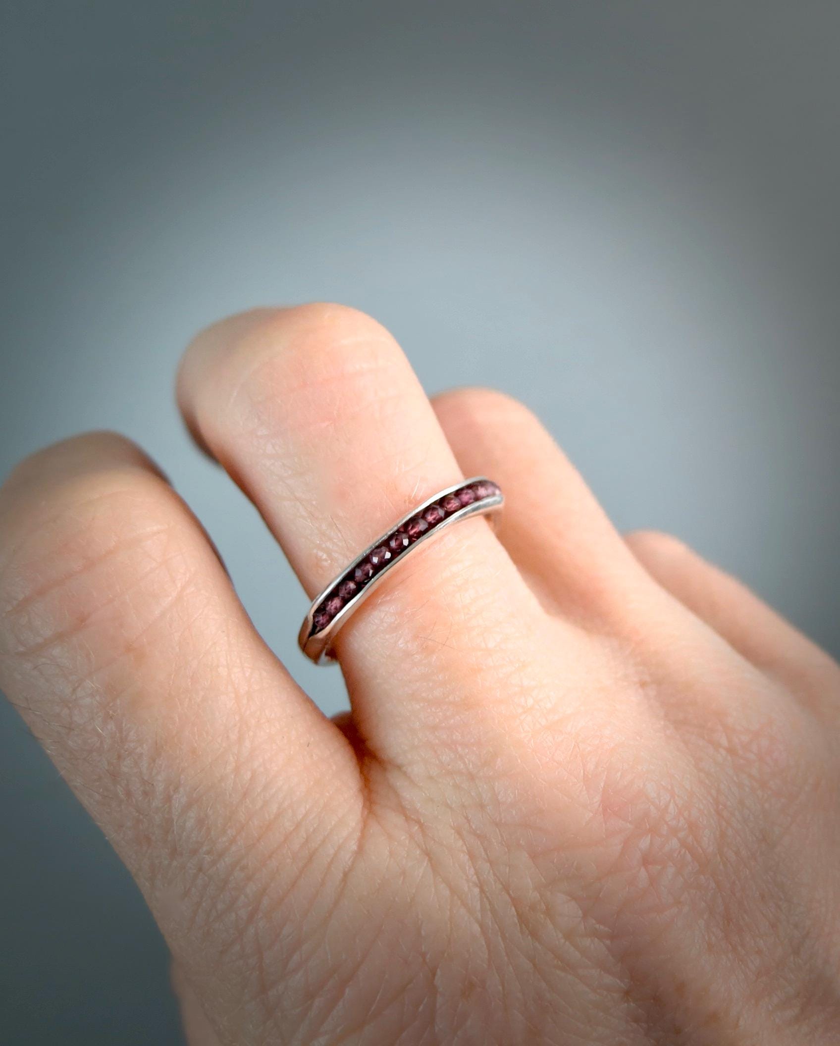 This handmade rhodolite garnet stacking ring features a vibrant, wine-hued gemstones set in a slim solid sterling silver band. Rhodolite garnet, often associated with passion, energy, and creativity, adds both color and meaning to your jewelry collection. The delicate gemstones are cradled in the folds of this sterling silver ring. The stones are held securely in place by a sterling silver wire. This ring is 1/8" wide and 1/8" high. This organic band was lovingly hand crafted by me and looks great alone or with other stack rings. Sweet, simple and perfect for everyday wear. Coordinating bangle available in my shop.