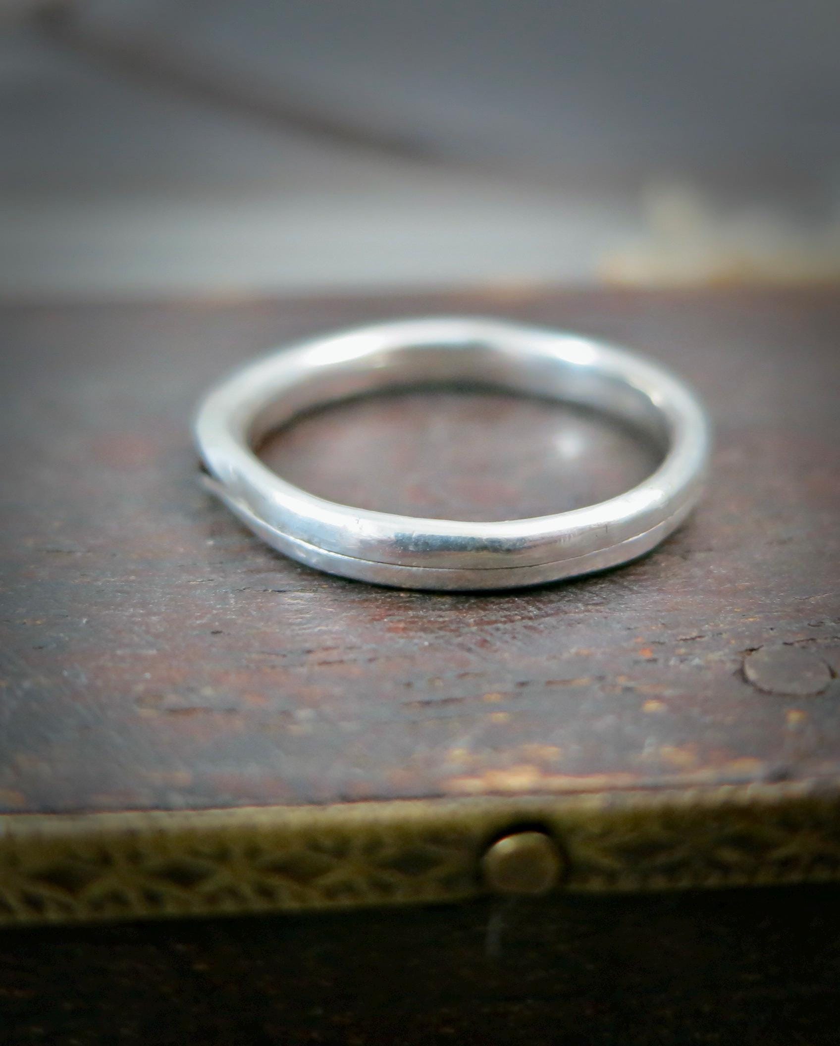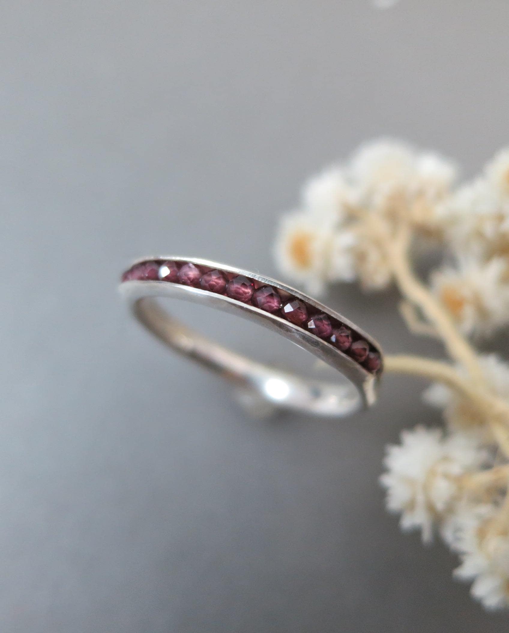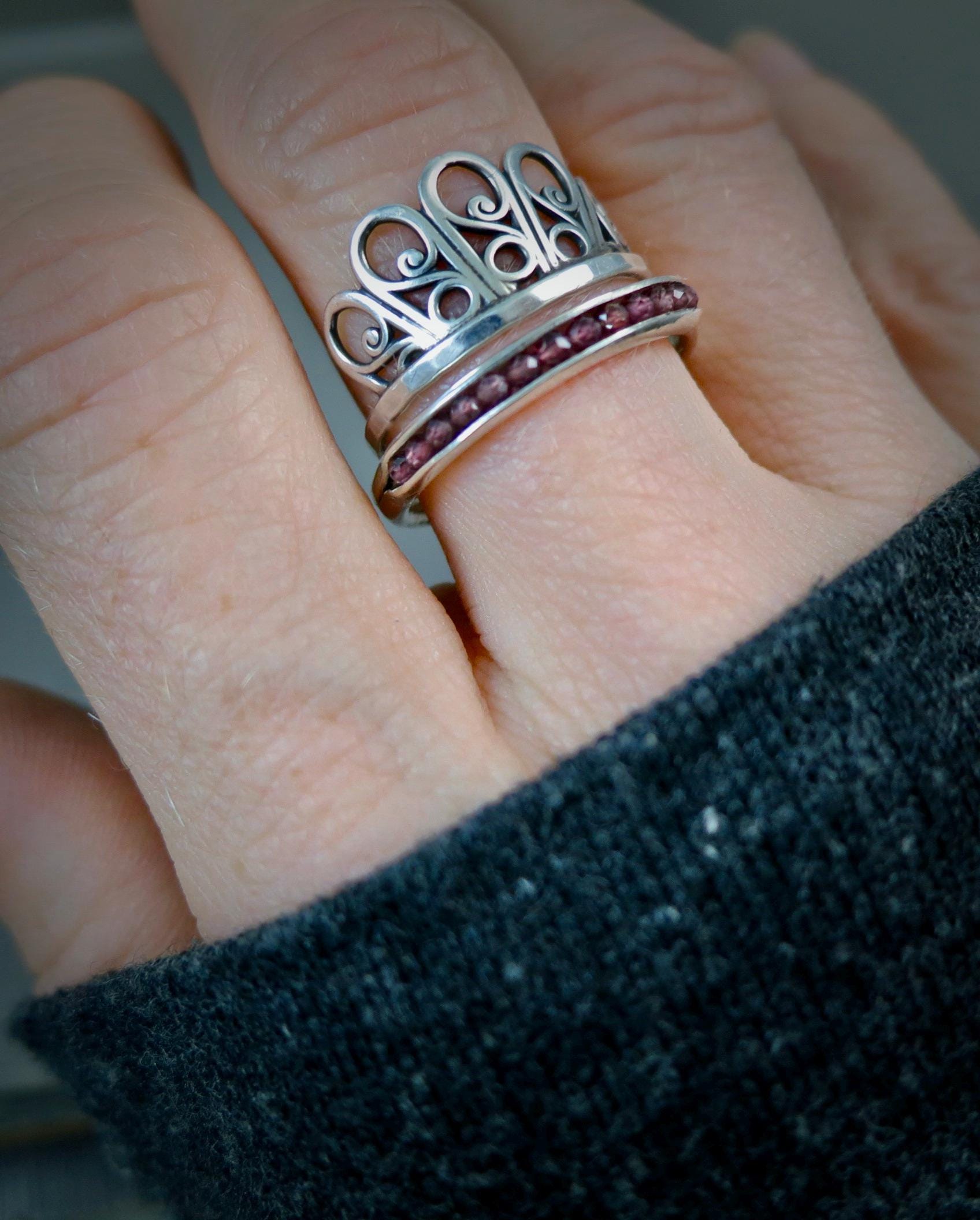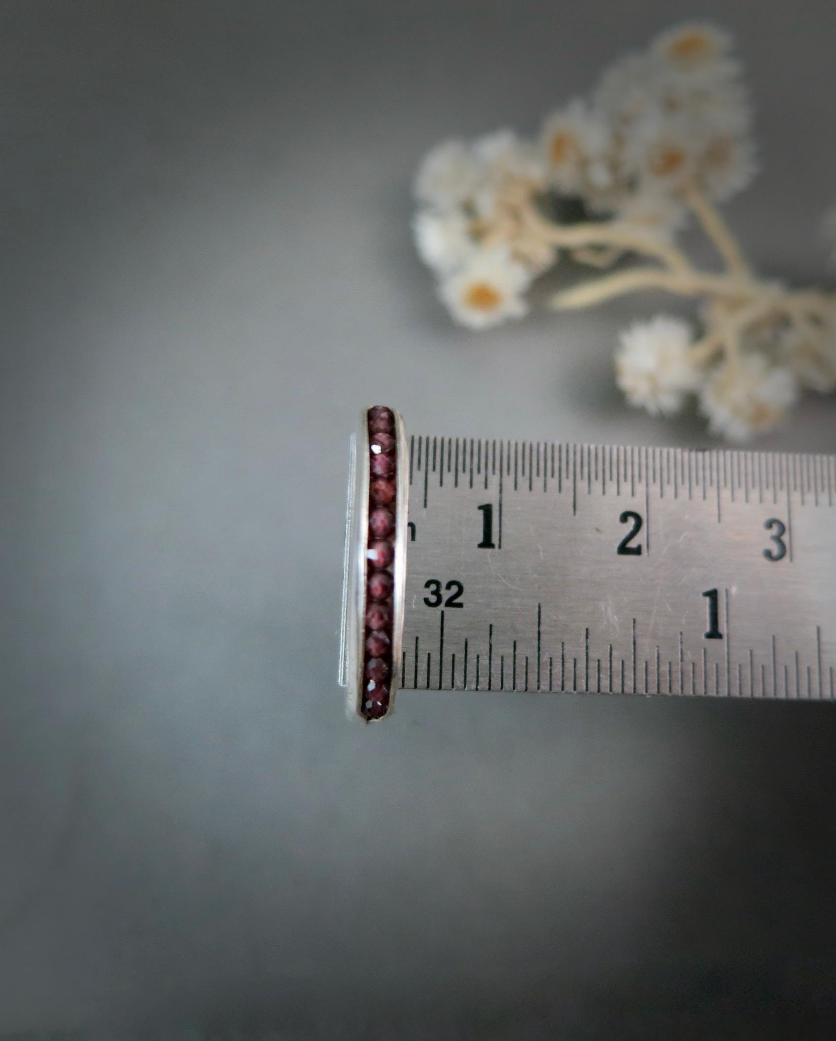 This handmade rhodolite garnet stacking ring features a vibrant, wine-hued gemstones set in a slim solid sterling silver band. Rhodolite garnet, often associated with passion, energy, and creativity, adds both color and meaning to your jewelry collection. The delicate gemstones are cradled in the folds of this sterling silver ring. The stones are held securely in place by a sterling silver wire. This ring is 1/8" wide and 1/8" high. This organic band was lovingly hand crafted by me and looks great alone or with other stack rings. Sweet, simple and perfect for everyday wear. Coordinating bangle available in my shop.