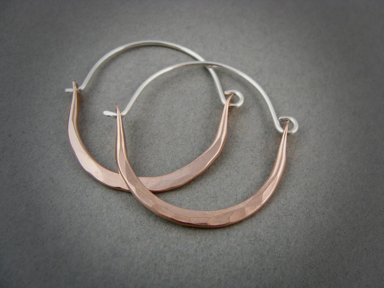 These delicate 14k gold filled hoops have been hand formed and connect to a hammered sterling silver shape. The sterling wire has been hammered to be wider at the bottom and given a gentle curve. Unique, simple and perfect for everyday.