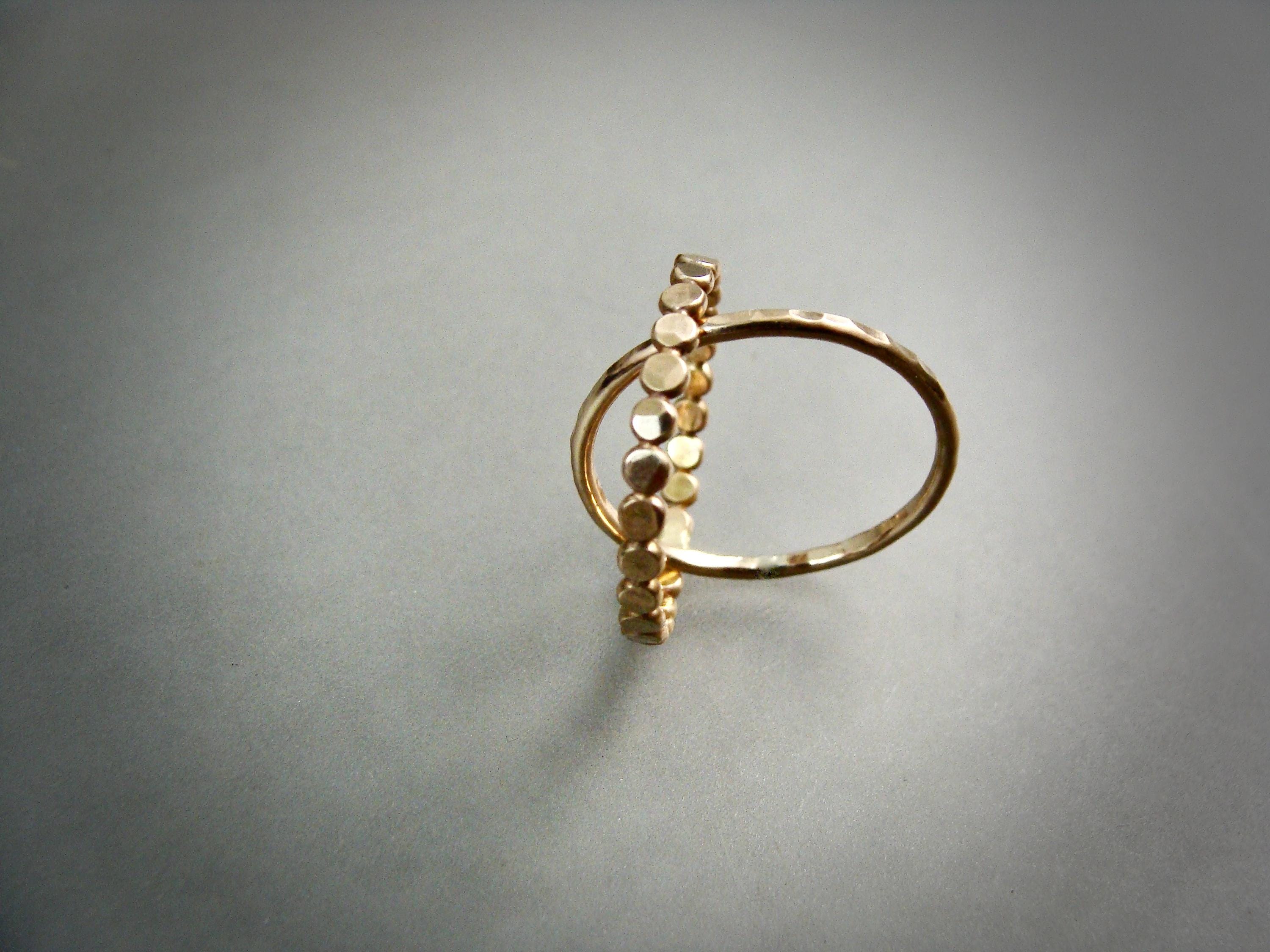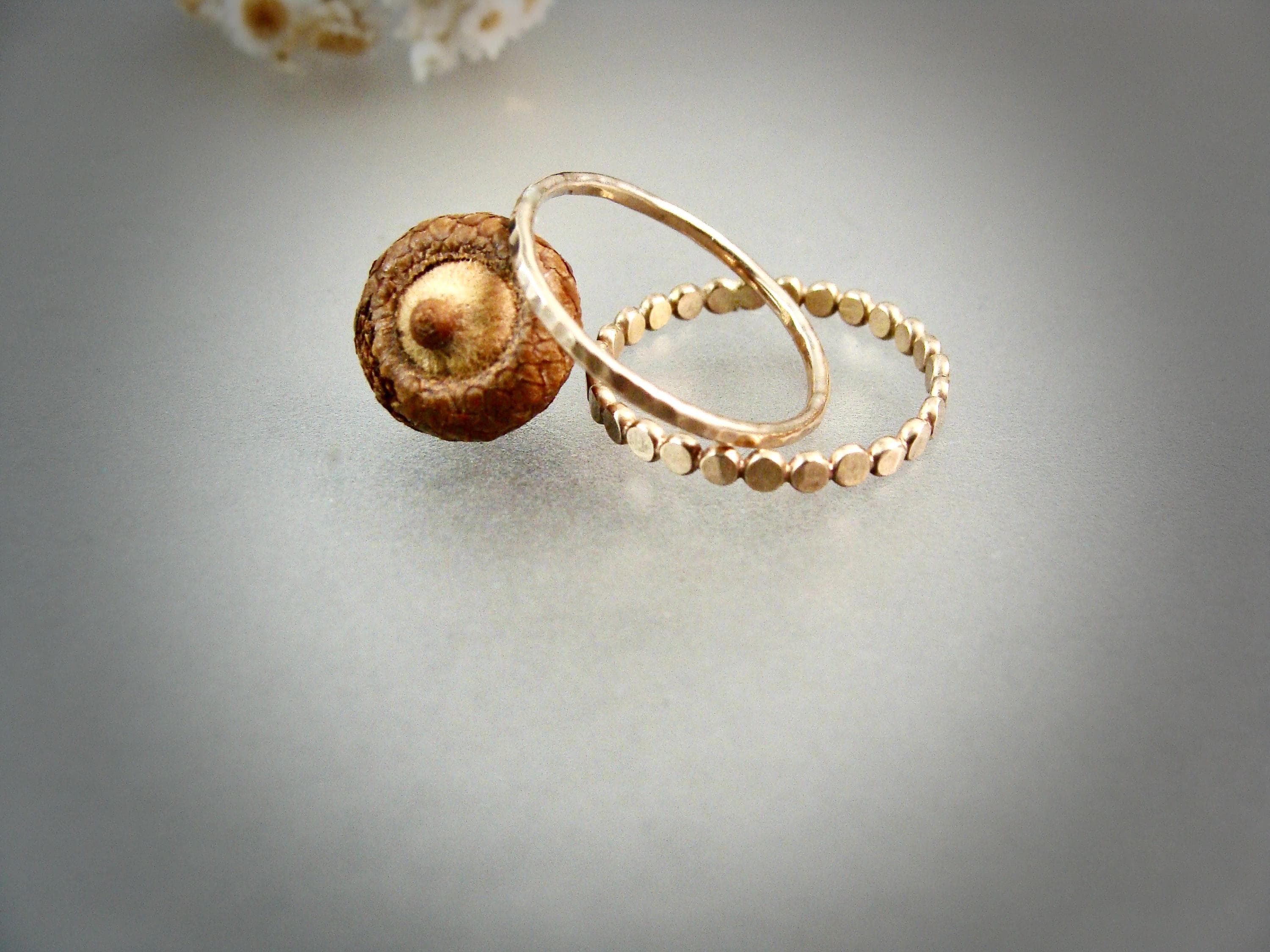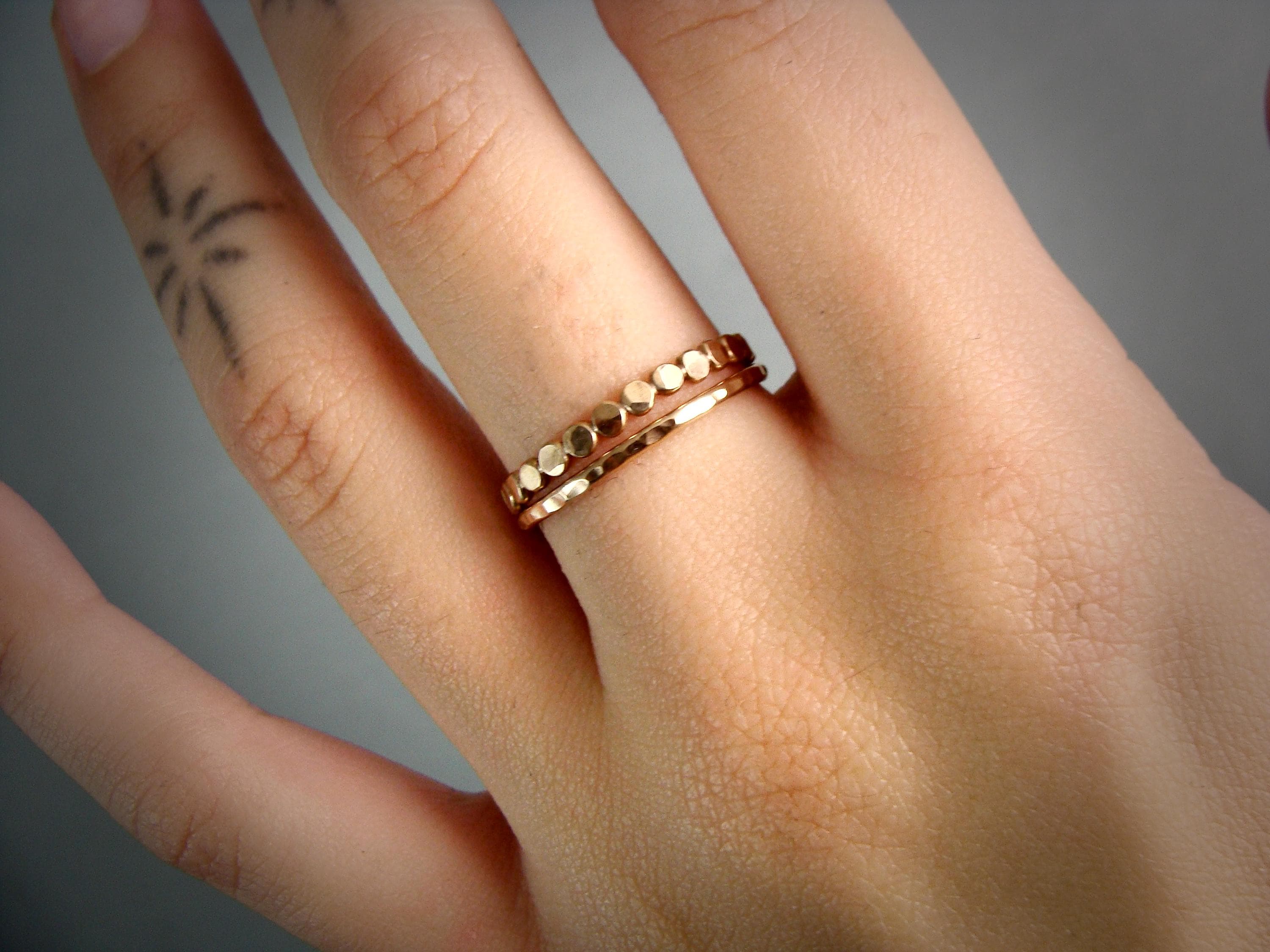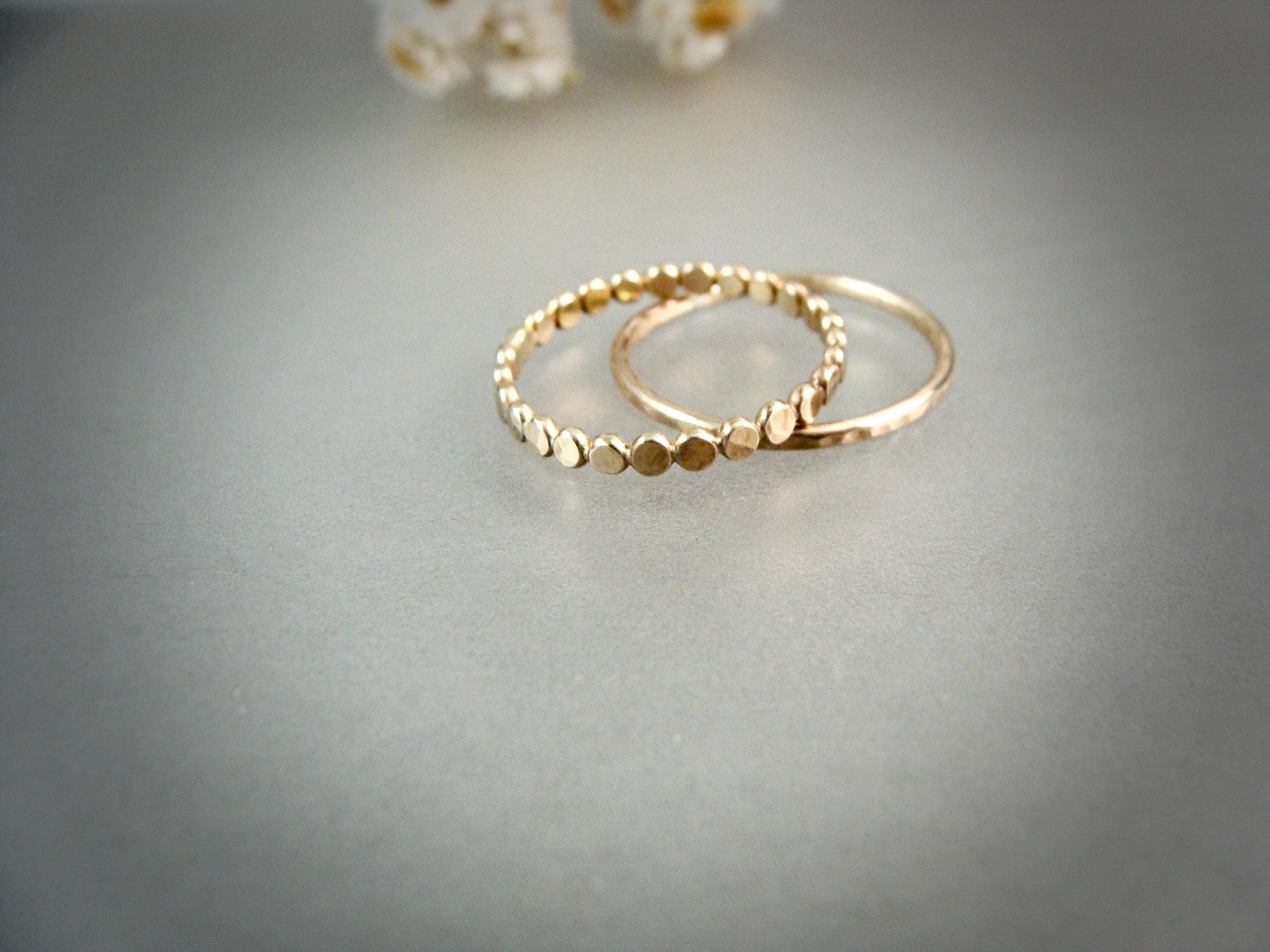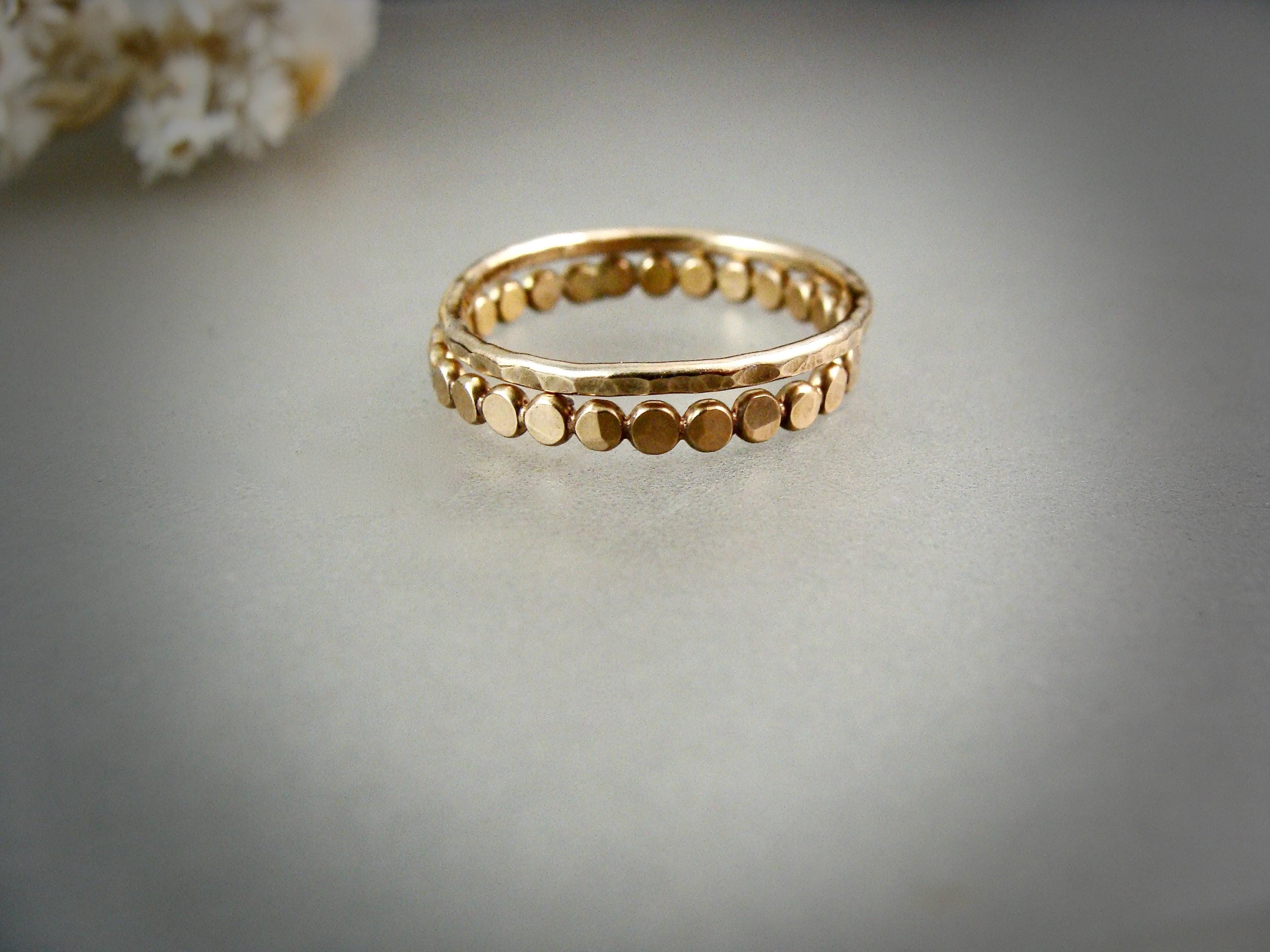 These hammered 14k gold fill stacking rings have just enough texture to catch the light. The delicate dot bead band is a beautiful complement to the slim hammered band. An elegant, durable pairing that is perfect for everyday wear. Bead band is 1.5mm, hammered band is 1mm.