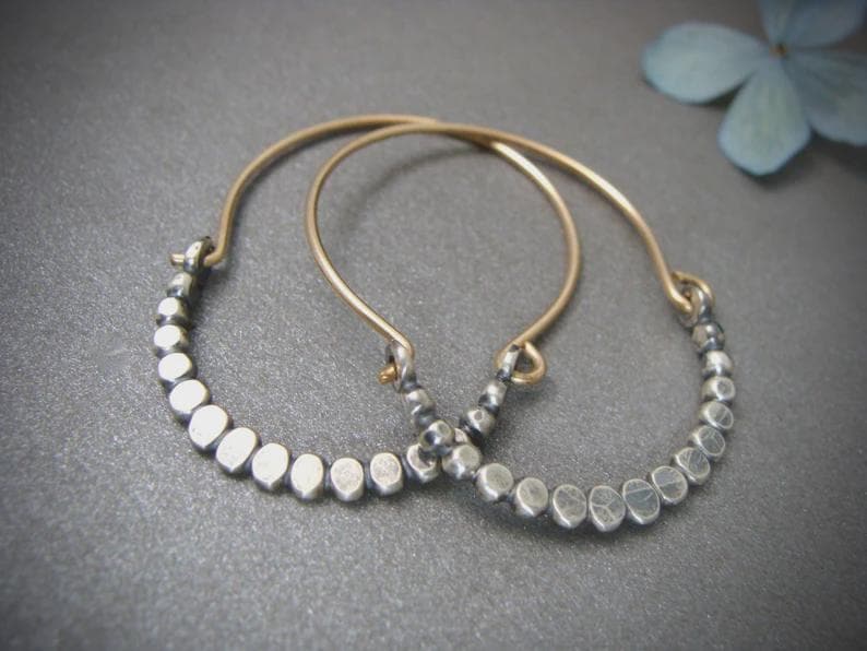 One 14k gold fill that has been hammered to catch the light. The other is a slim silver bead band that has also been hammered and oxidized for a time worn look. The two rings are shown with my deco and floret rings available for purchase in my shop. Wear them together, alone, or with other rings in your collection.