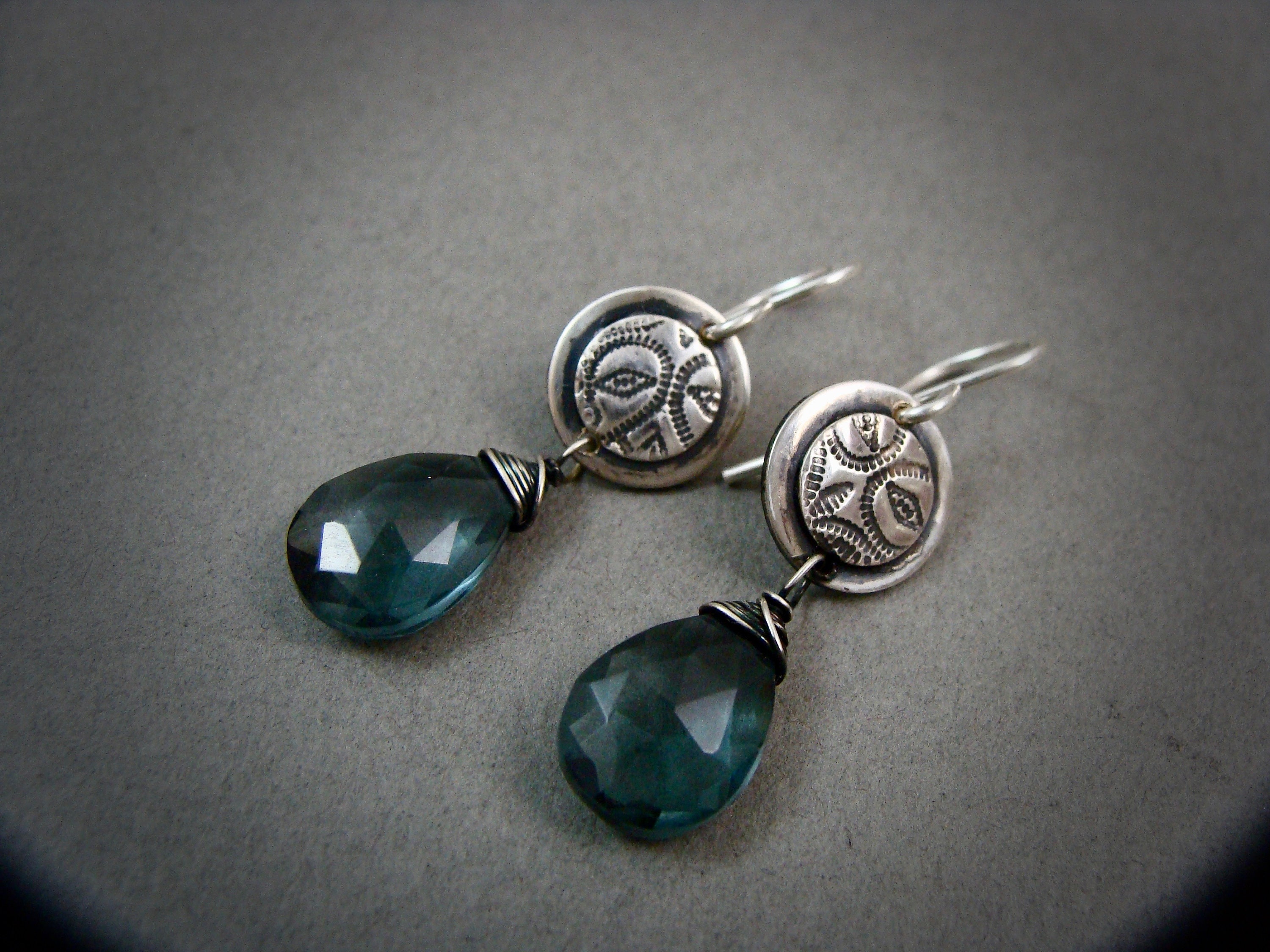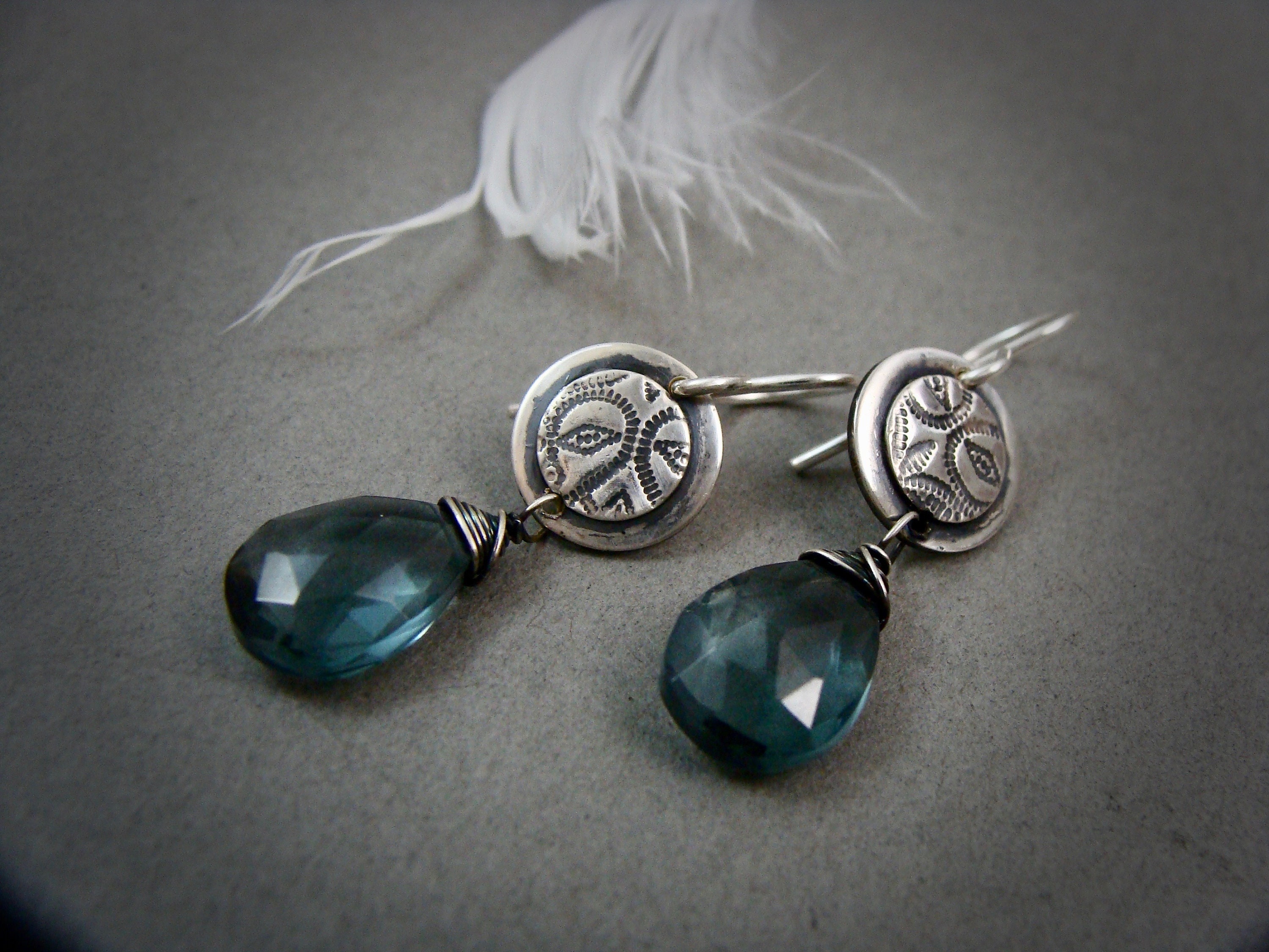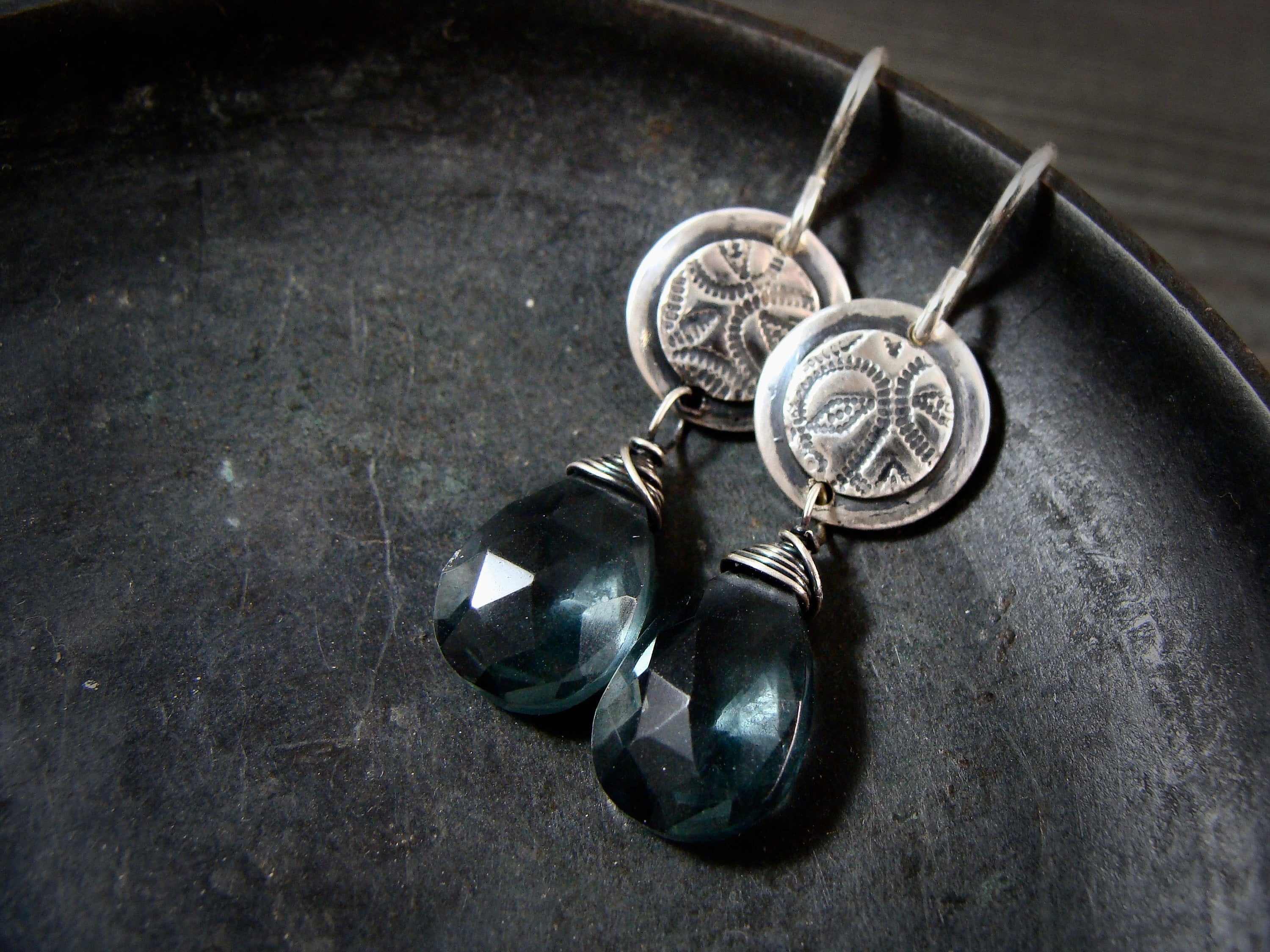 These grey blue hydro quartz gemstones dangle from layered handmade sterling silver discs. The silver has been imprinted with a delicate floral design. The silver has been given a dark patina, then gently cleaned away to accentuate the design a give that time worn look.