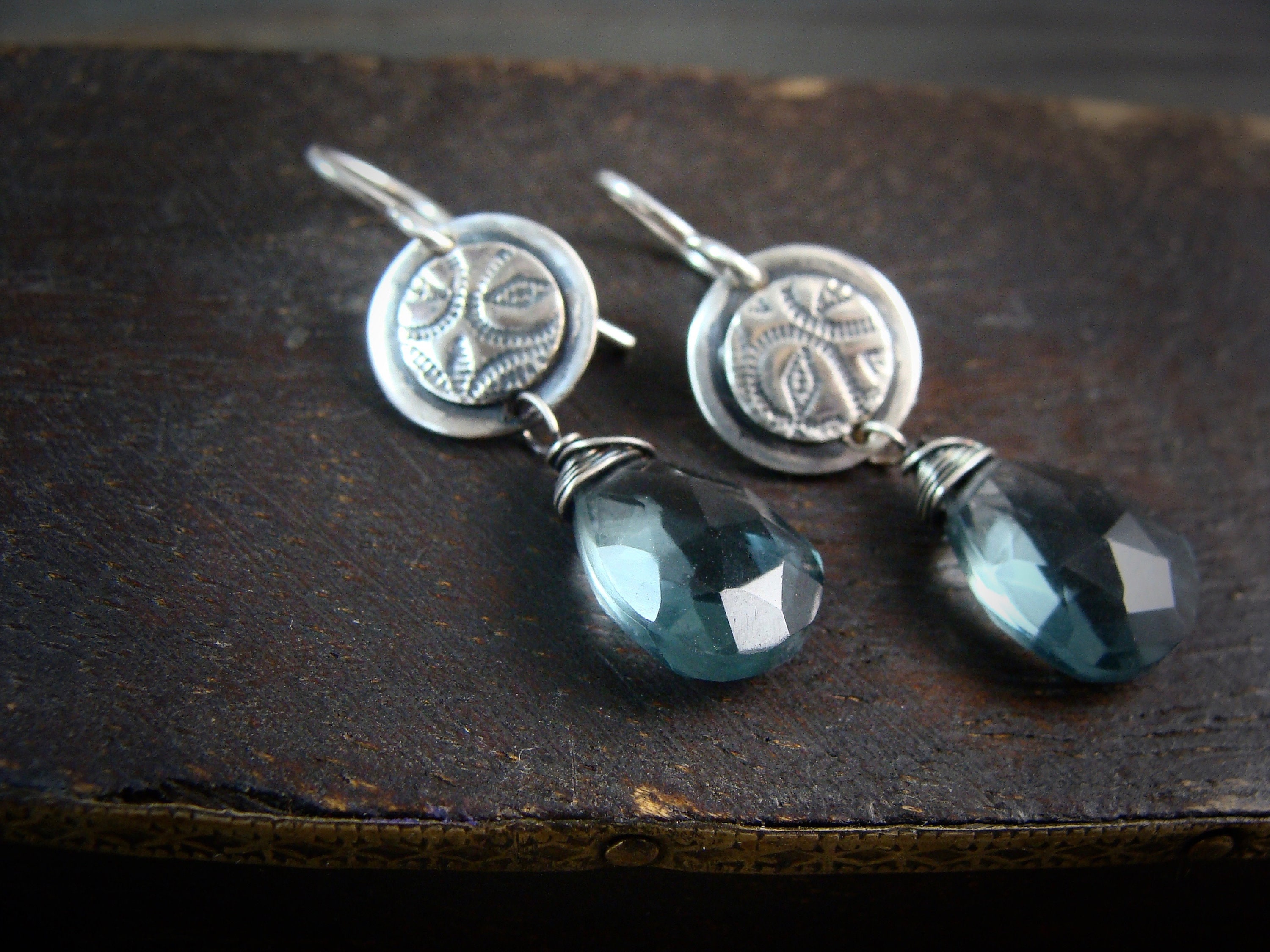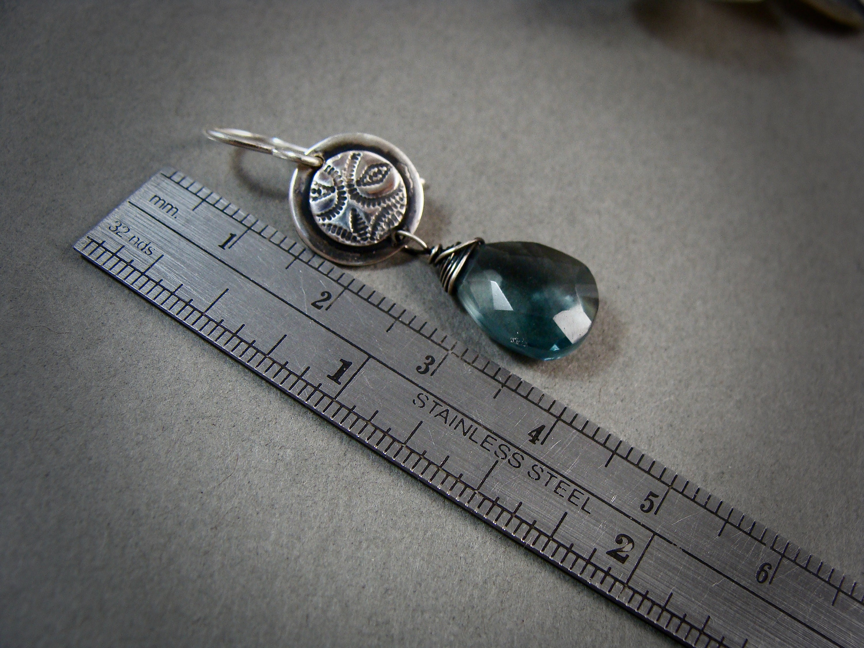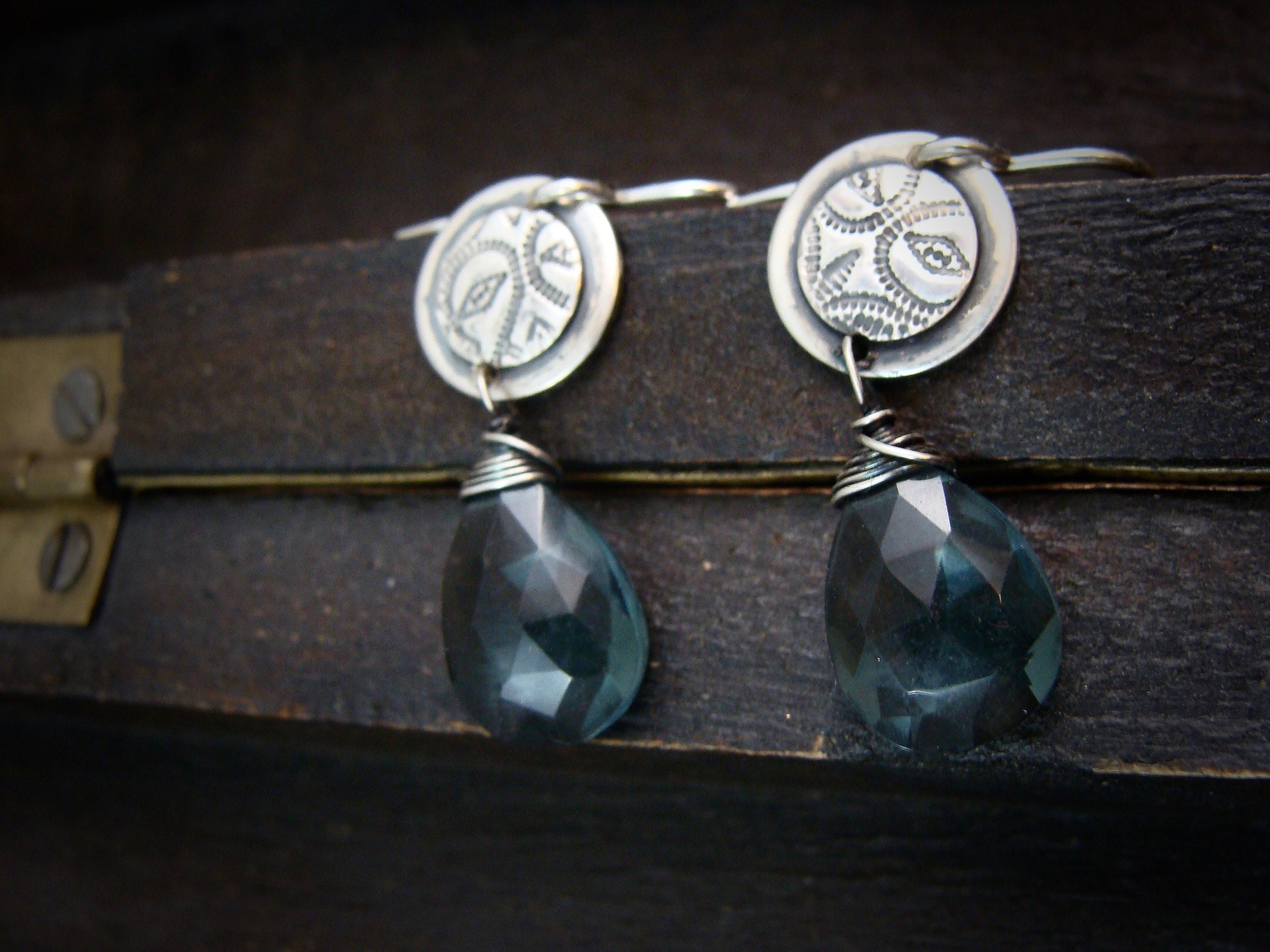 These grey blue hydro quartz gemstones dangle from layered handmade sterling silver discs. The silver has been imprinted with a delicate floral design. The silver has been given a dark patina, then gently cleaned away to accentuate the design a give that time worn look.
