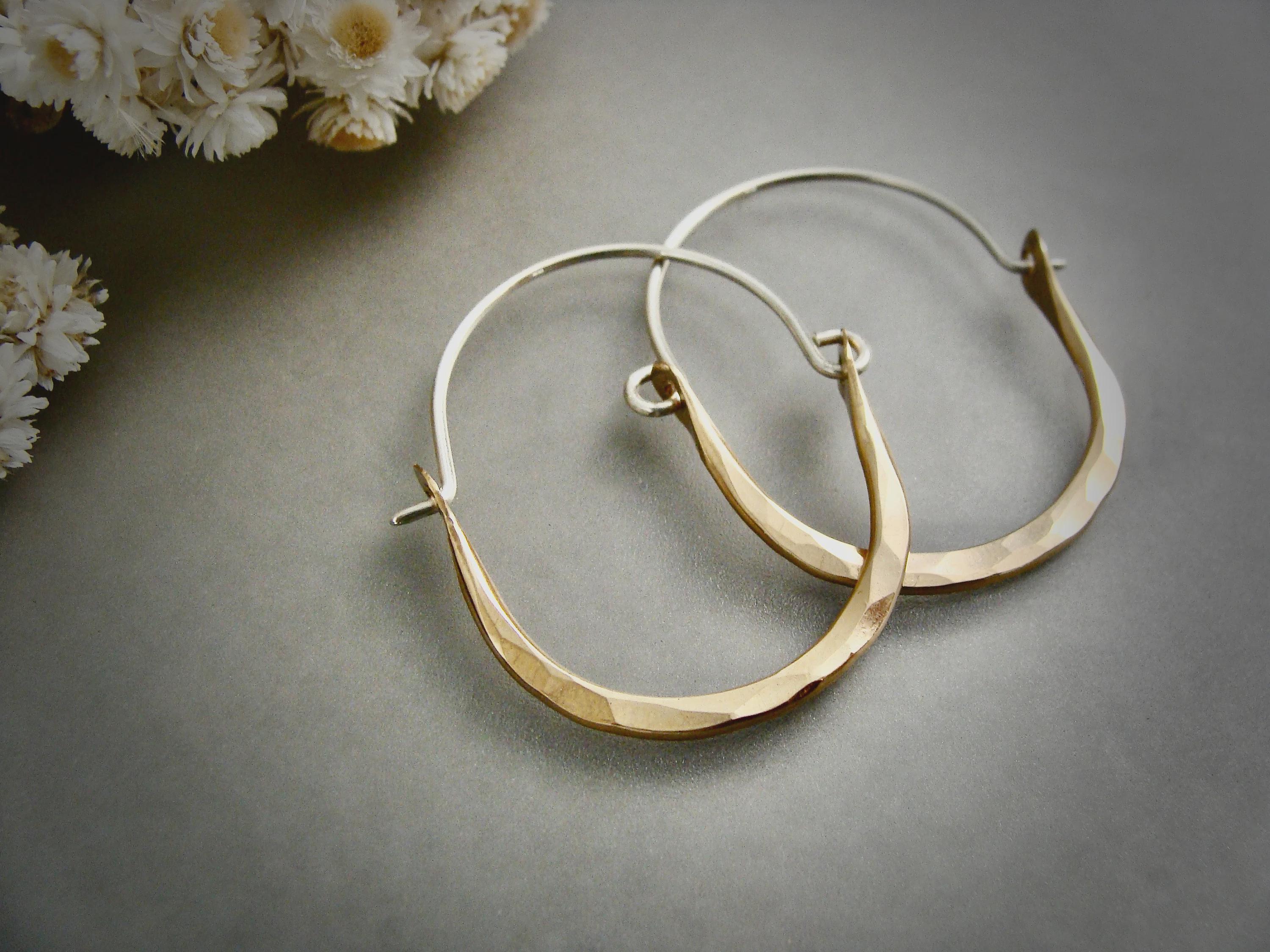 These hammered 14k rose gold filled hoops have been hand formed and connect to sterling silver ear wires. The metal has been hammered to be wider at the bottom and given a gentle curve. Unique, simple and perfect for everyday.