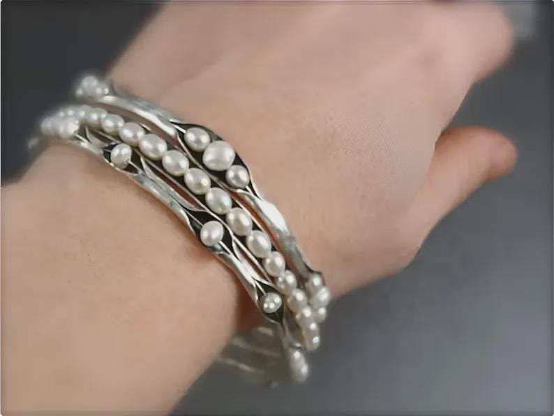 Measuring under 1/8" wide and 1/8" high, pearls 2 - 3mm making this ring is slim, comfortable, and perfect for stacking with other bands. Because each ring is handmade by me, yours will be truly one of a kind, similar, but never identical, to the ones in the photos.