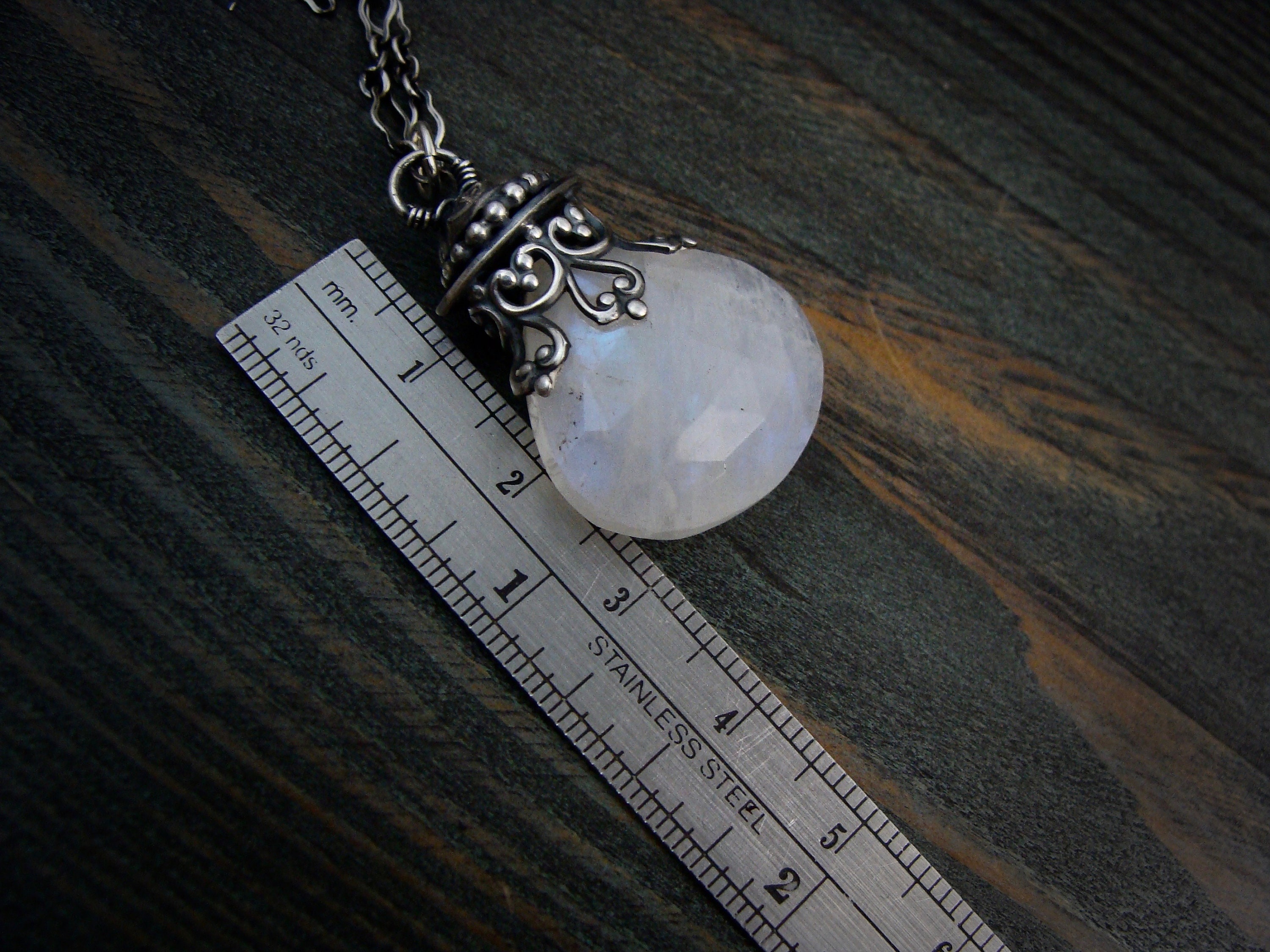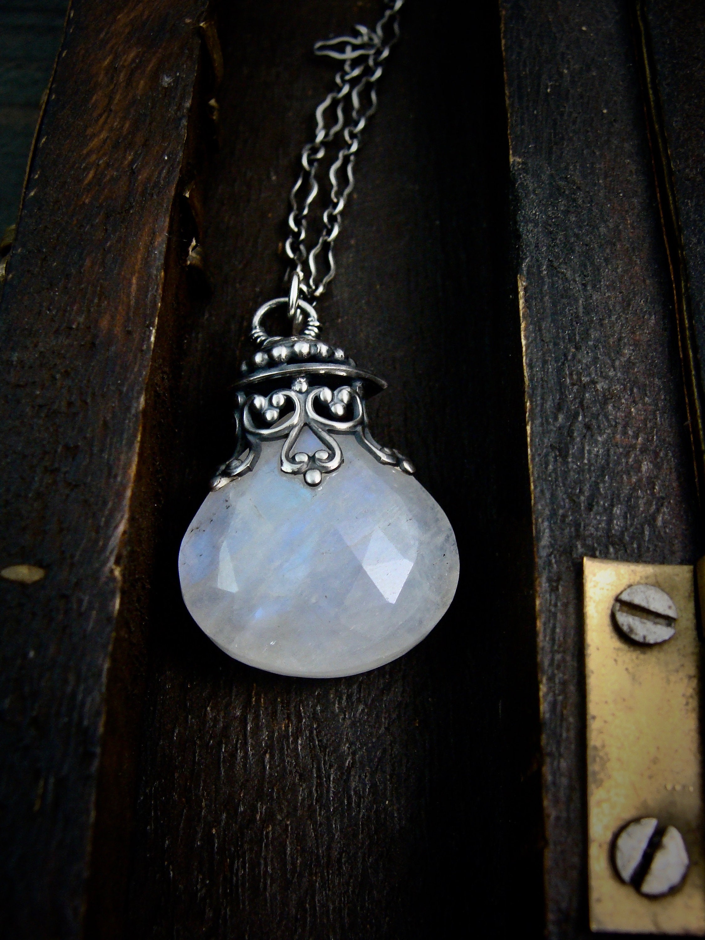 This large rainbow moonstone glows with watery blues, purples, yellow and green. The stone hangs from a handmade, finely detailed sterling silver filigree embellishment. The setting has been lightly antiqued to add drama and contrast. The pendant is open on both sides and hangs from an ornate sterling silver chain.