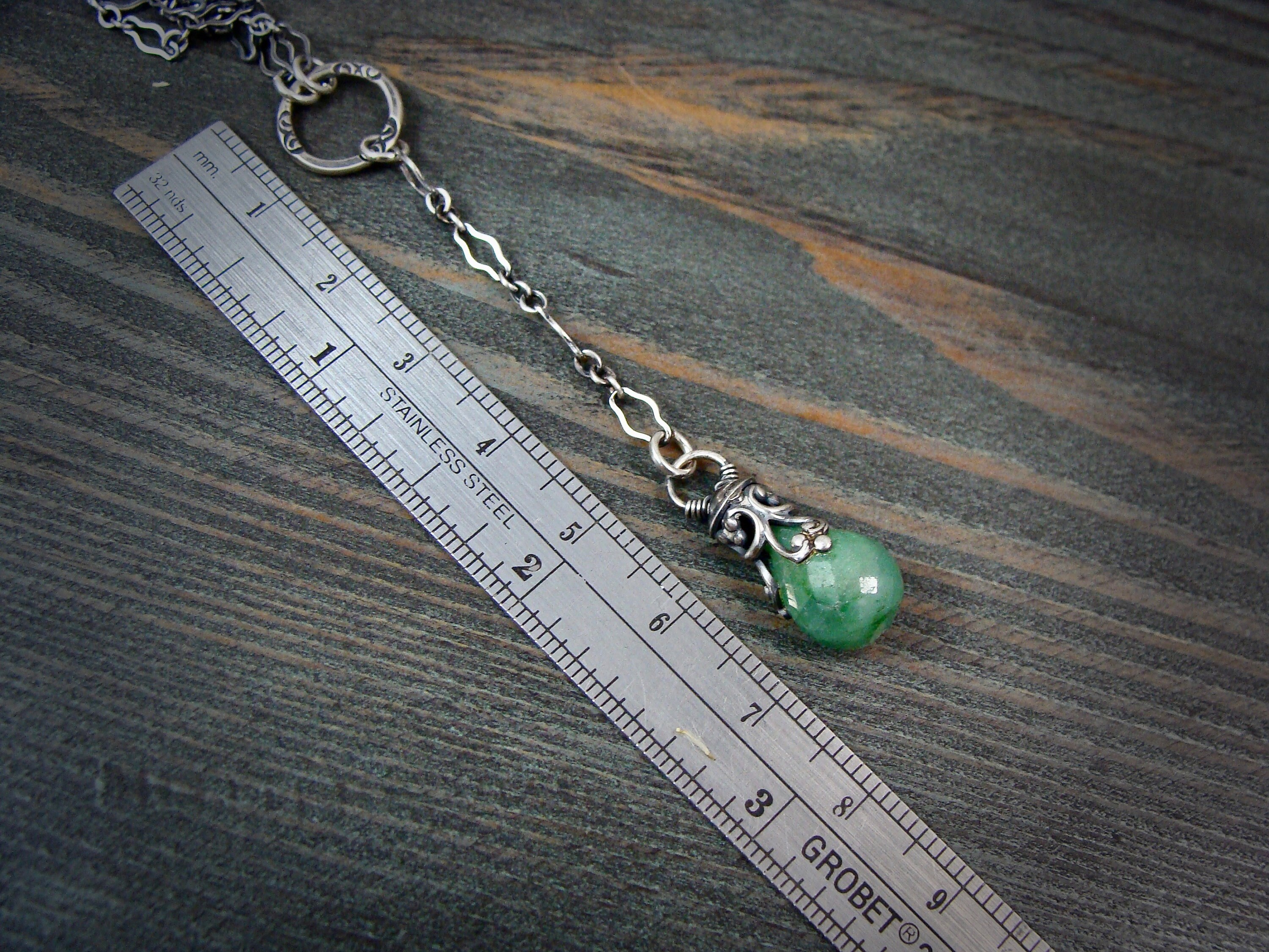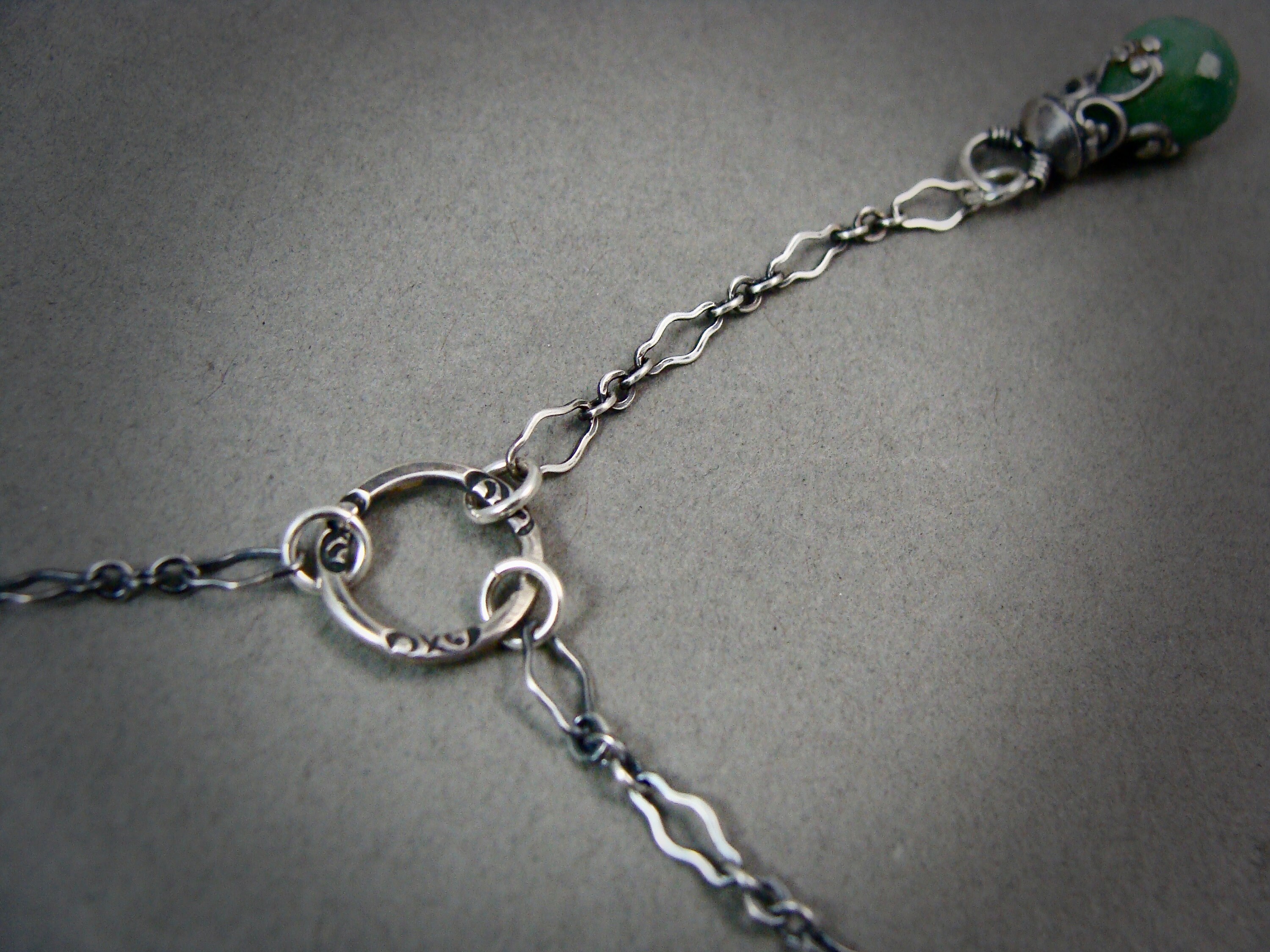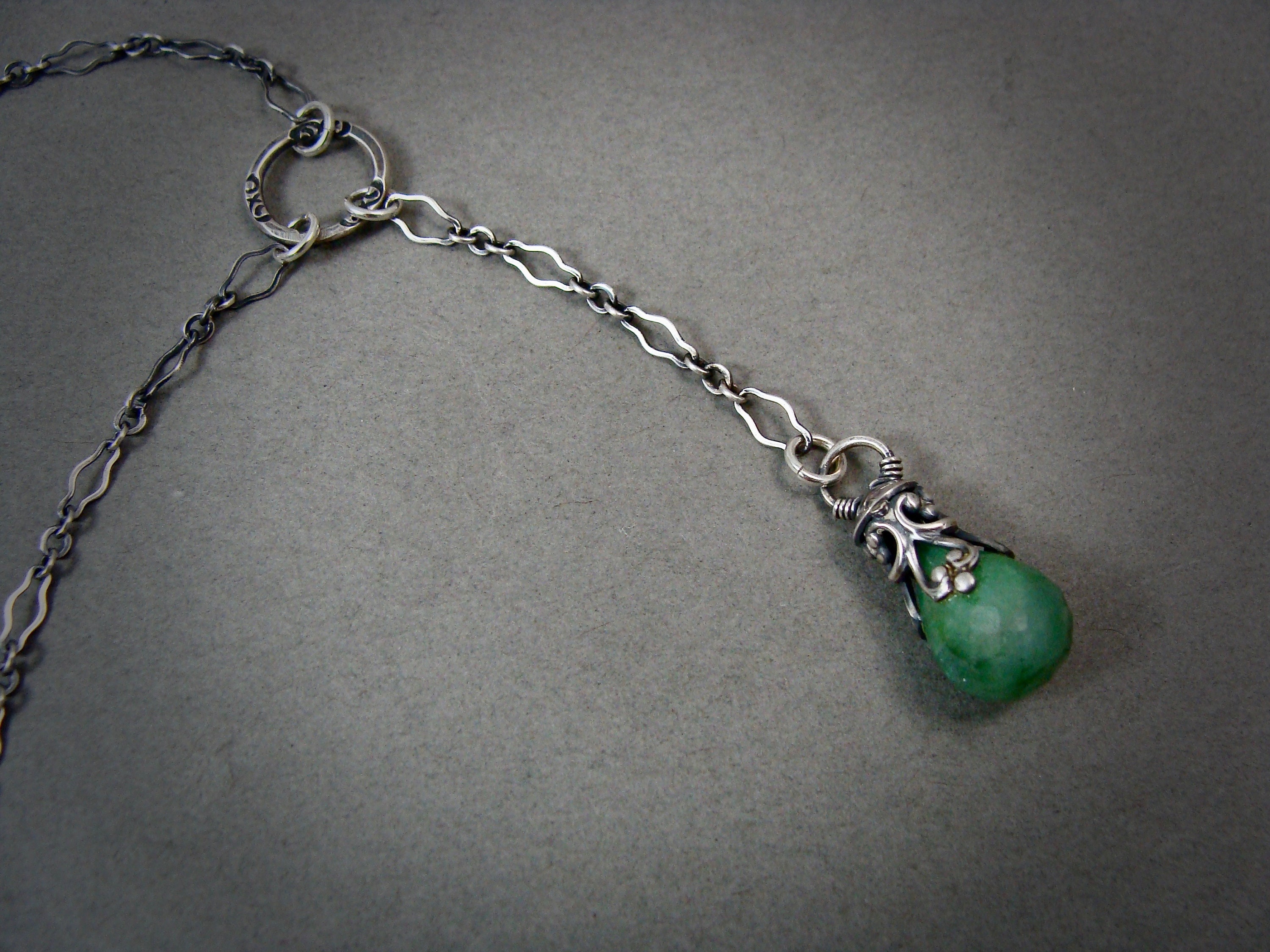 This delicate lariat pendant features a beautiful opaque emerald.. The stone hangs from a handmade, finely detailed sterling silver filigree embellishment. The ornate chain has been lightly antiqued to add drama and contrast. The pendant is open on both sides.