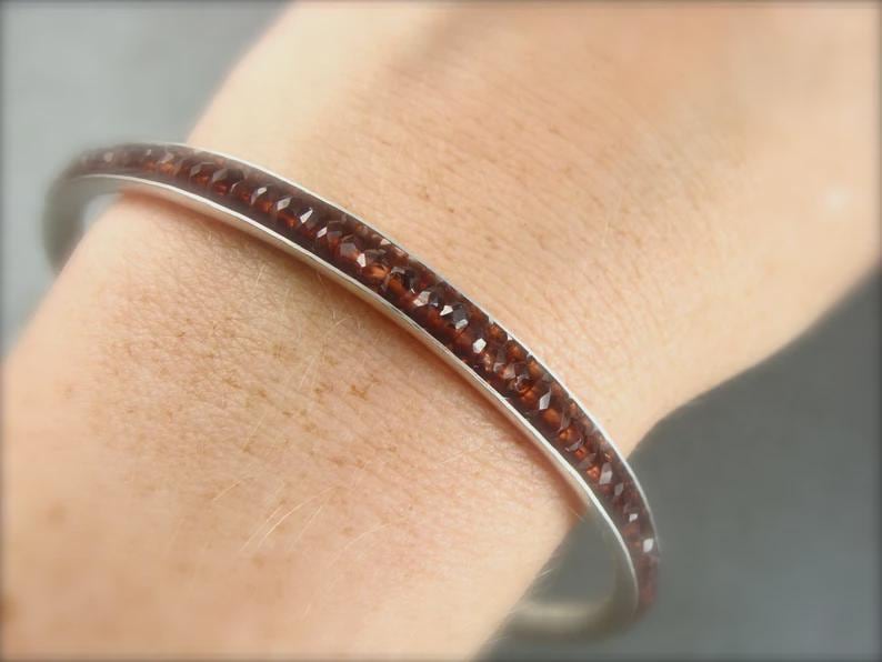 This handmade red garnet stacking ring features a channel-set row of deep red garnet gemstones on a solid sterling silver band. Garnet, the January birthstone, symbolizes passion, protection, and vitality, making this piece both meaningful and stylish.