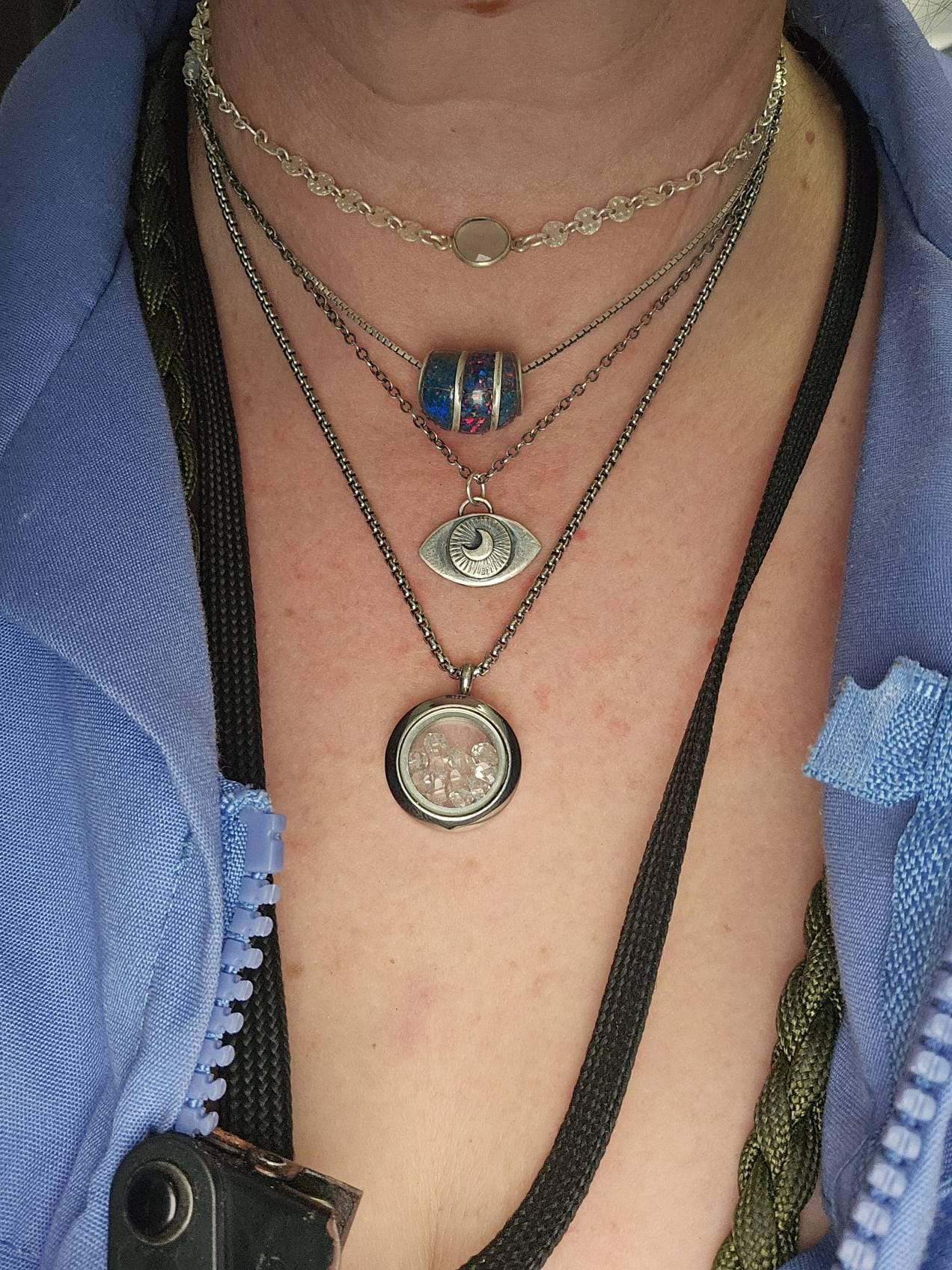 This charmingly petite little evil eye pendant is inspired by an ancient symbol used to ward off ill-will or jealousy from others. This solid 925 sterling silver pendant is hand-made and features a waxing moon in the center to symbolize the positive manifestation phase of the moon. Good vibes only with Love and light. A few moonstones have also been added to the chain. Perfect for layering!