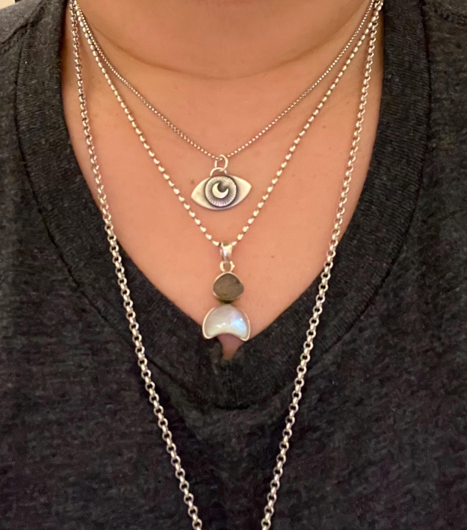 This charmingly petite little evil eye pendant is inspired by an ancient symbol used to ward off ill-will or jealousy from others. This solid 925 sterling silver pendant is hand-made and features a waxing moon in the center to symbolize the positive manifestation phase of the moon. Good vibes only with Love and light. A few moonstones have also been added to the chain. Perfect for layering!