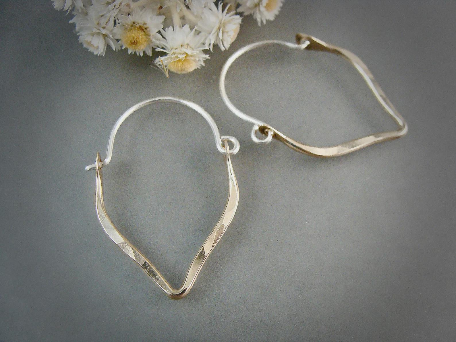 These handmade hammered sterling silver teardrop hoop earrings feature delicate 14k gold filled accents, combining a modern mixed-metal look with artisan craftsmanship. The teardrop shape is gracefully hand-forged and hammered, giving the earrings a subtle texture that catches the light beautifully.